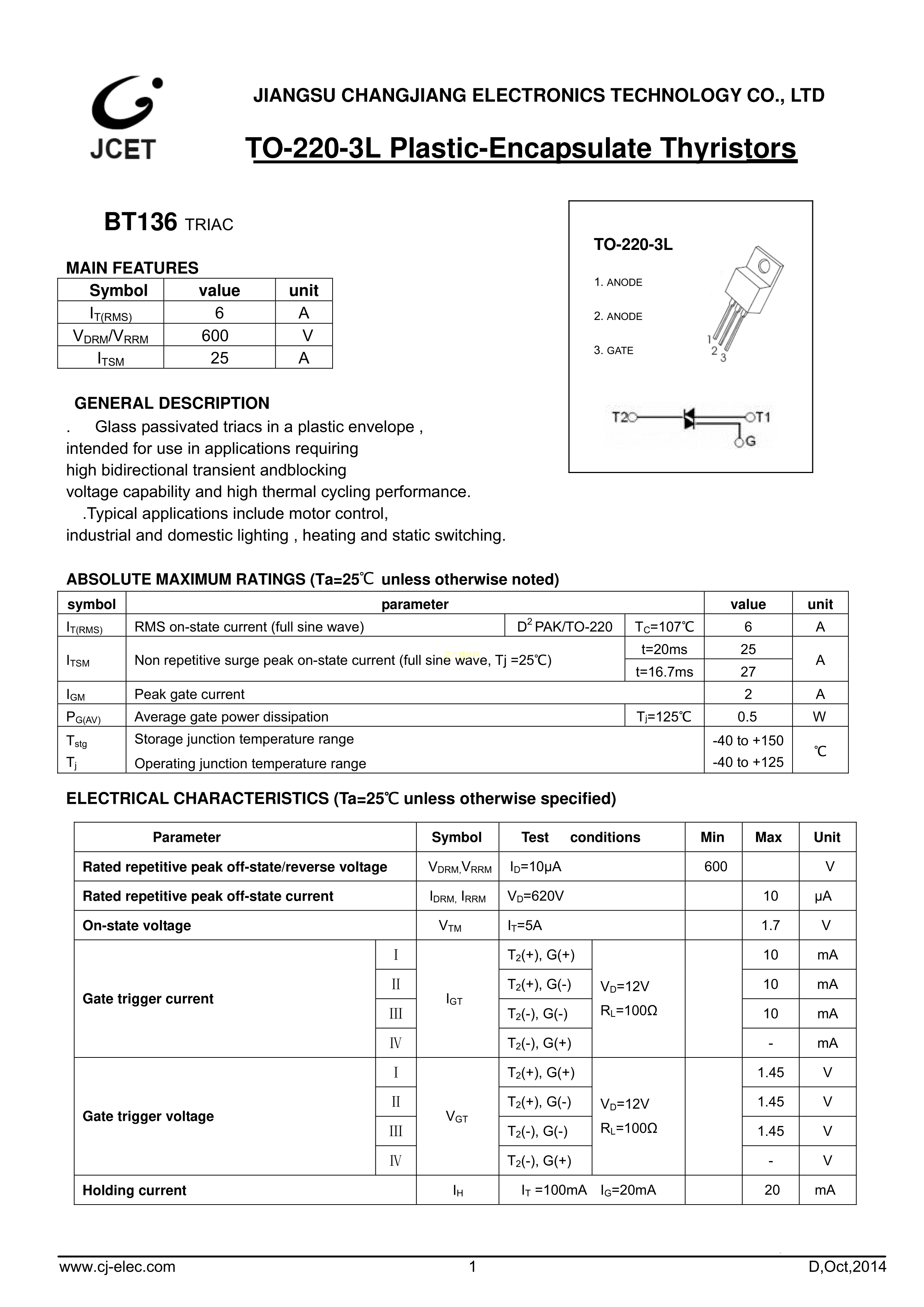 BT136数据手册TO-220(TO-220-3)封装CJ(江苏长电-长晶)PDF规格书,中英文下载