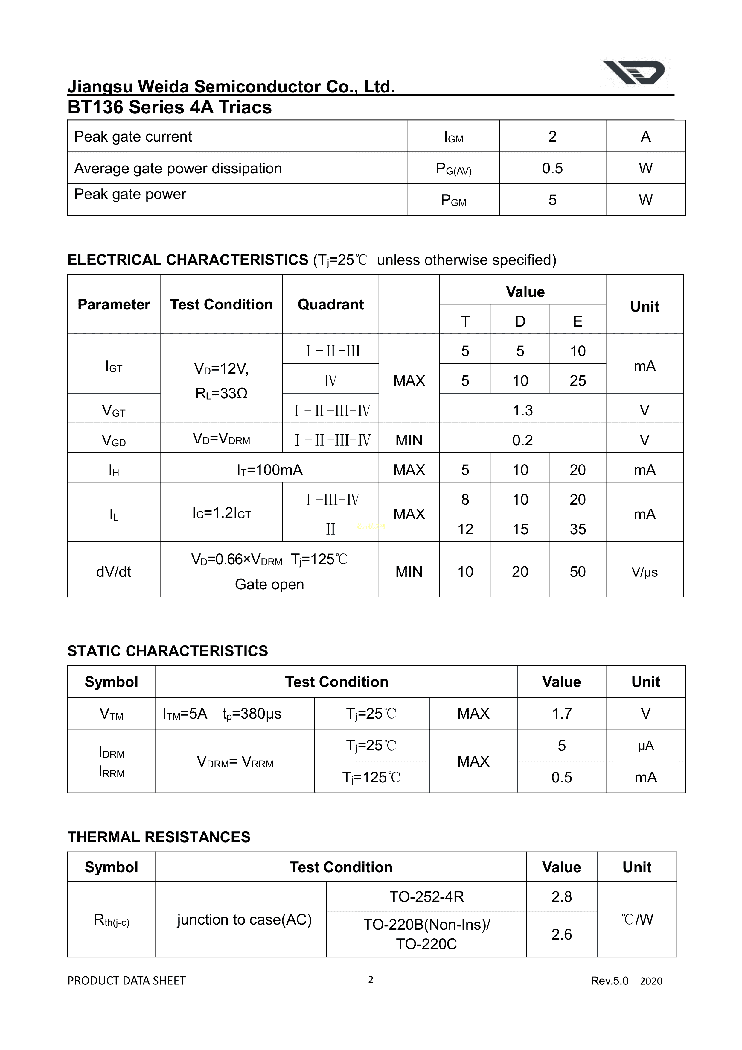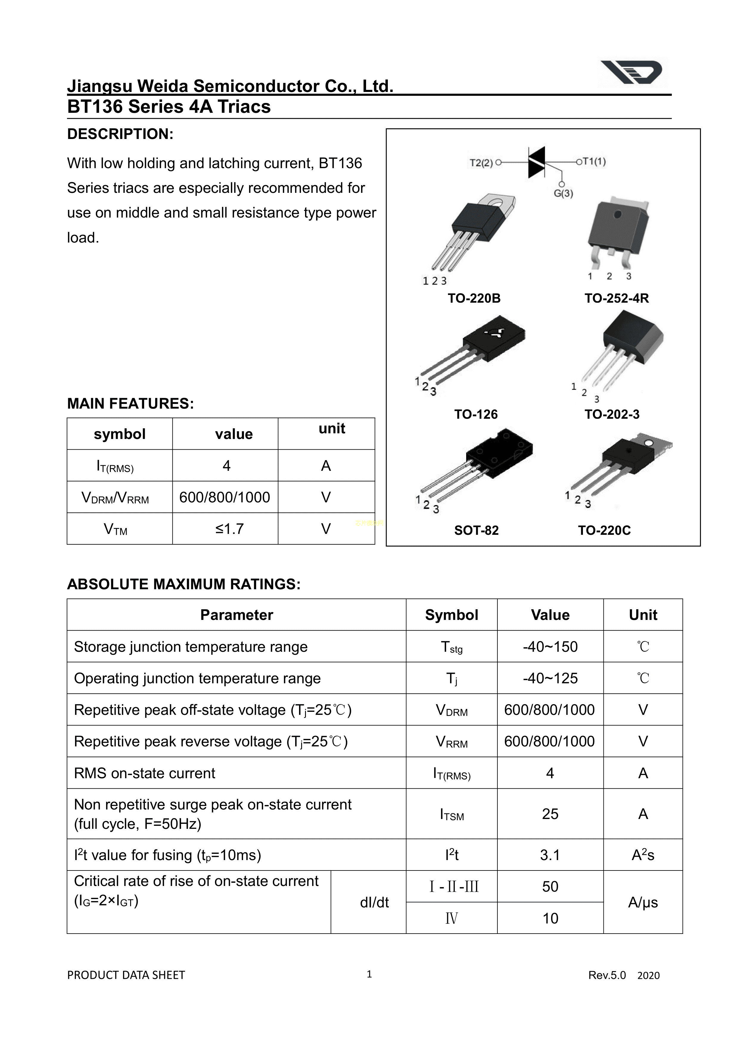 BT136-800E数据手册TO-252-4R封装WEIDA(韦达)PDF规格书,中英文下载