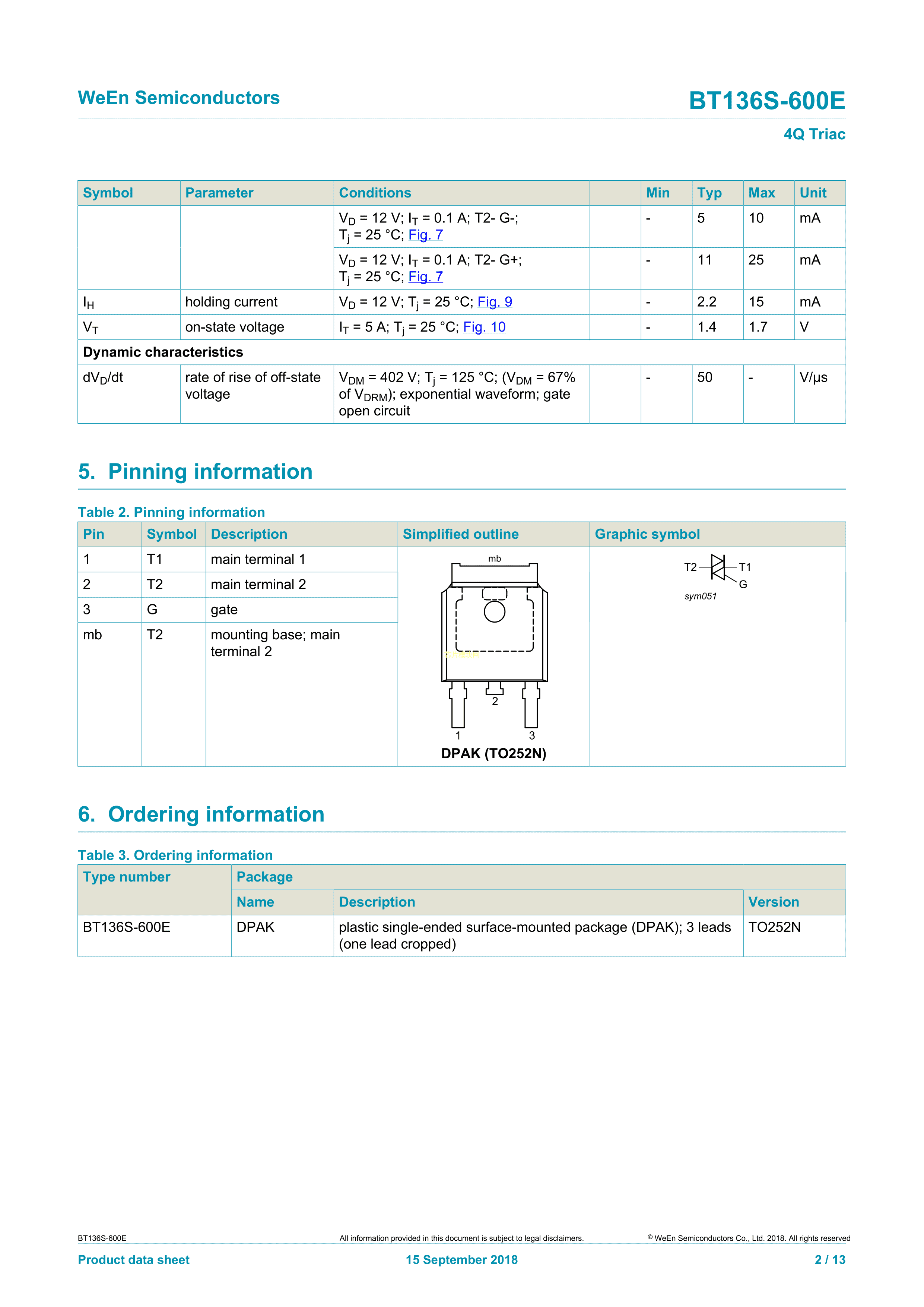 BT136S-600E118数据手册DPAK封装WeEn(瑞能)PDF规格书,中英文下载