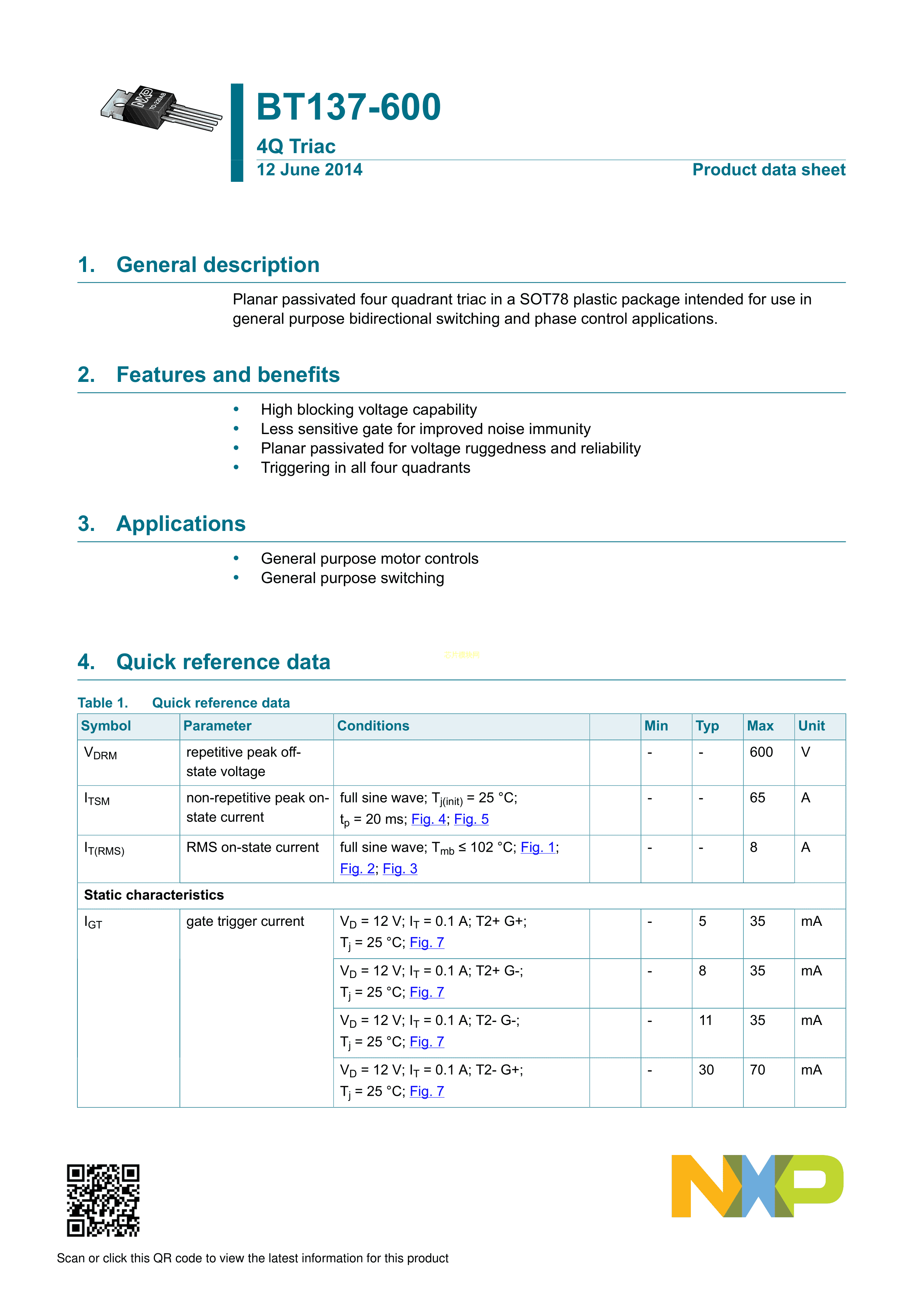 BT137-600127数据手册TO-220-3封装WeEn(瑞能)PDF规格书,中英文下载