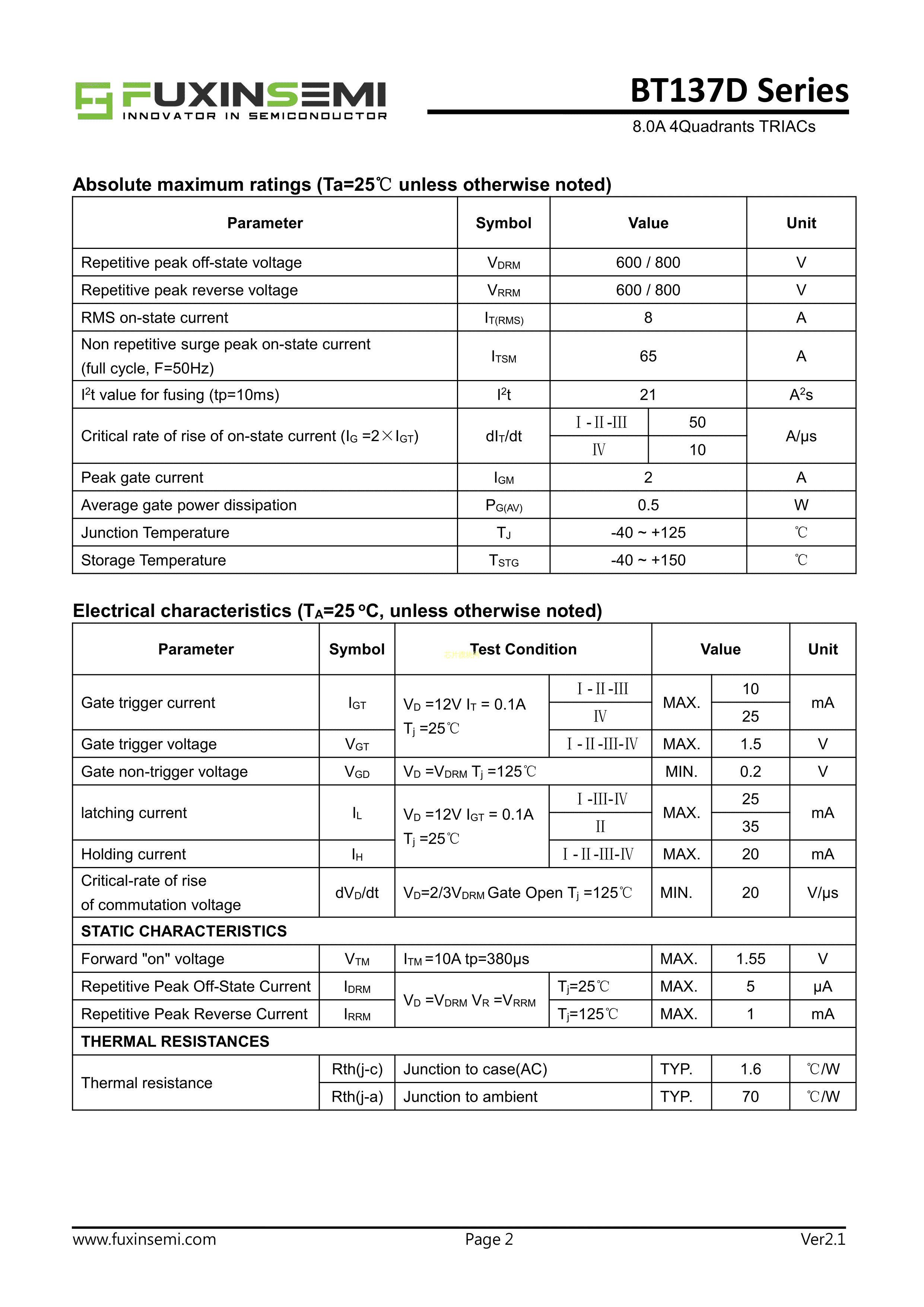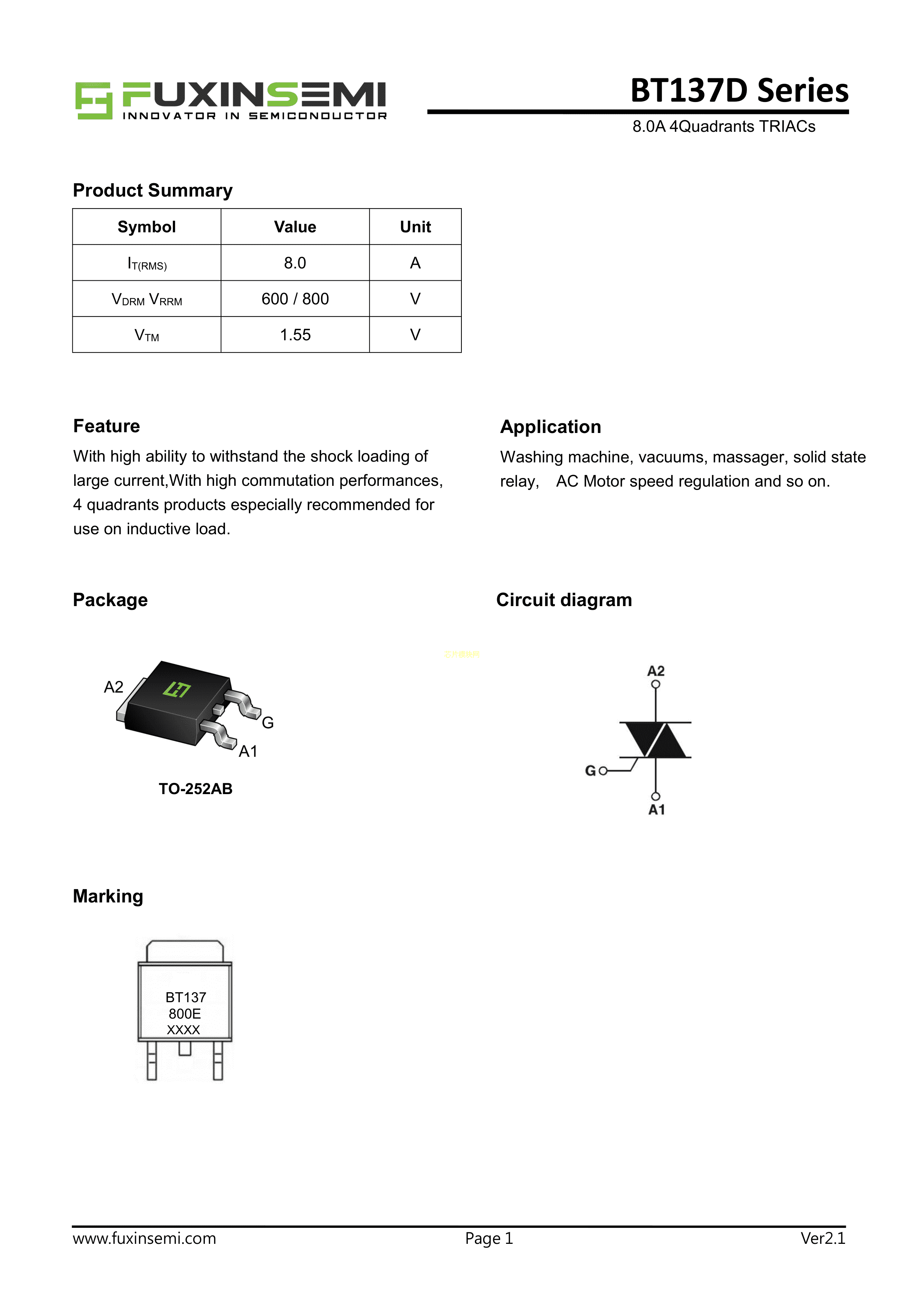 BT137D-800E数据手册TO-252AB(DPAK)封装FUXINSEMI(富芯森美)PDF规