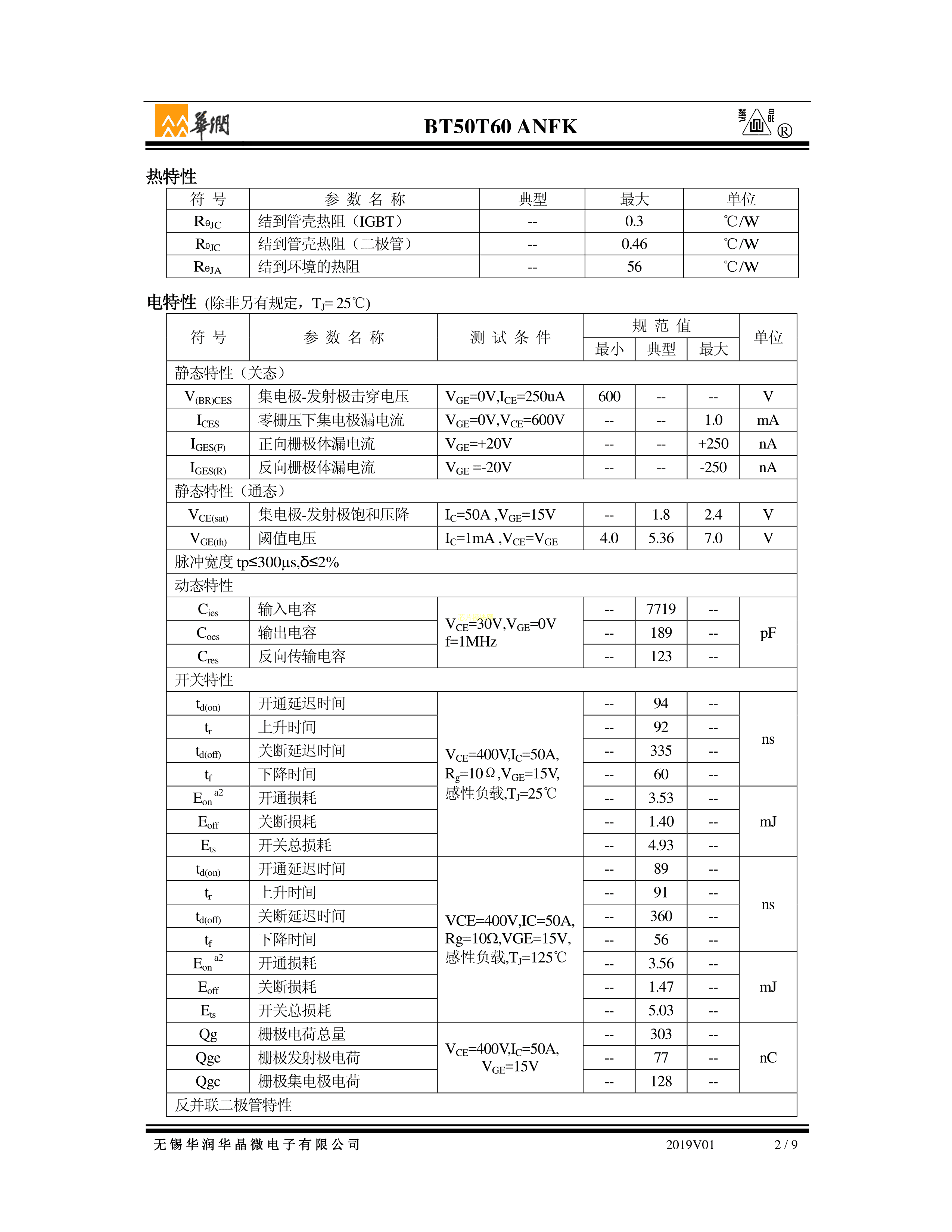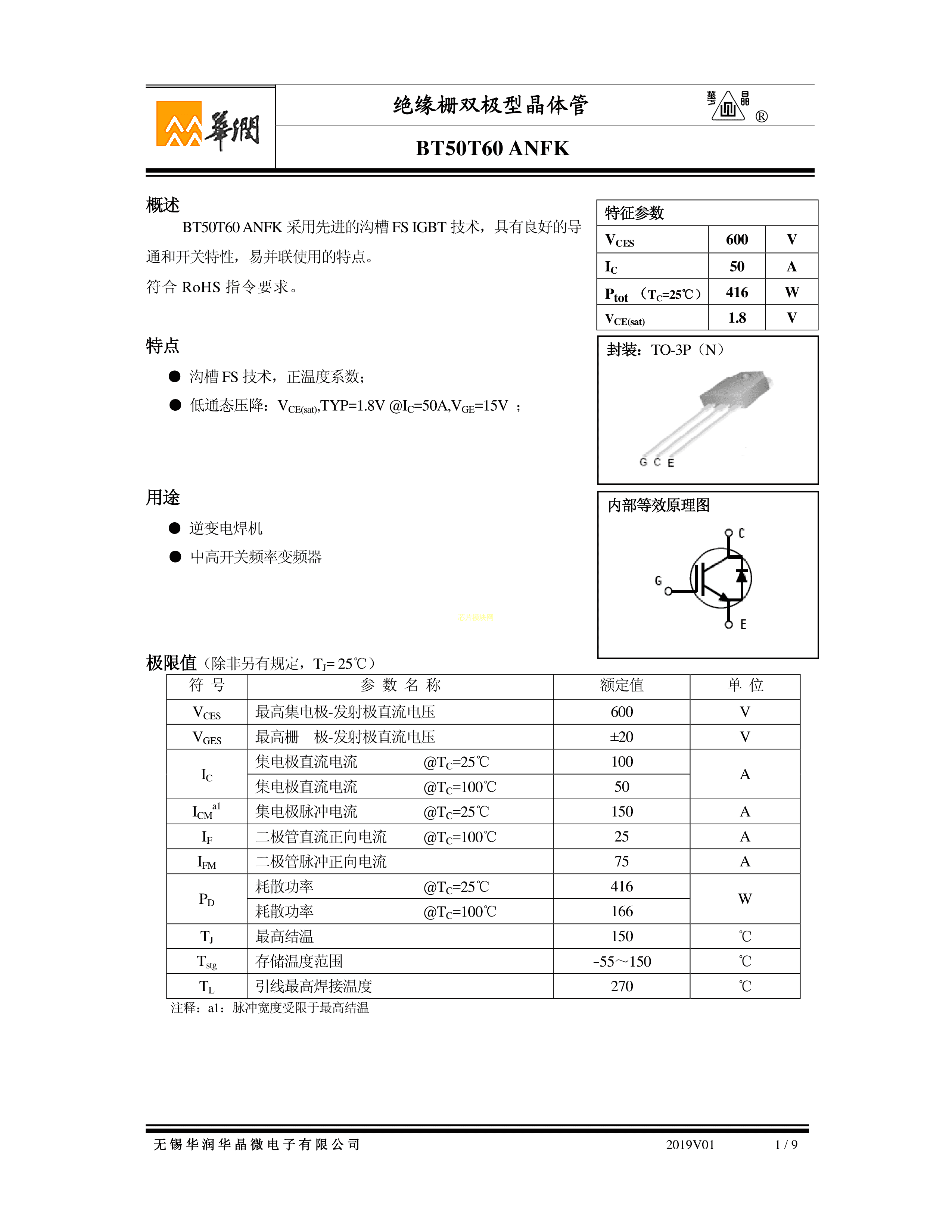 BT50T60ANFK数据手册TO-3P封装华润华晶PDF规格书,中英文下载