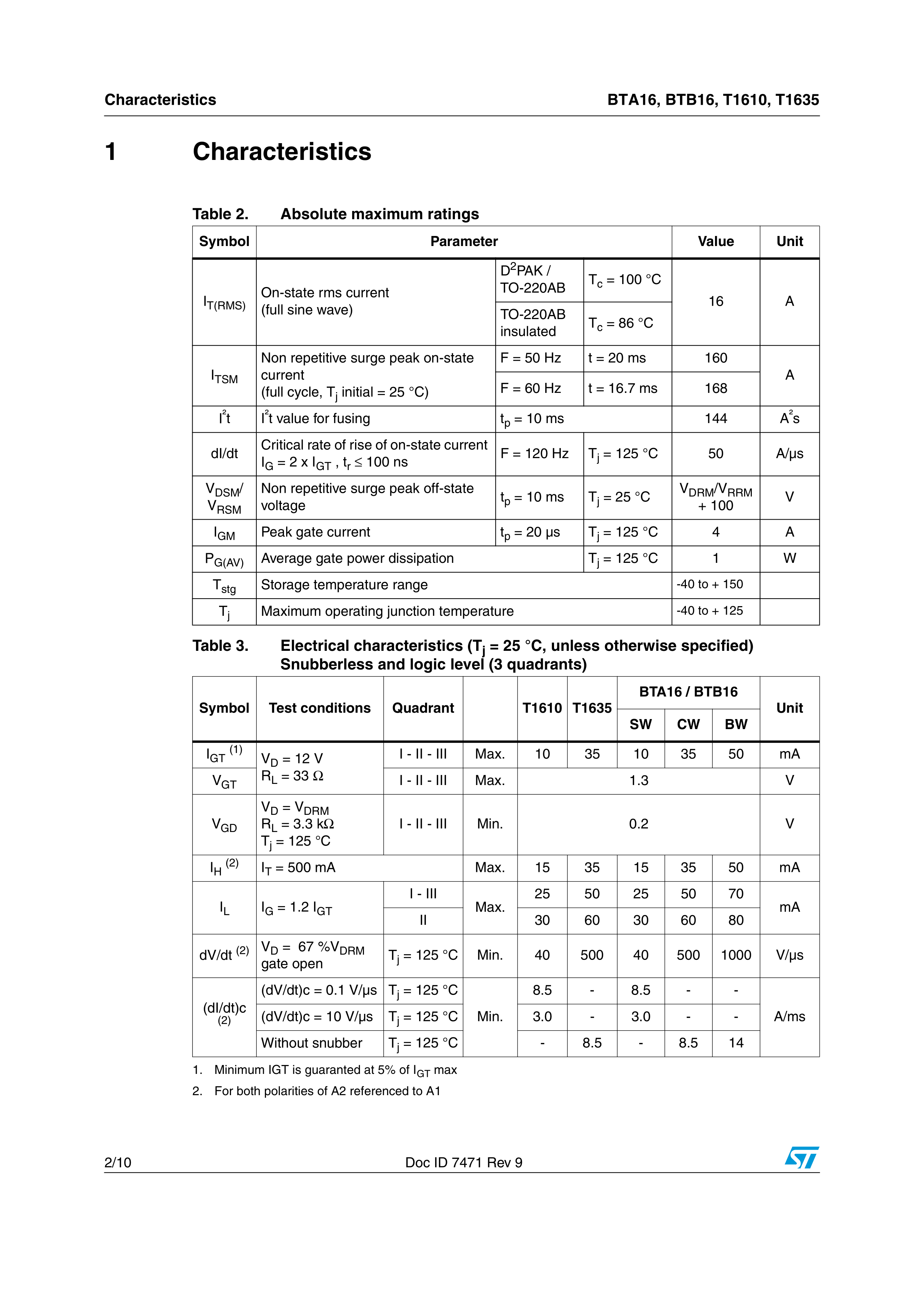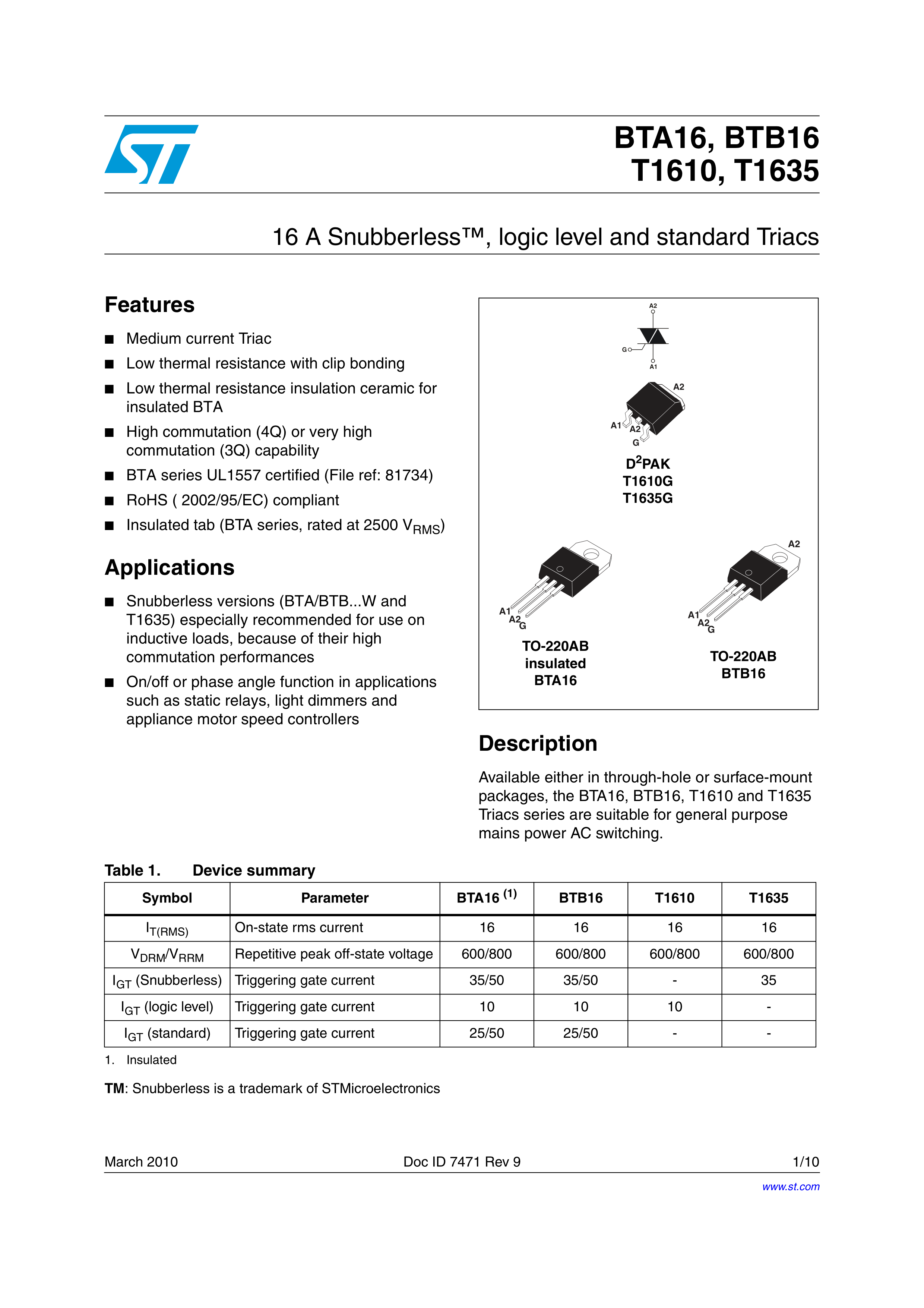 BTA16-600CRG数据手册TO-220(TO-220-3)封装ST(意法半导体)PDF规格书,
