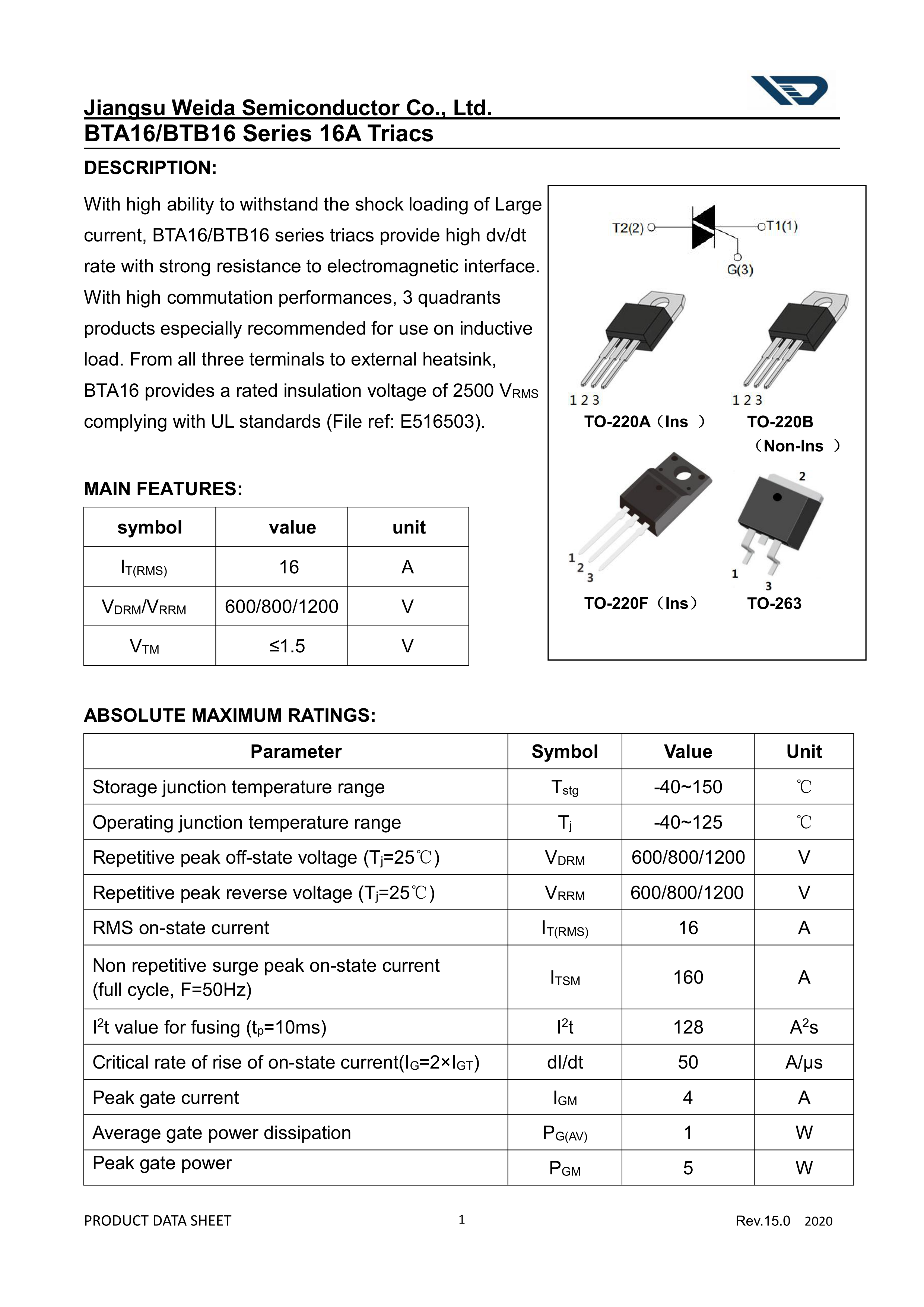 BTA16-600CW数据手册TO-220A封装WEIDA(韦达)PDF规格书,中英文下载