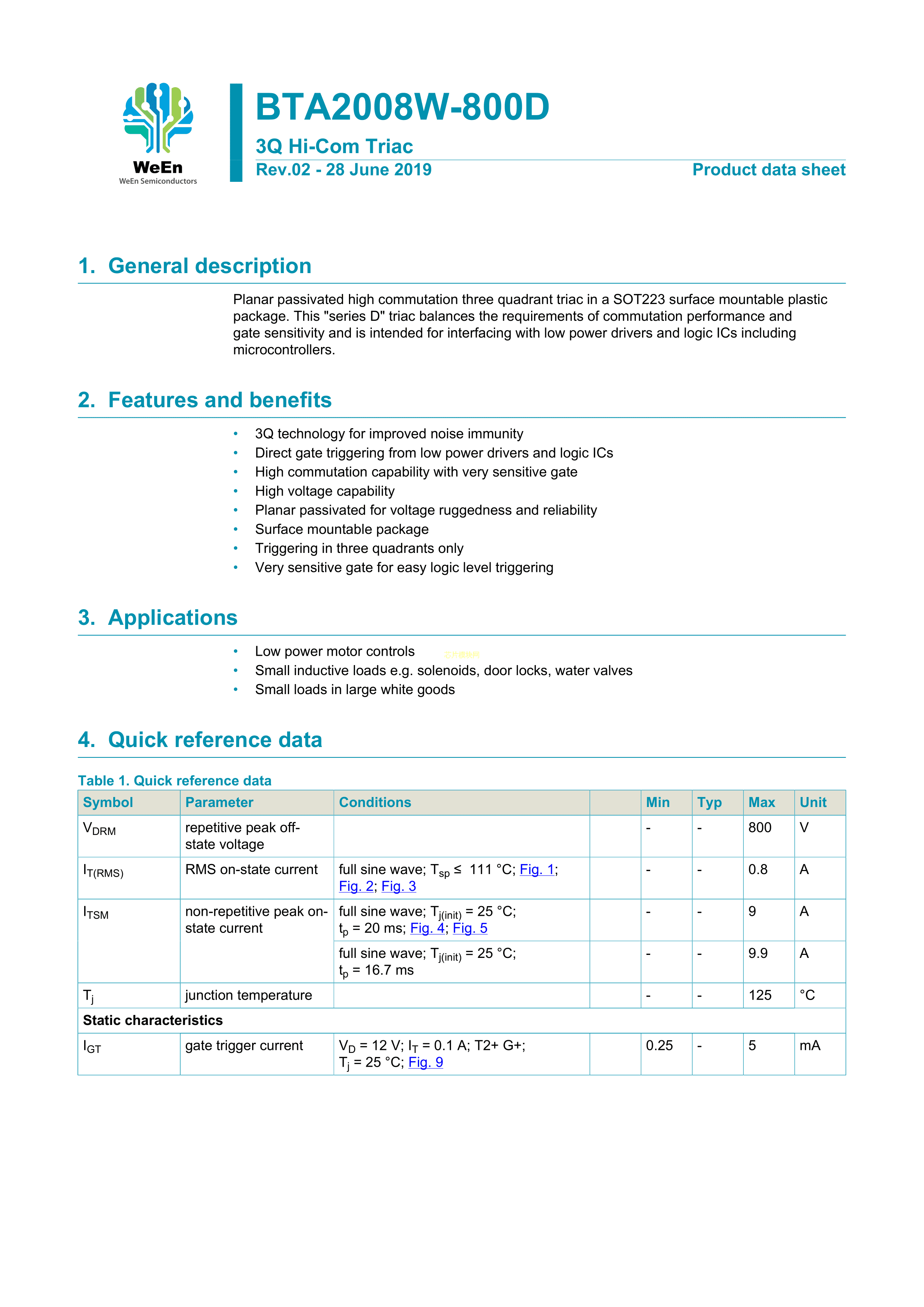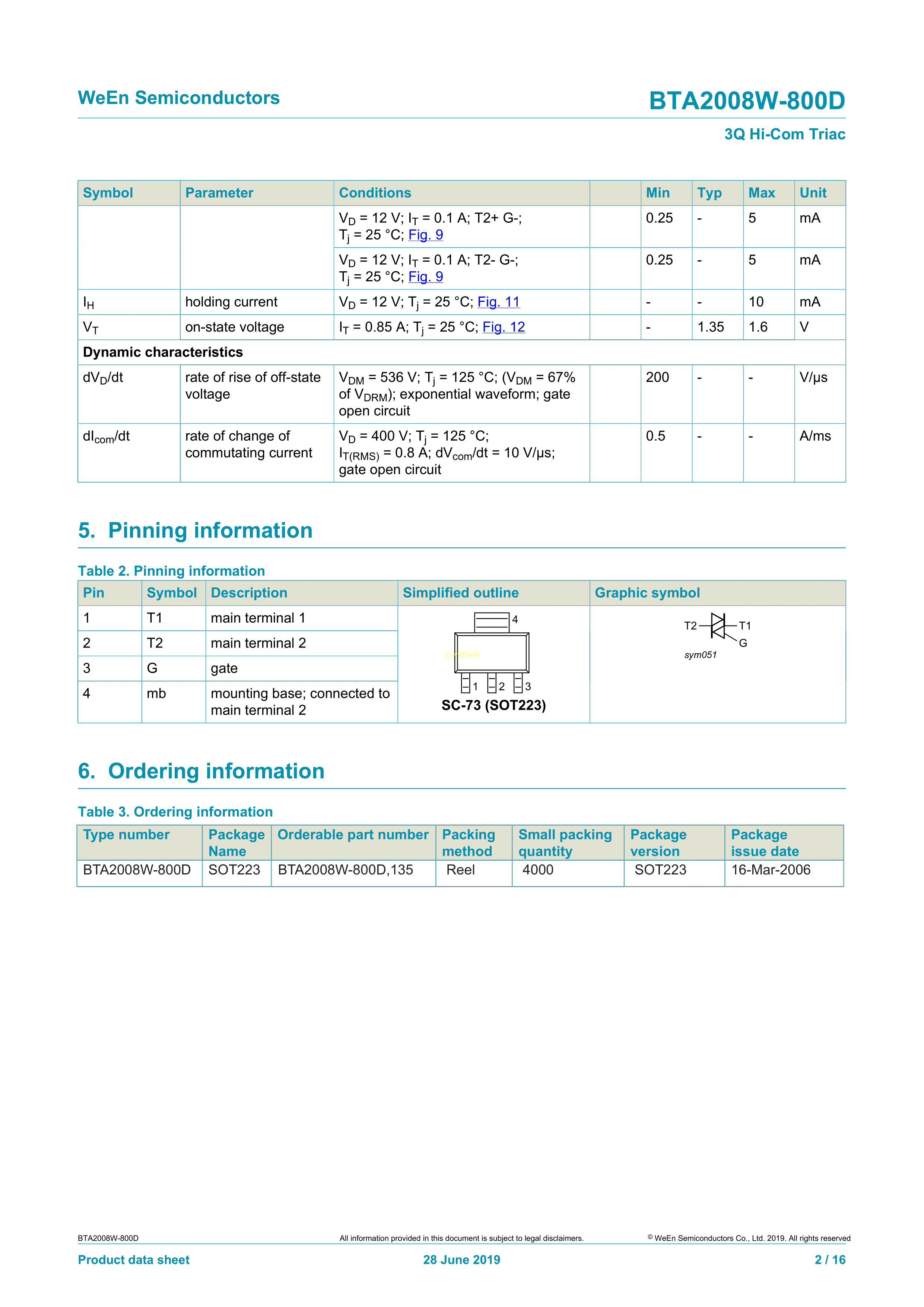 BTA2008W-800D135数据手册SOT-223封装WeEn(瑞能)PDF规格书,中英文下载