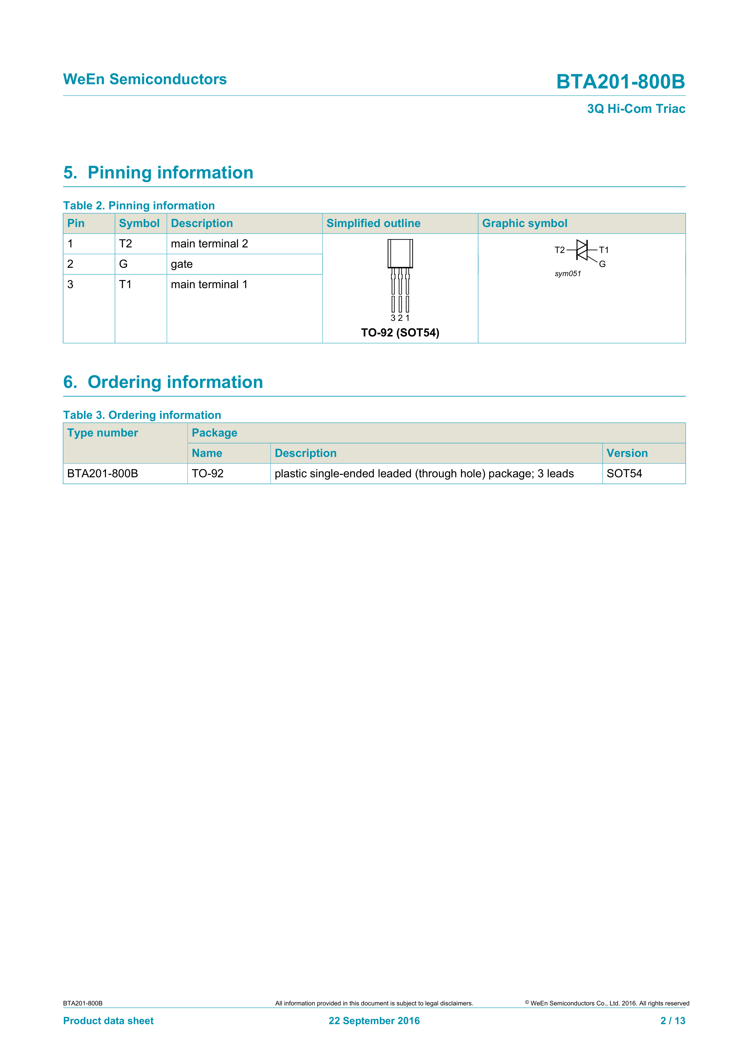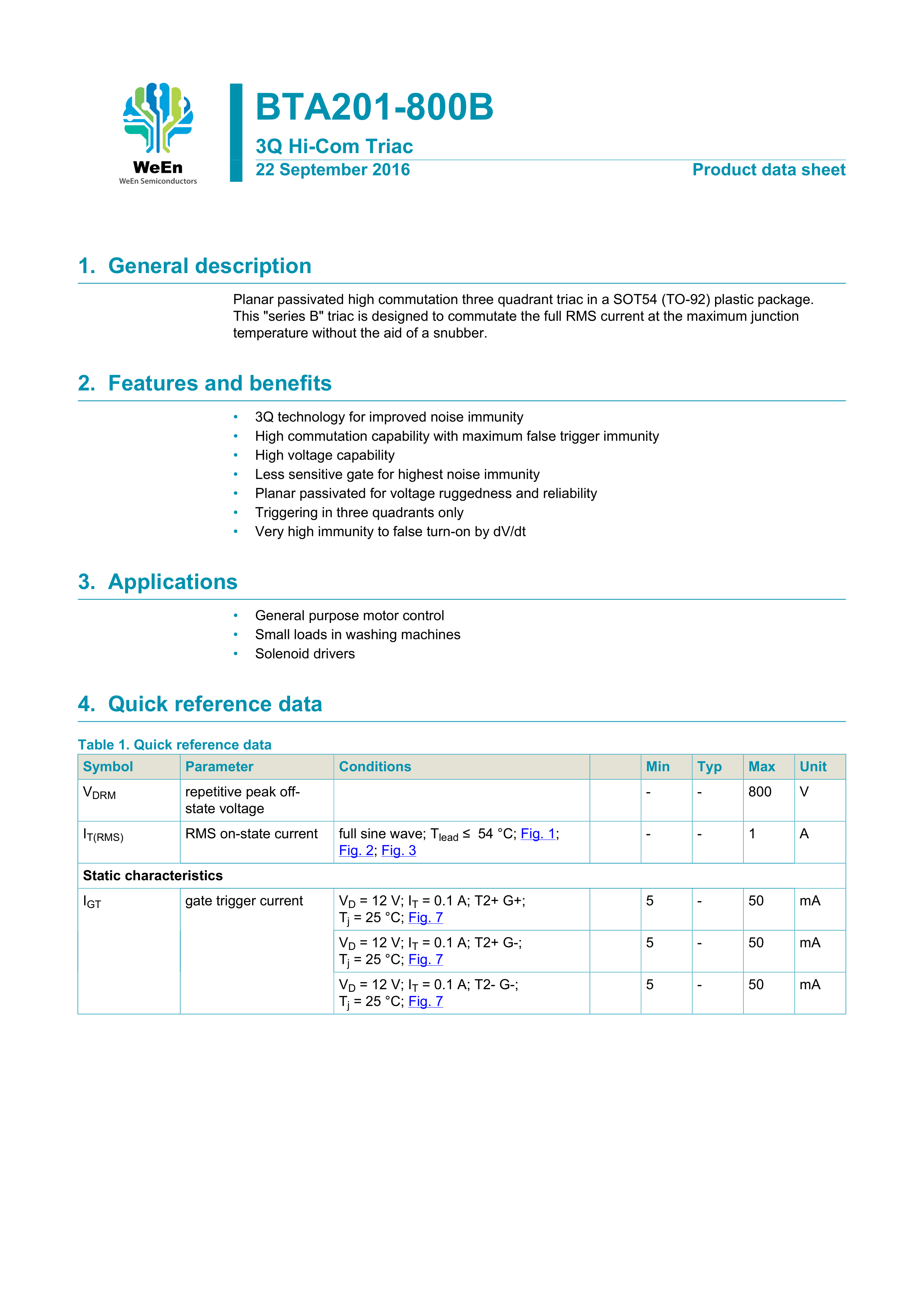 BTA201-800B112数据手册SOT-54封装WeEn(瑞能)PDF规格书,中英文下载