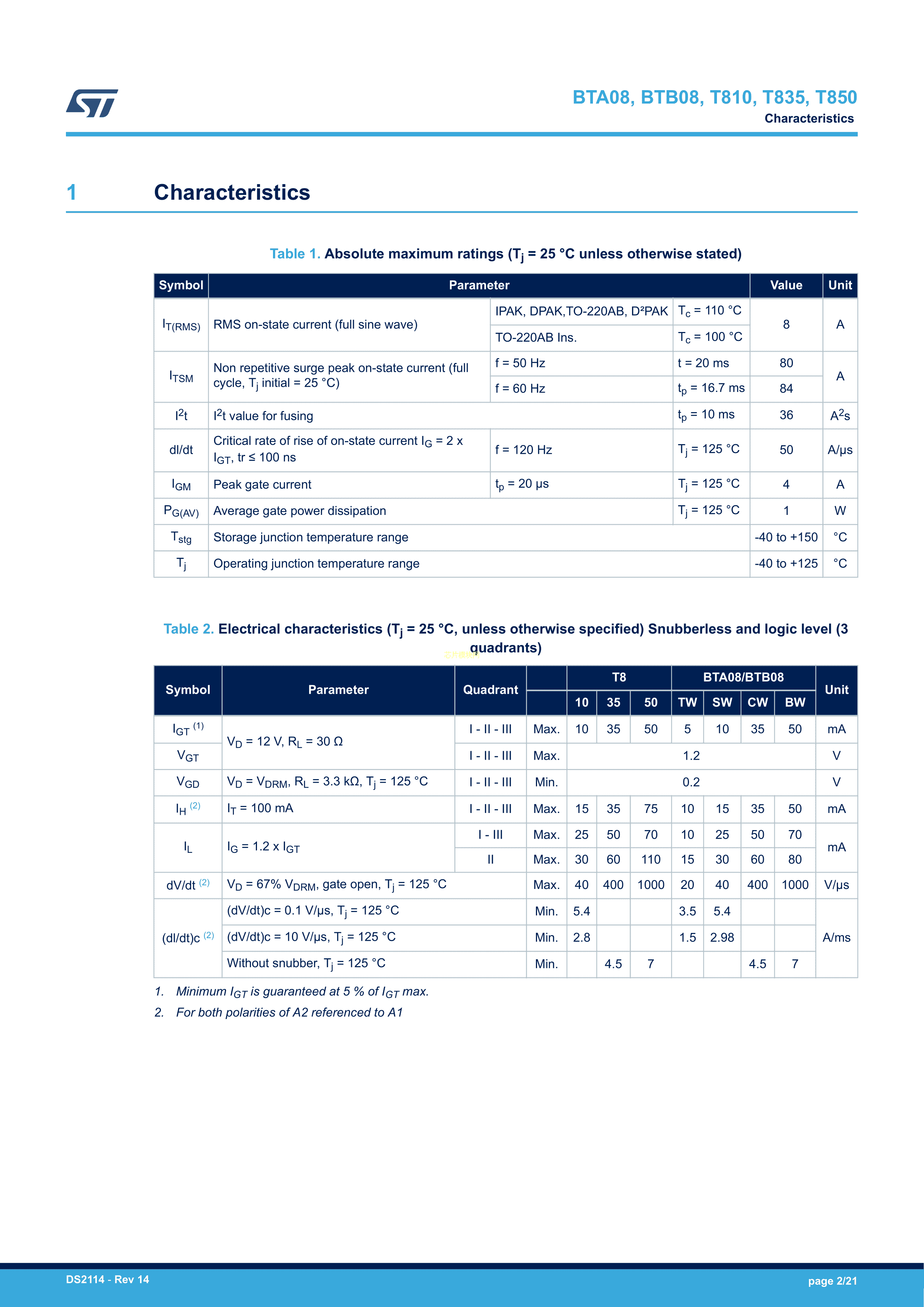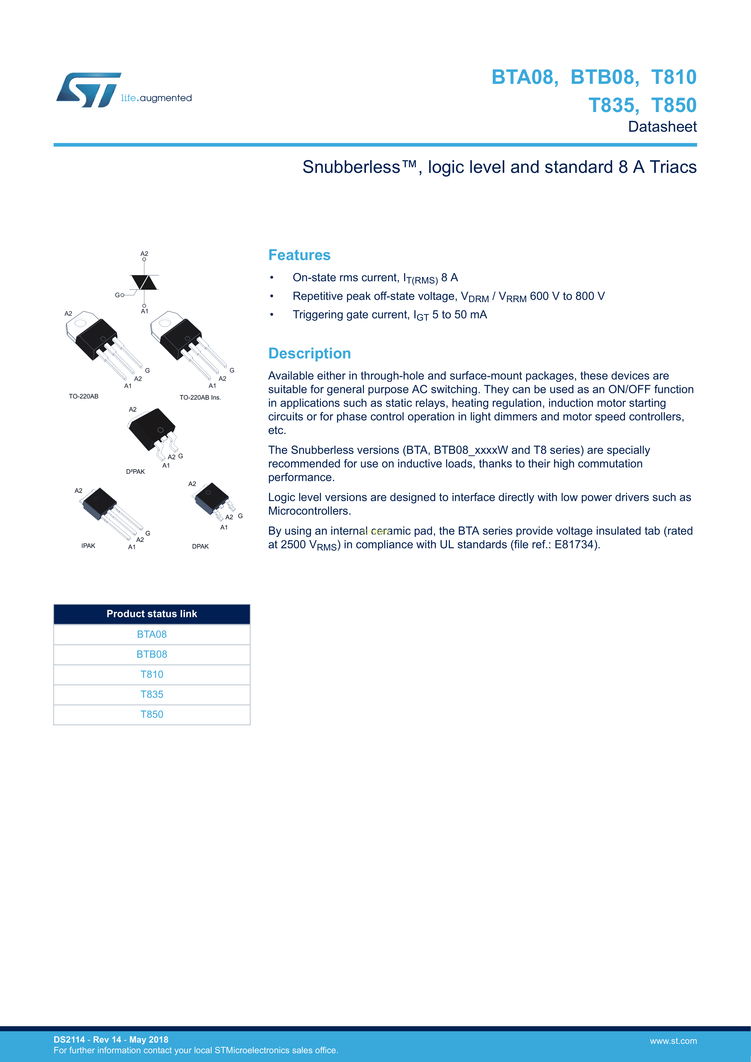 BTB08-600BWRG数据手册TO-220AB封装ST(意法半导体)PDF规格书,中英文下载