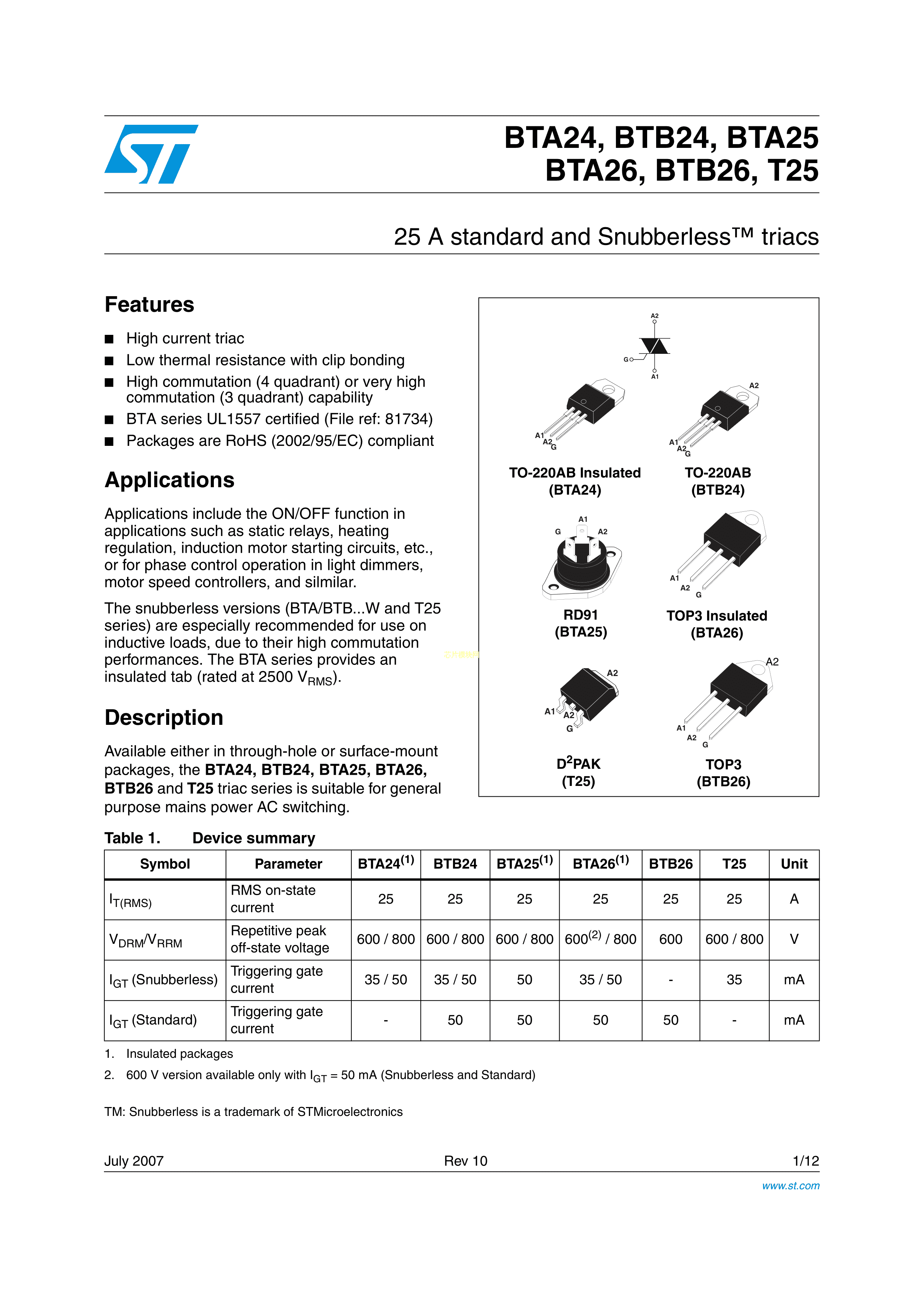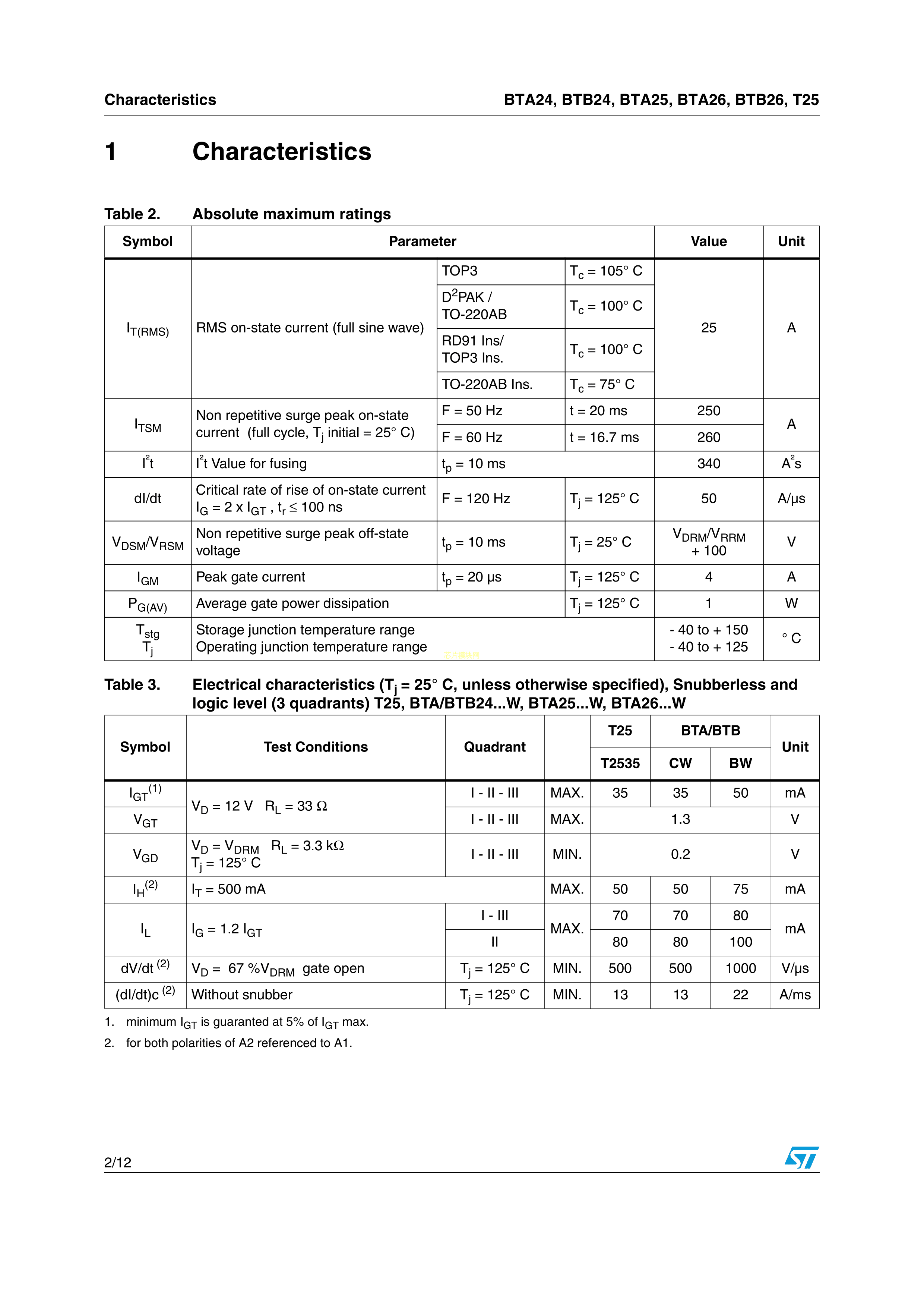 BTB24-800CWRG数据手册TO-220AB封装ST(意法半导体)PDF规格书,中英文下载