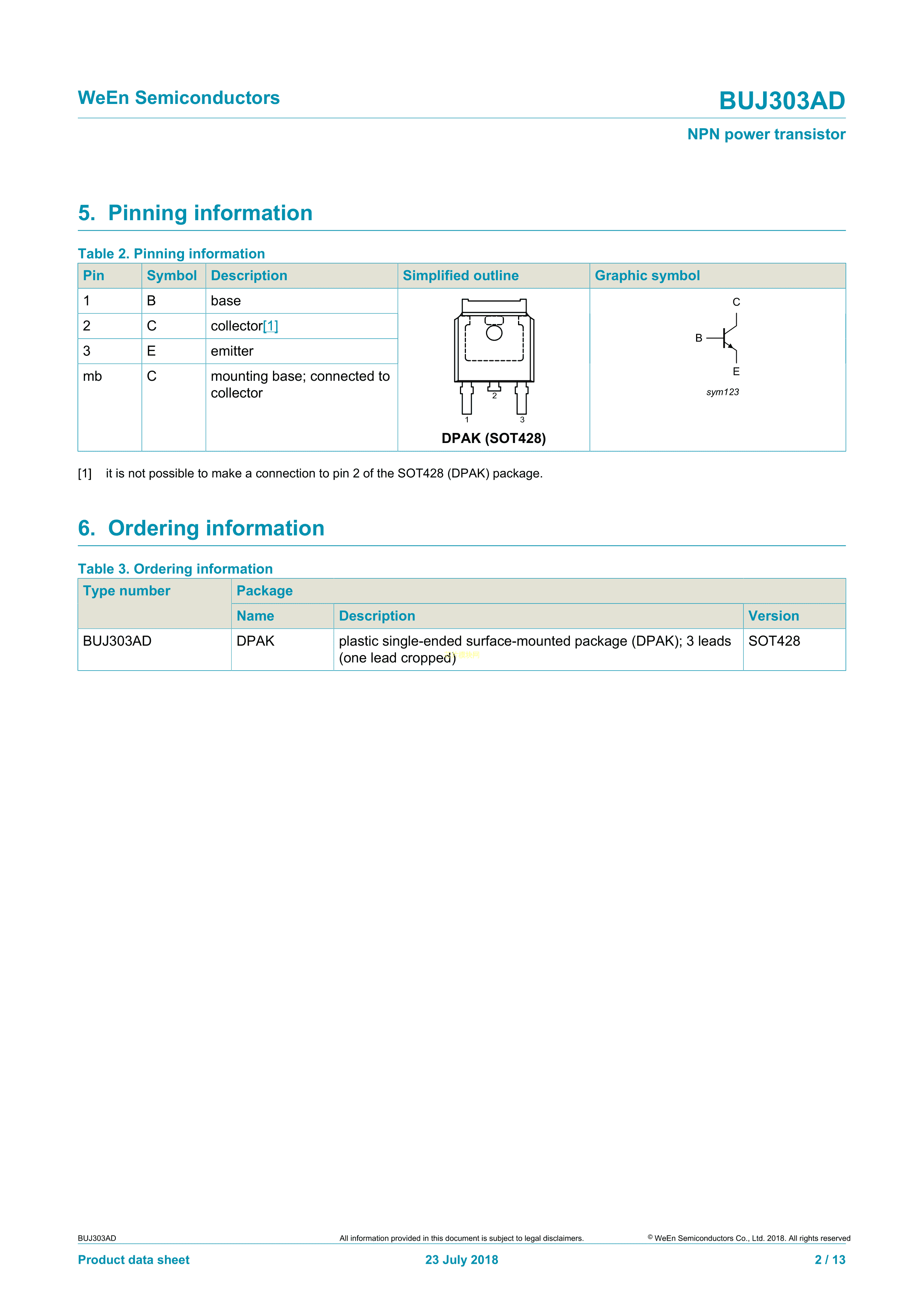 BUJ303AD118数据手册SOT-428封装WeEn(瑞能)PDF规格书,中英文下载