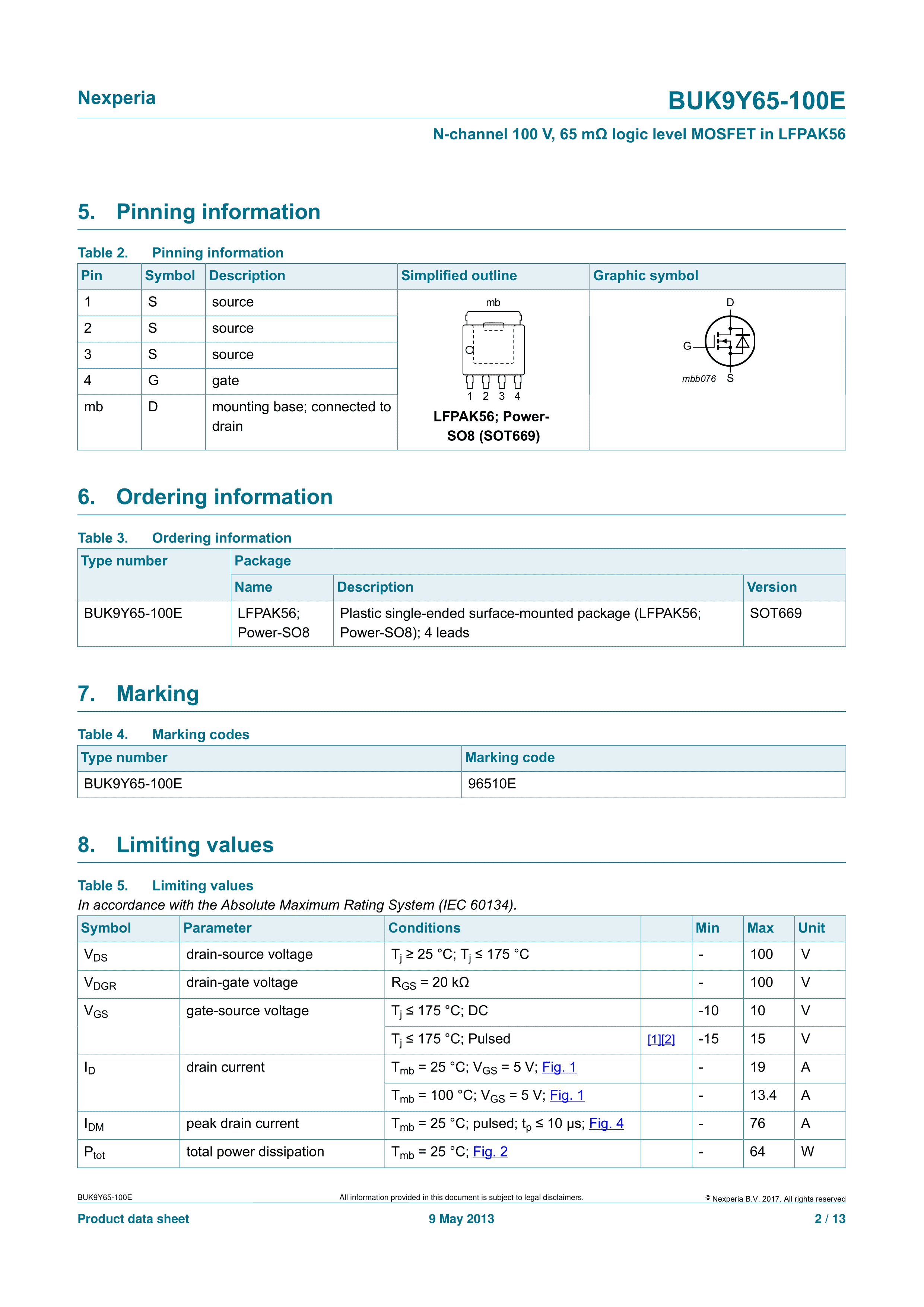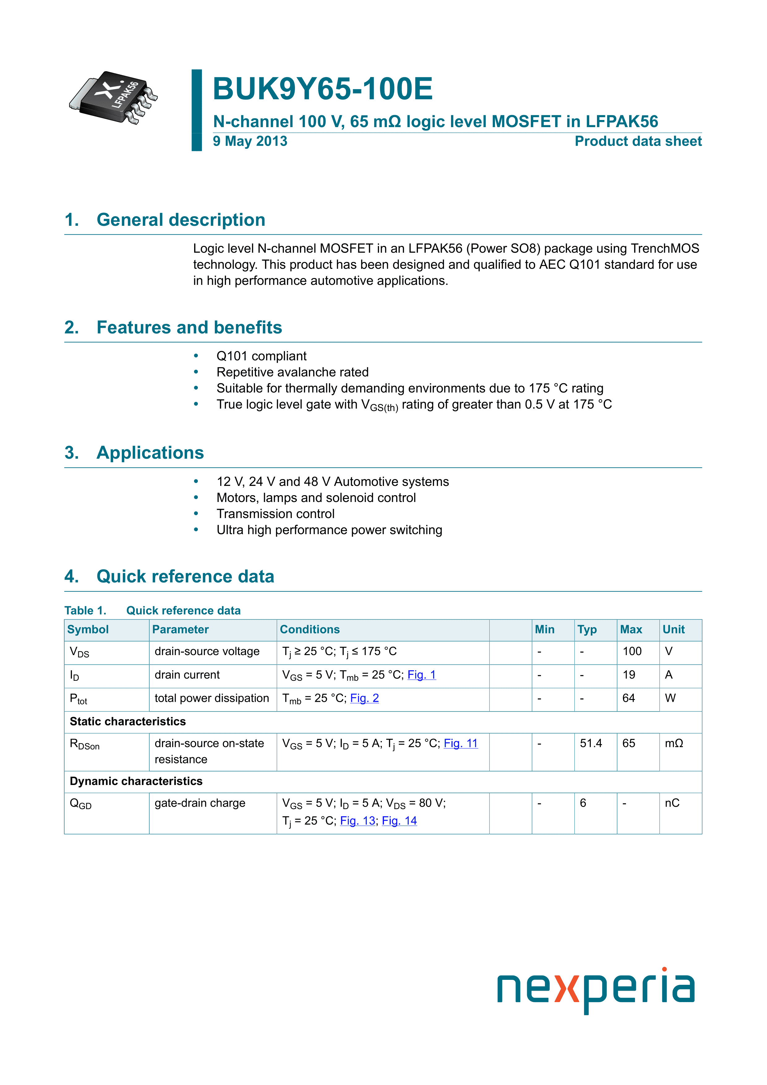 BUK9Y65-100E115数据手册SOT-669封装Nexperia(安世)PDF规格书,中英文
