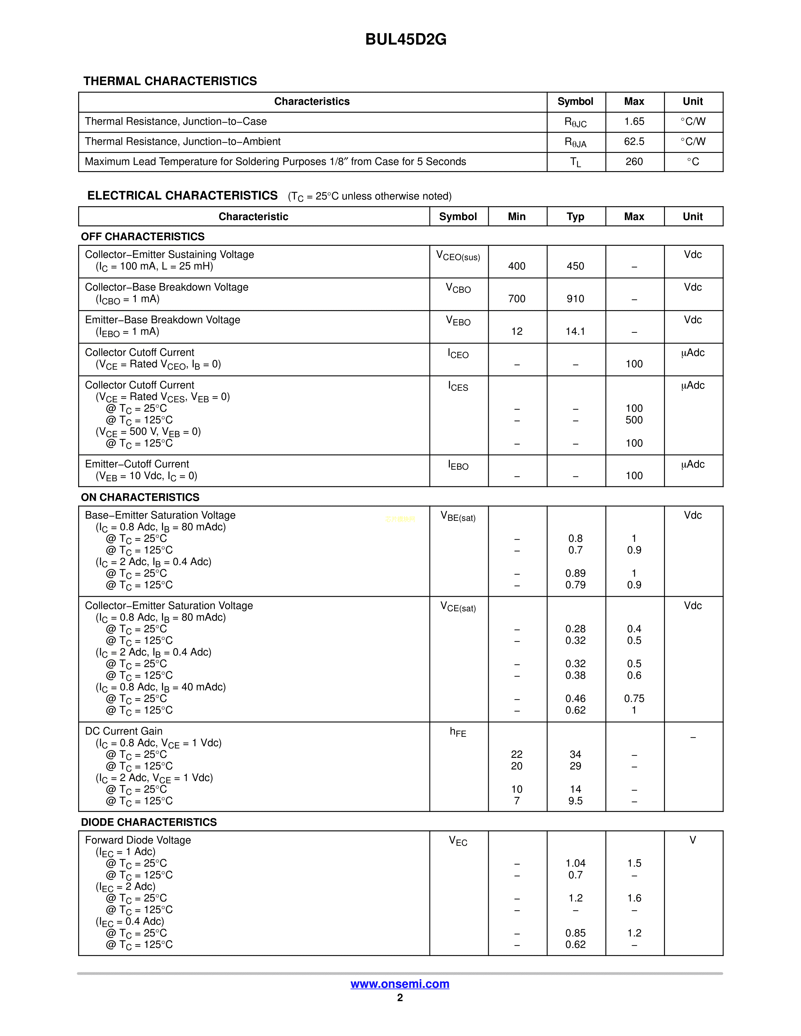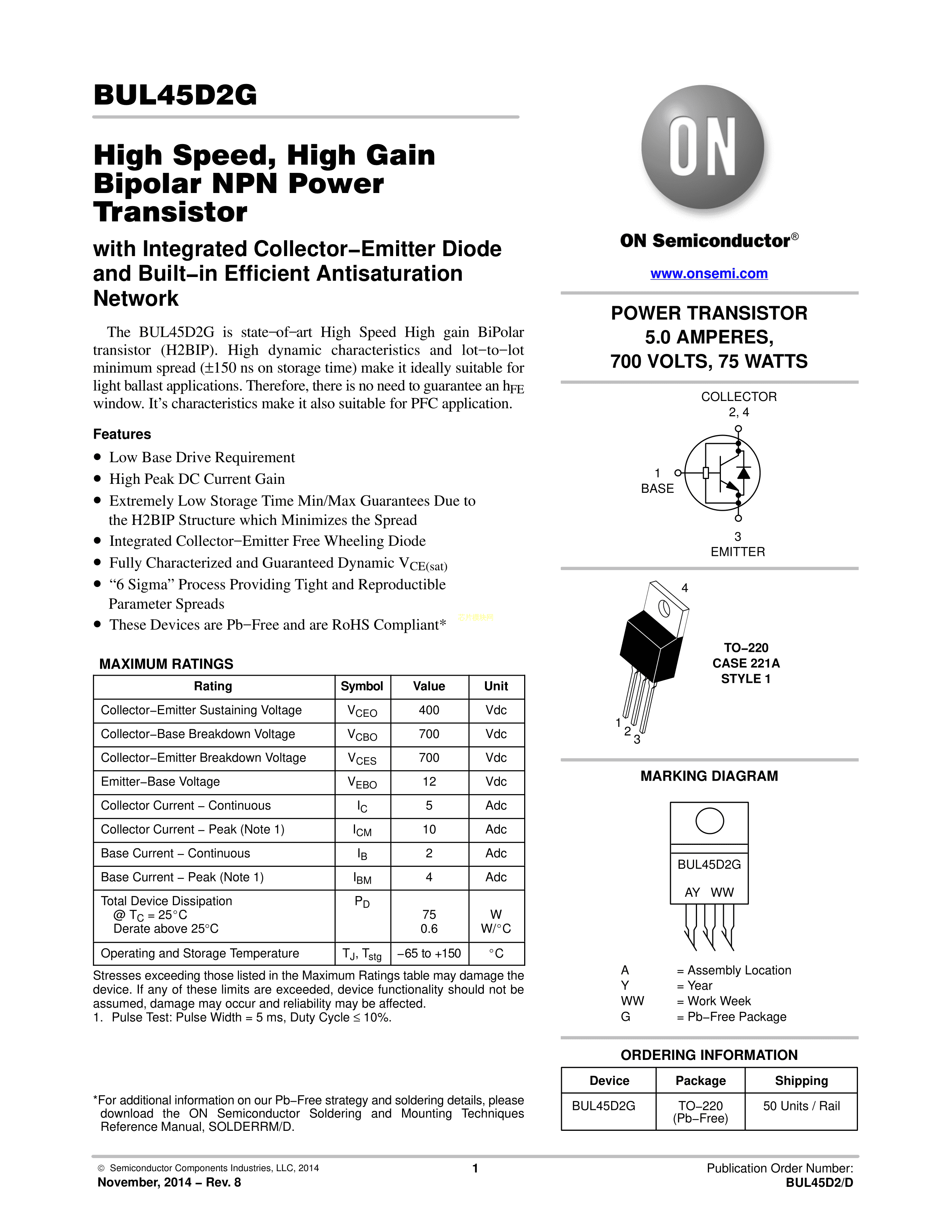 BUL45D2G数据手册TO-220封装onsemi(安森美)PDF规格书,中英文下载