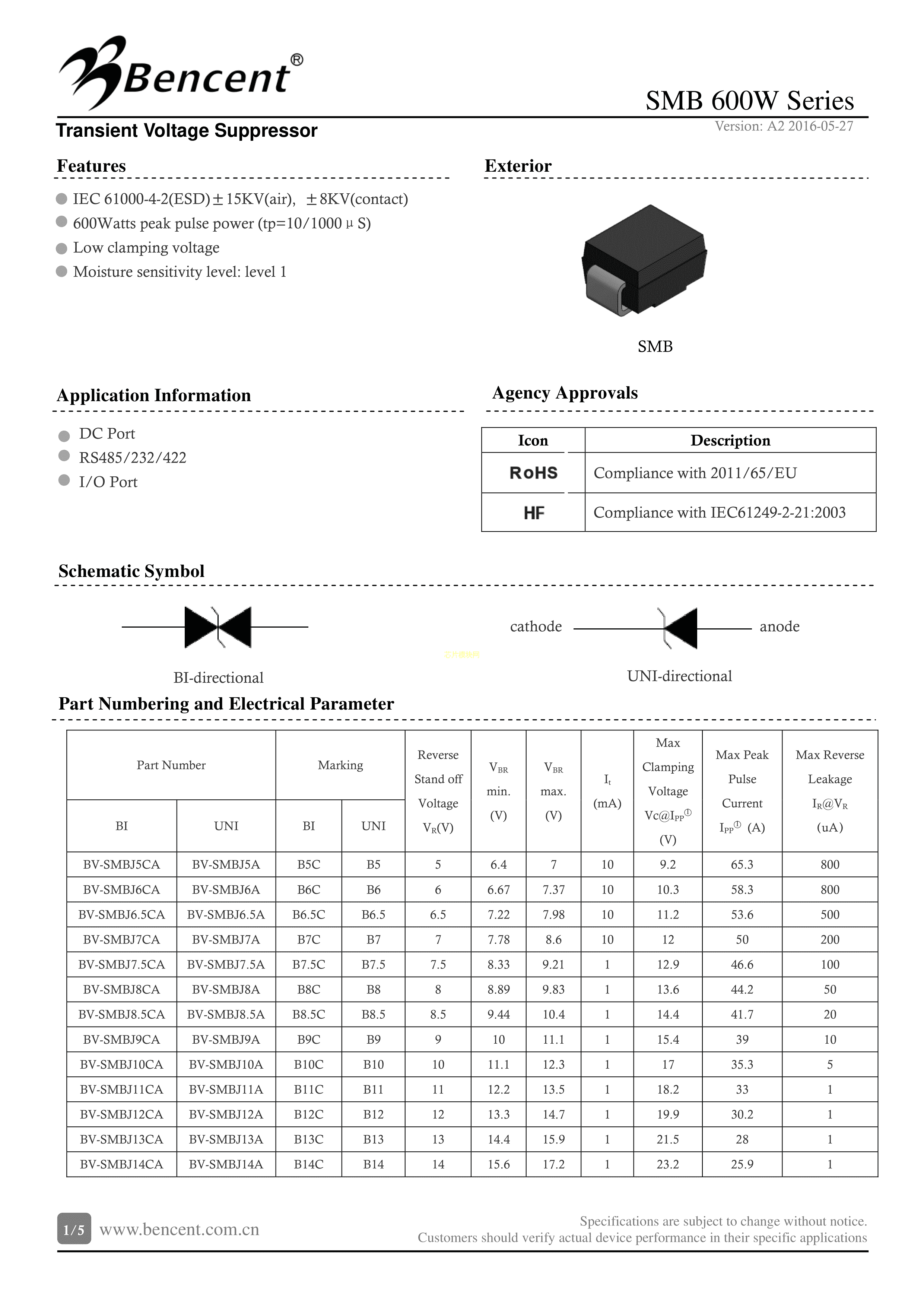 BV-SMBJ24CA数据手册SMB封装Bencent(槟城)PDF规格书,中英文下载
