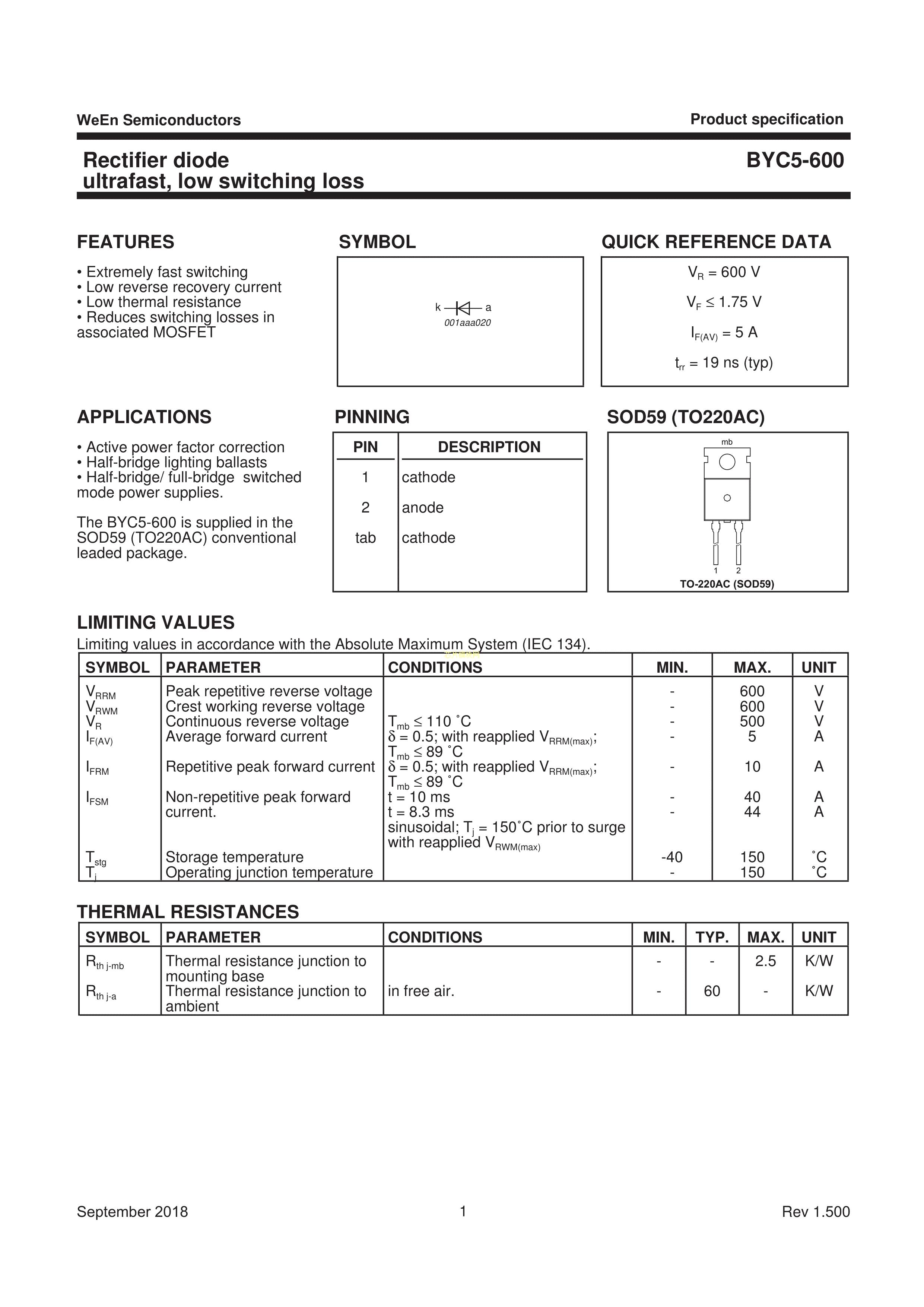 BYC5-600127数据手册SOD-59封装WeEn(瑞能)PDF规格书,中英文下载