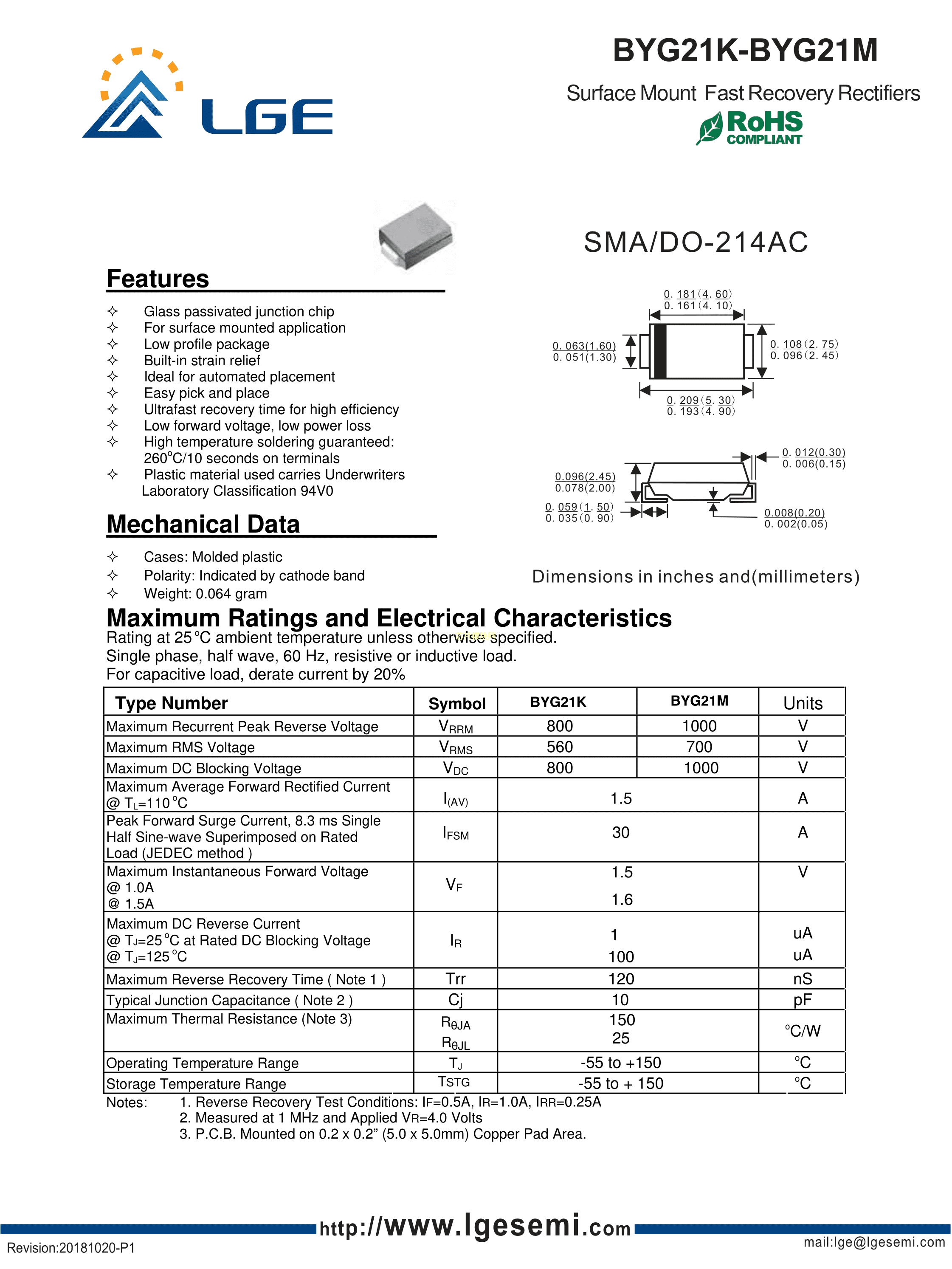 BYG21M数据手册SMA封装LGE(鲁光)PDF规格书,中英文下载