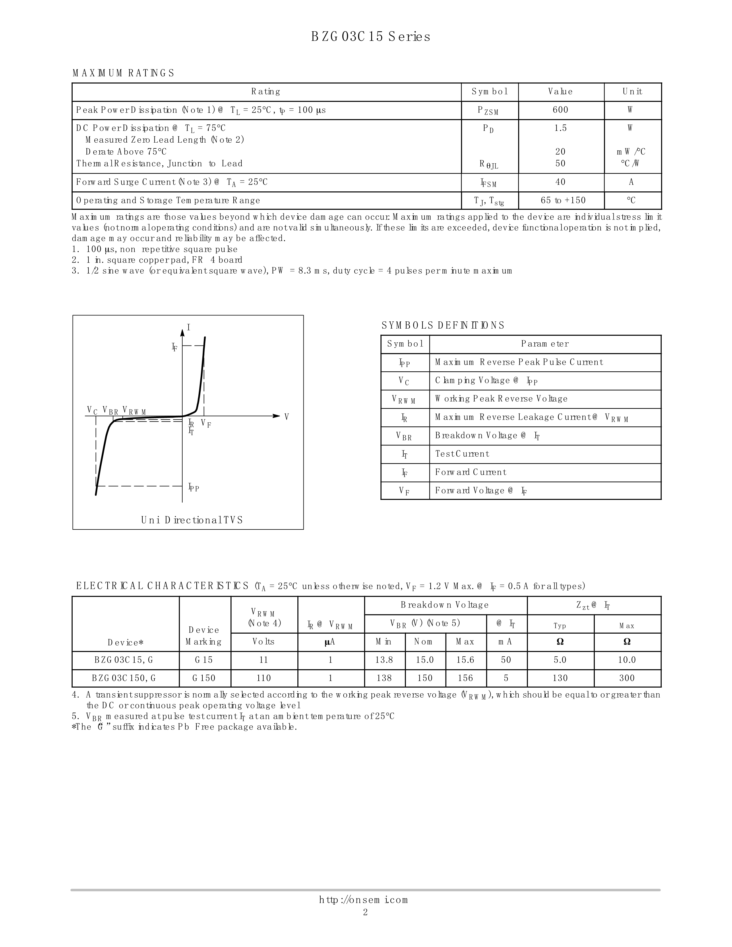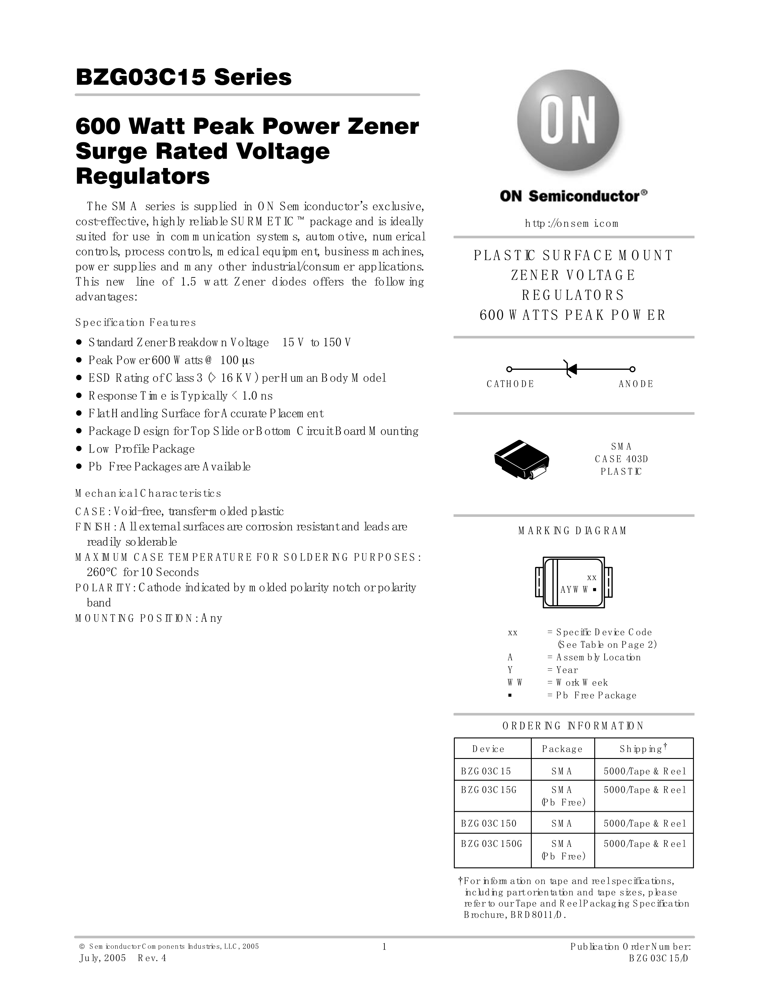 BZG03C15G数据手册SMA(DO-214AC)封装onsemi(安森美)PDF规格书,中英文下