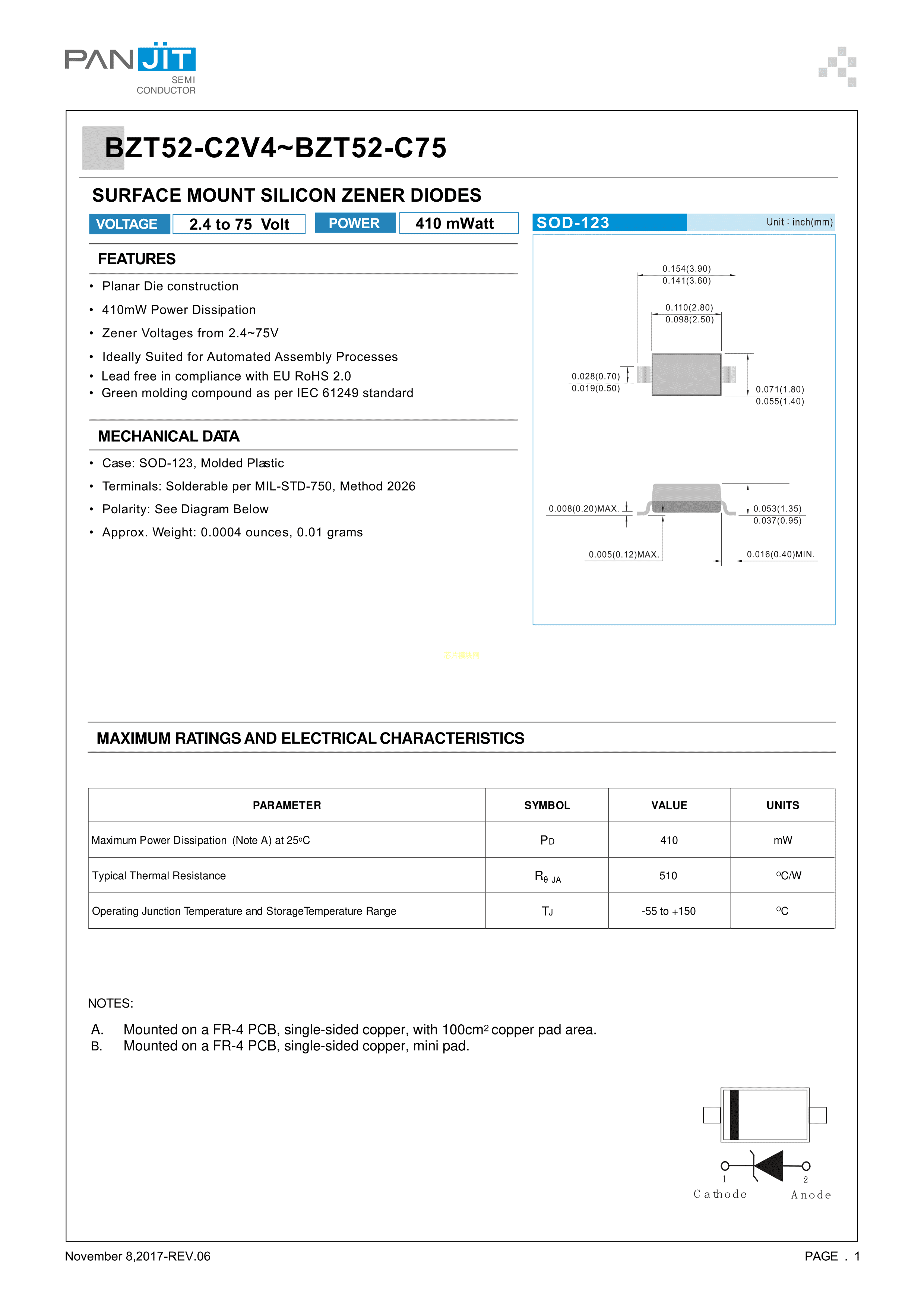 BZT52-C62_R1_00001数据手册SOD-123封装PANJIT(强茂)PDF规格书,中英文下载