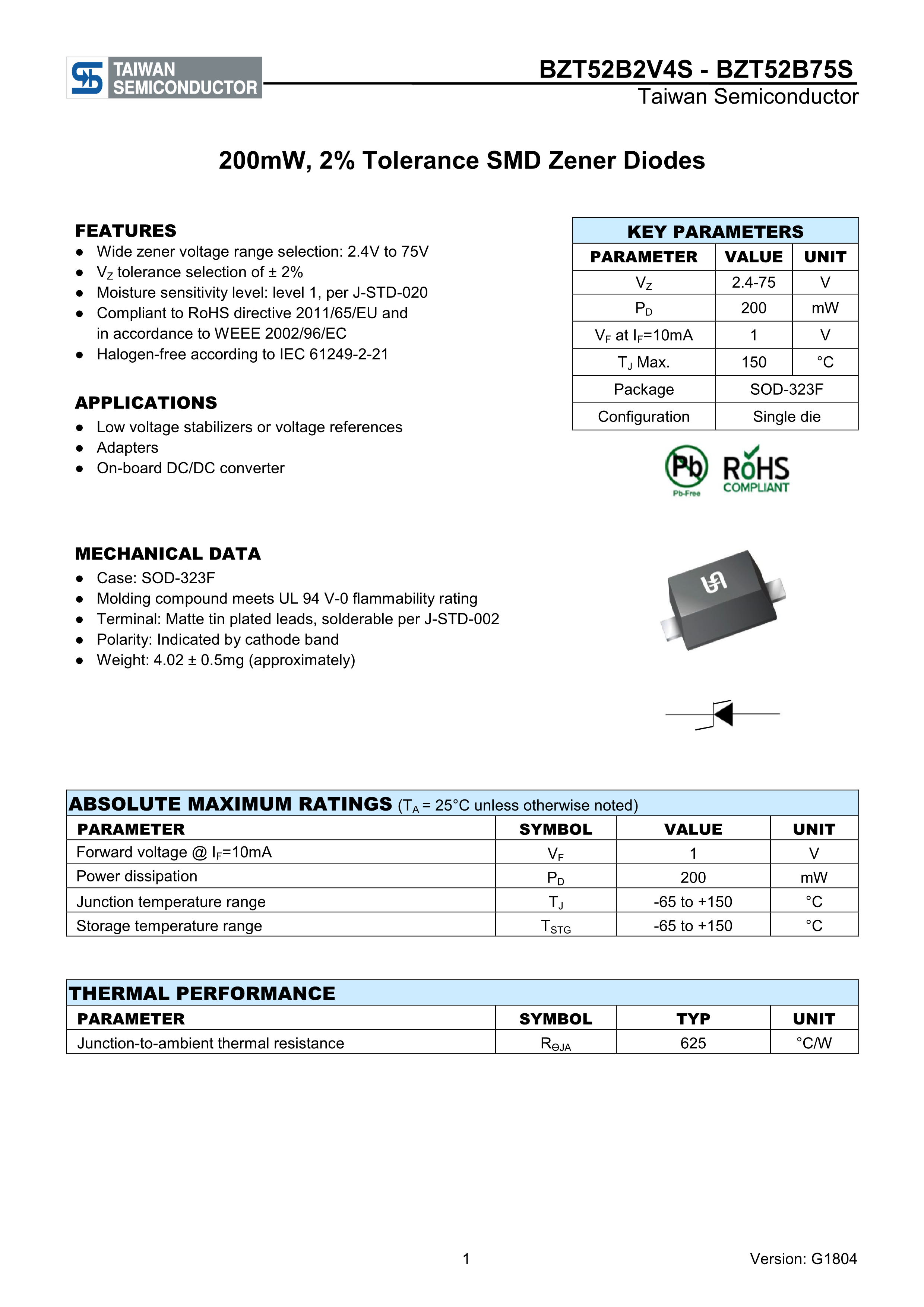 BZT52B16S RR数据手册SOD-323F封装Taiwan Semiconductor(台湾半