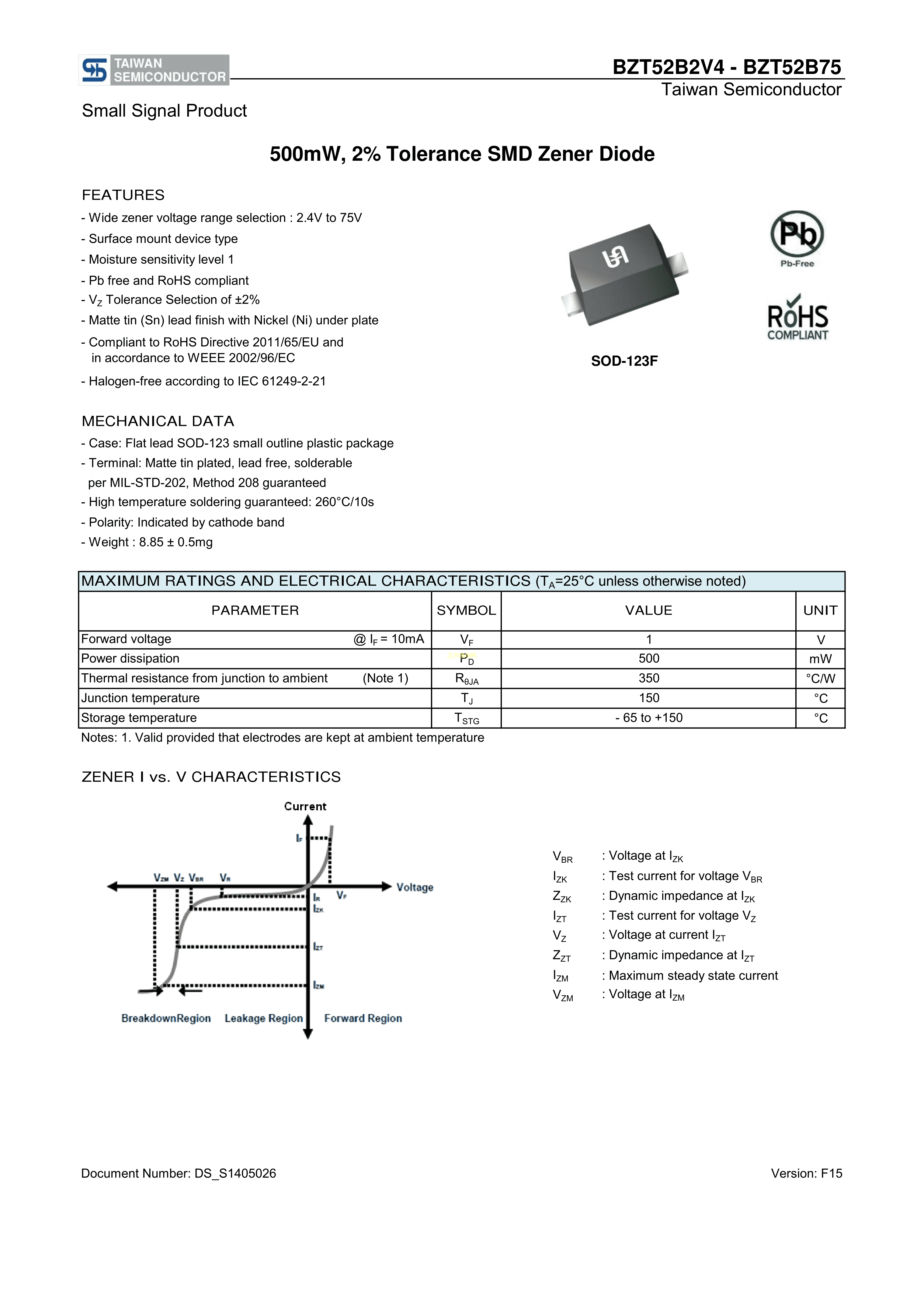 BZT52B36RHG数据手册SOD-123F封装TaiwanSemiconductor(台湾半导体)PDF规格书,中英文下载