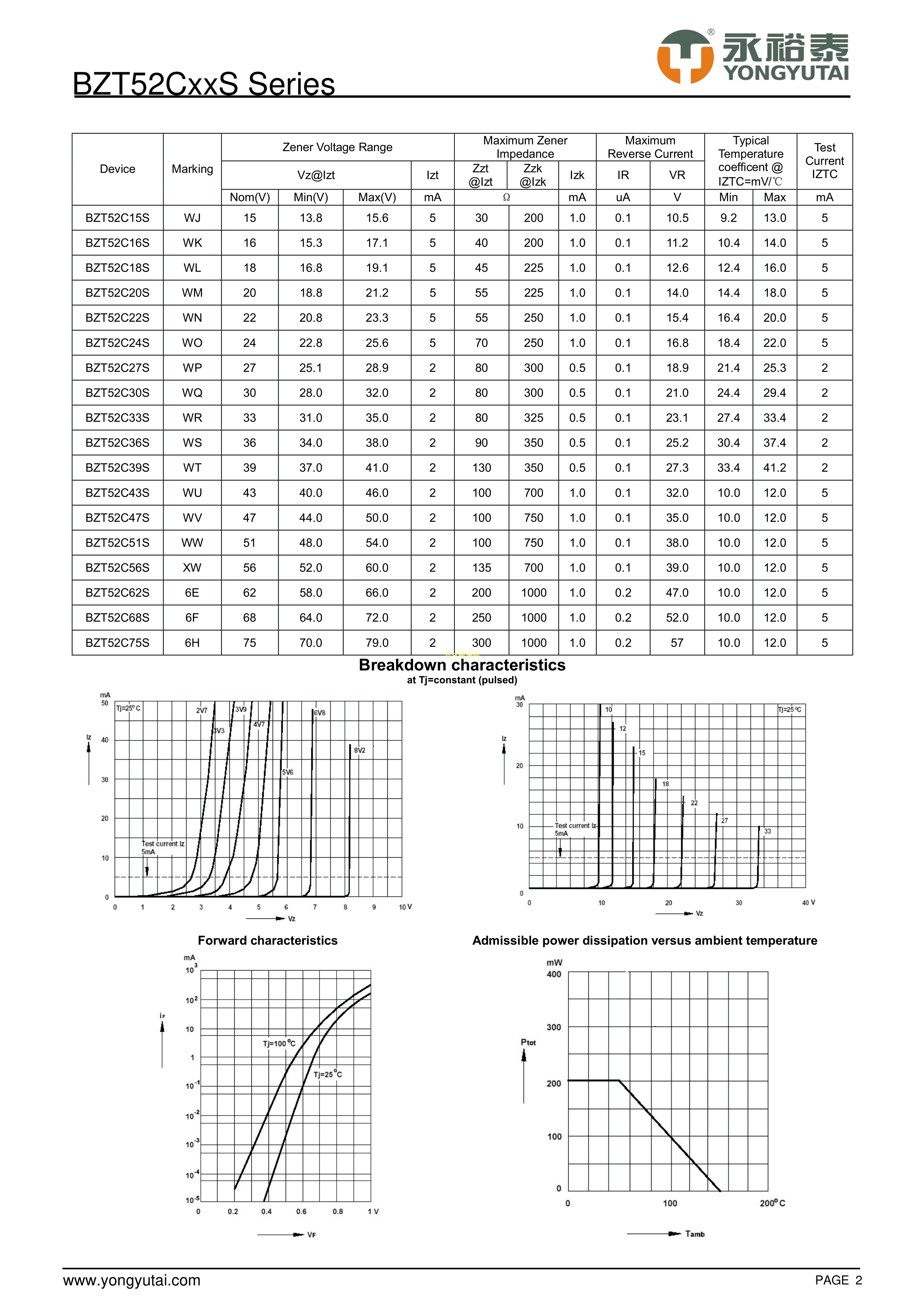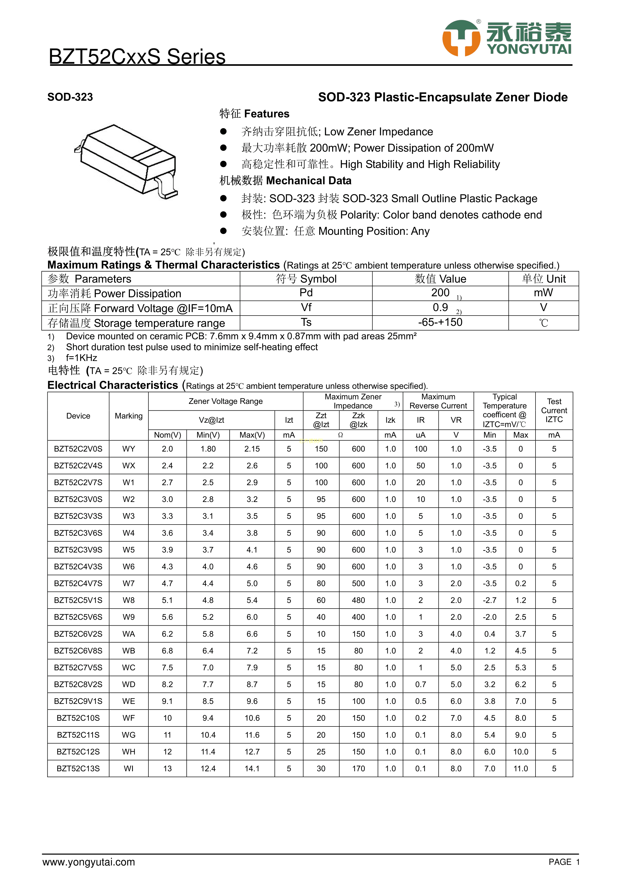 BZT52C12S数据手册SOD-323封装YONGYUTAI(永裕泰)PDF规格书,中英文下载