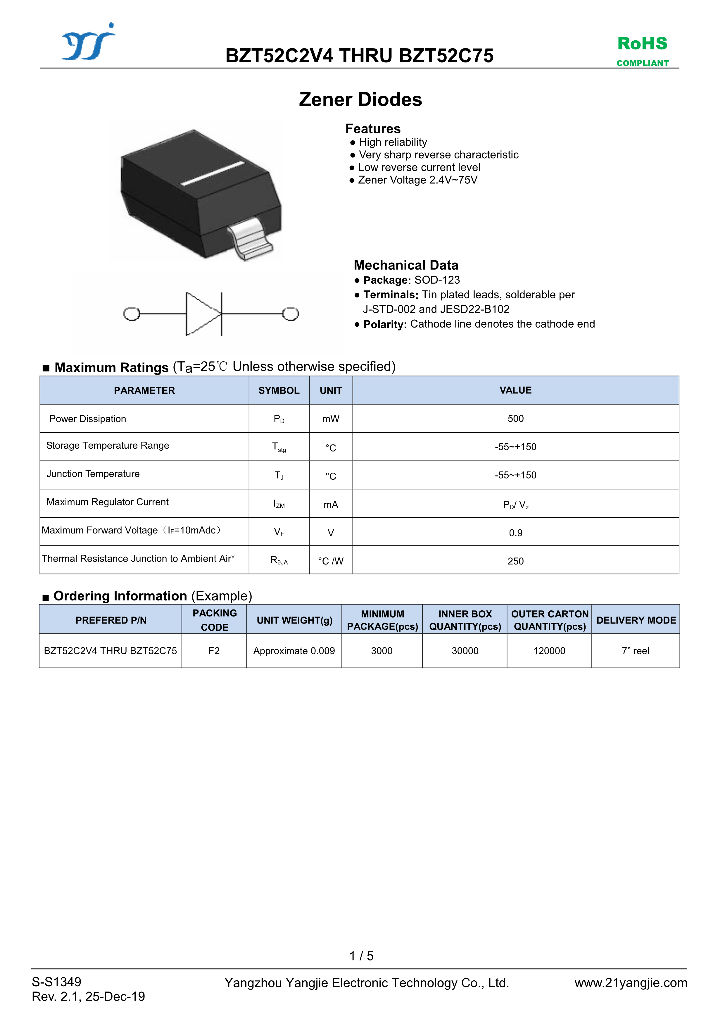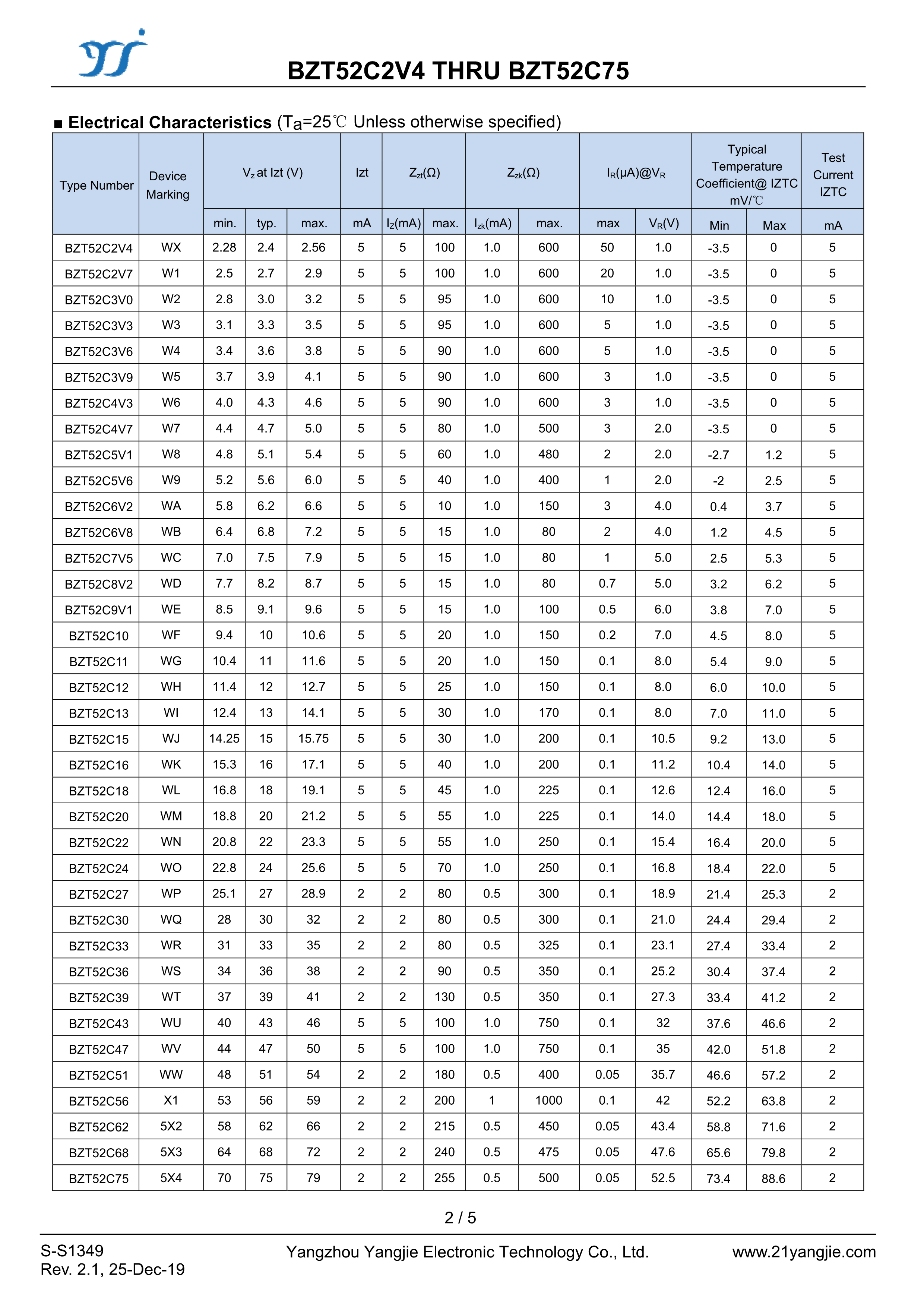 BZT52C2V4数据手册SOD-123封装YANGJIE(扬杰)PDF规格书,中英文下载