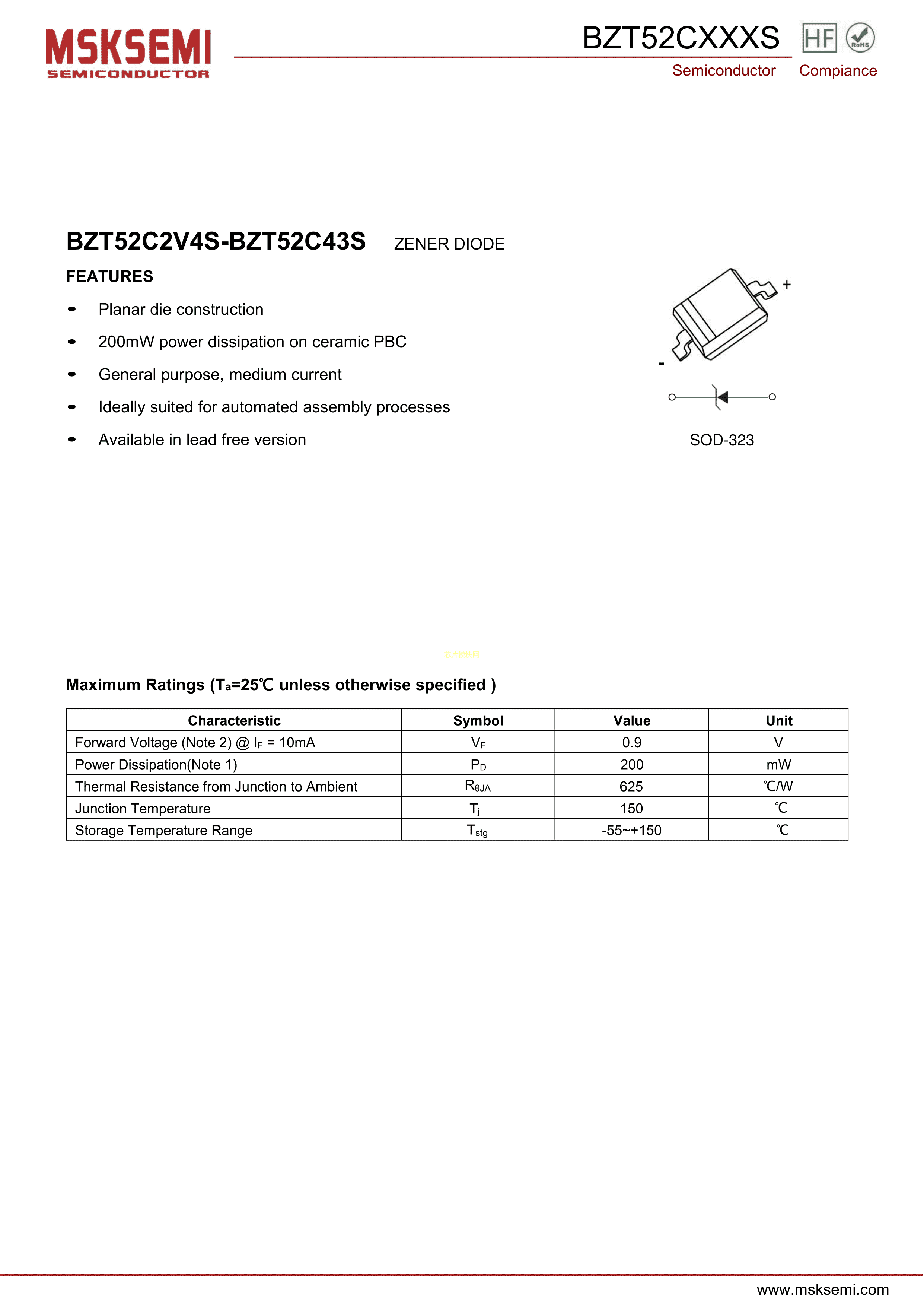 BZT52C3V9S数据手册SOD-323封装MSKSEMI(美森科)PDF规格书,中英文下载