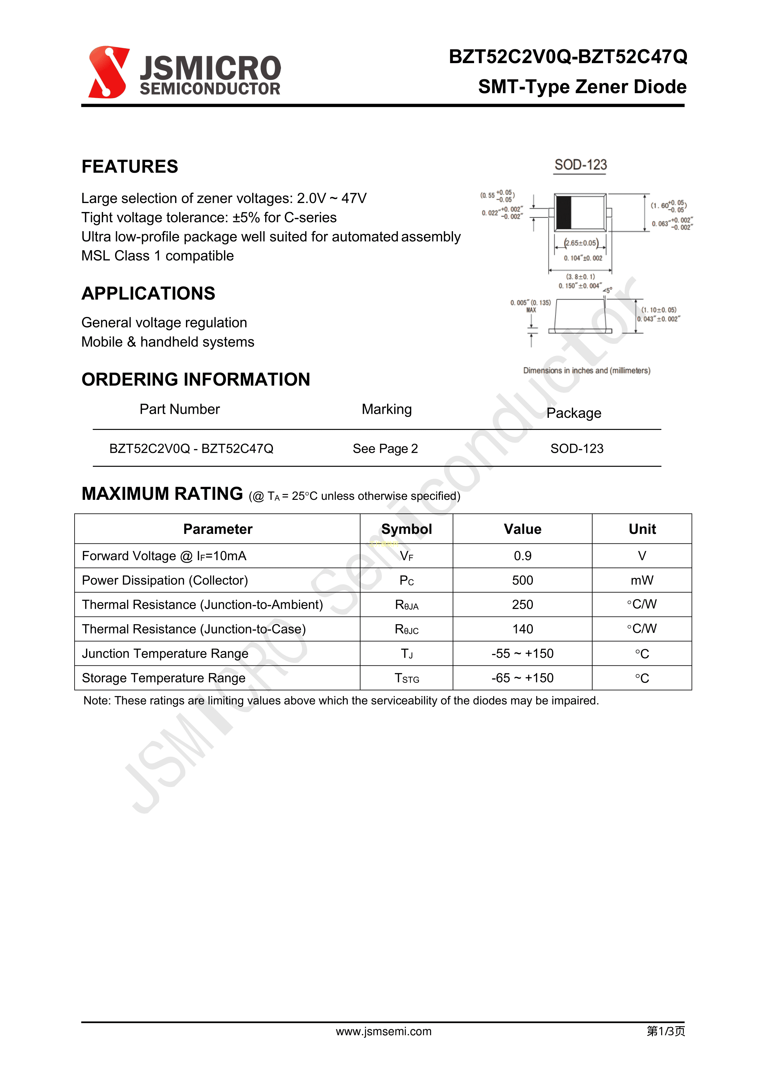 BZT52C9V1Q数据手册SOD-123封装JSMSEMI(杰盛微)PDF规格书,中英文下载