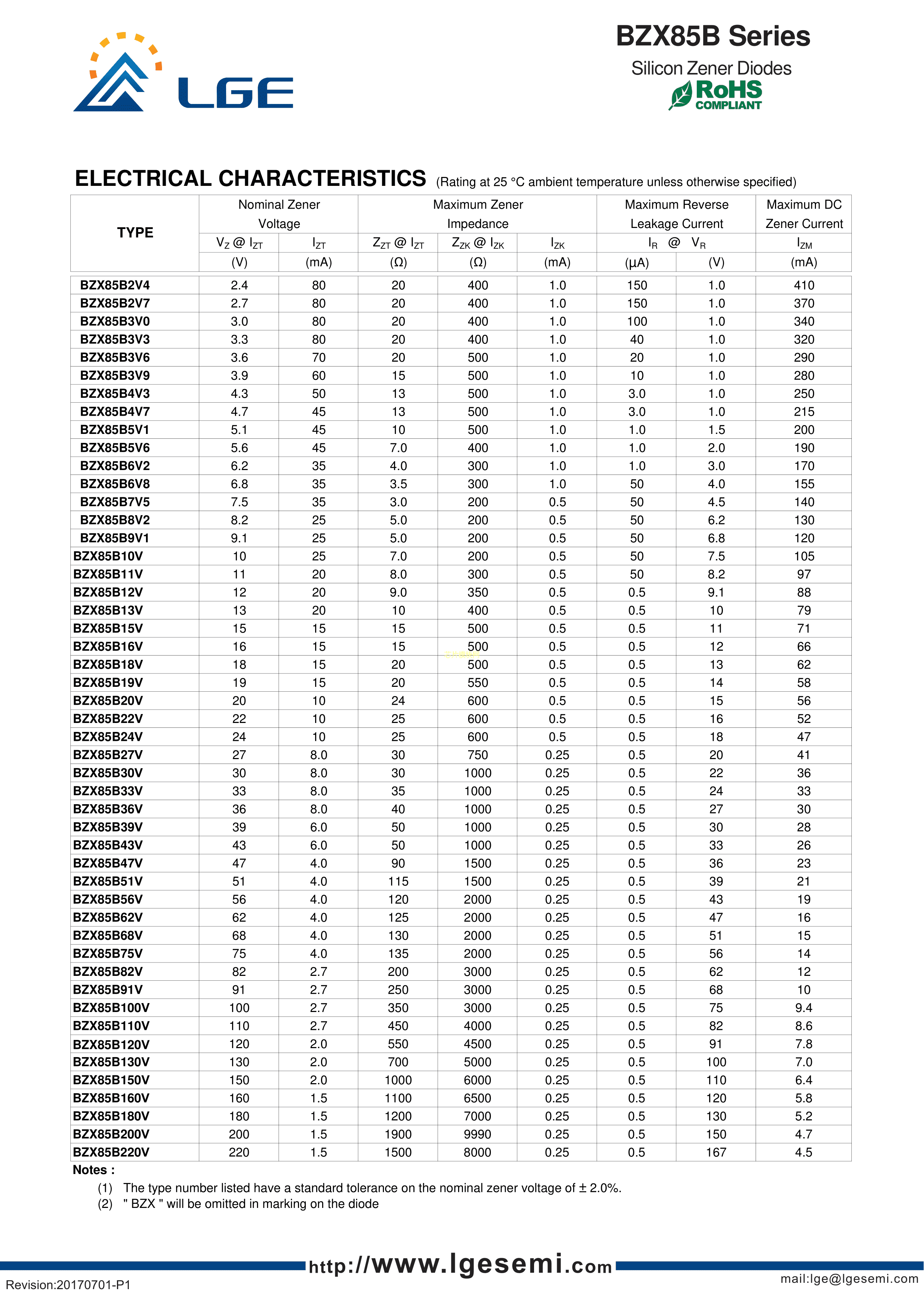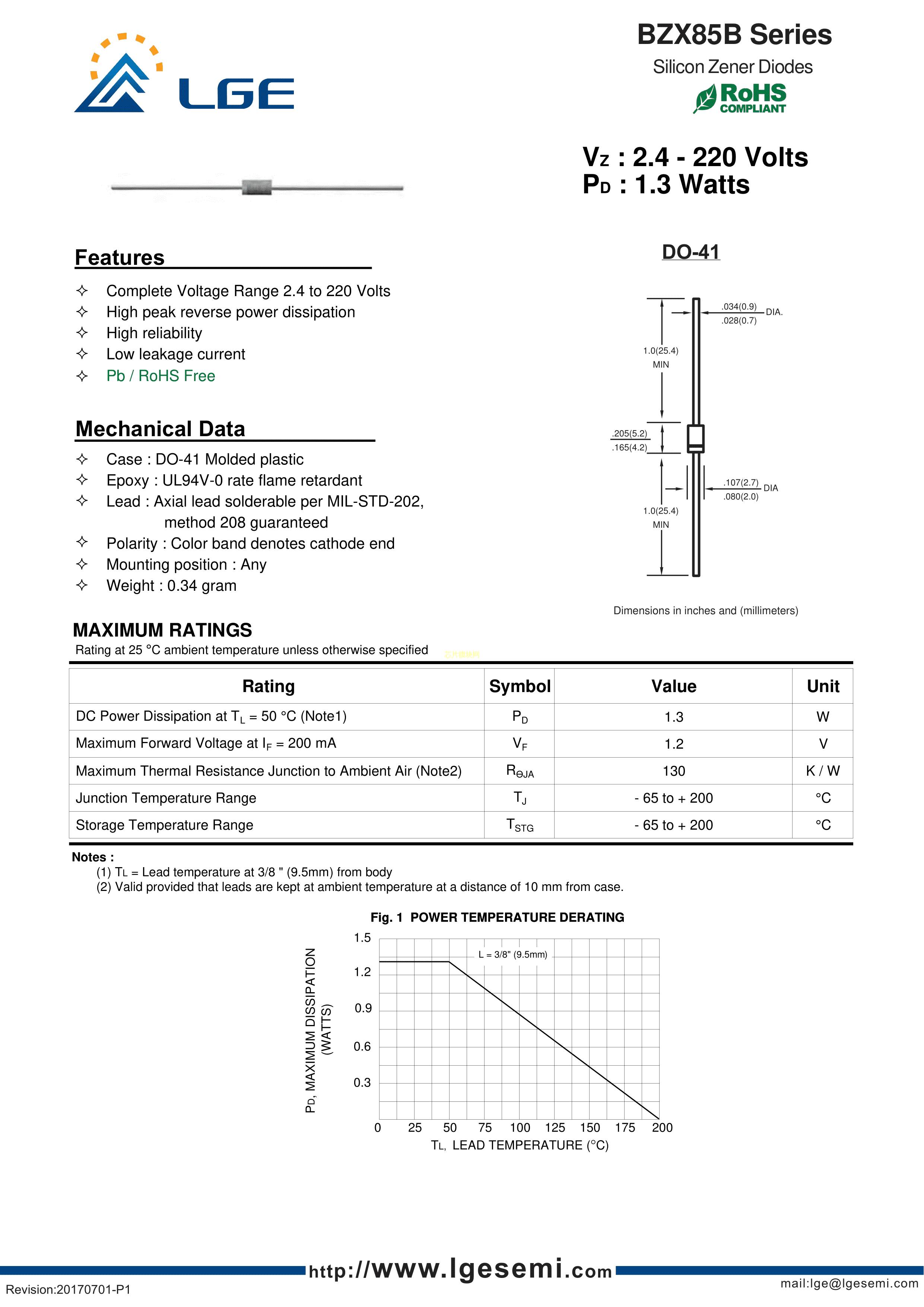 BZX85B150V数据手册DO-41封装LGE(鲁光)PDF规格书,中英文下载