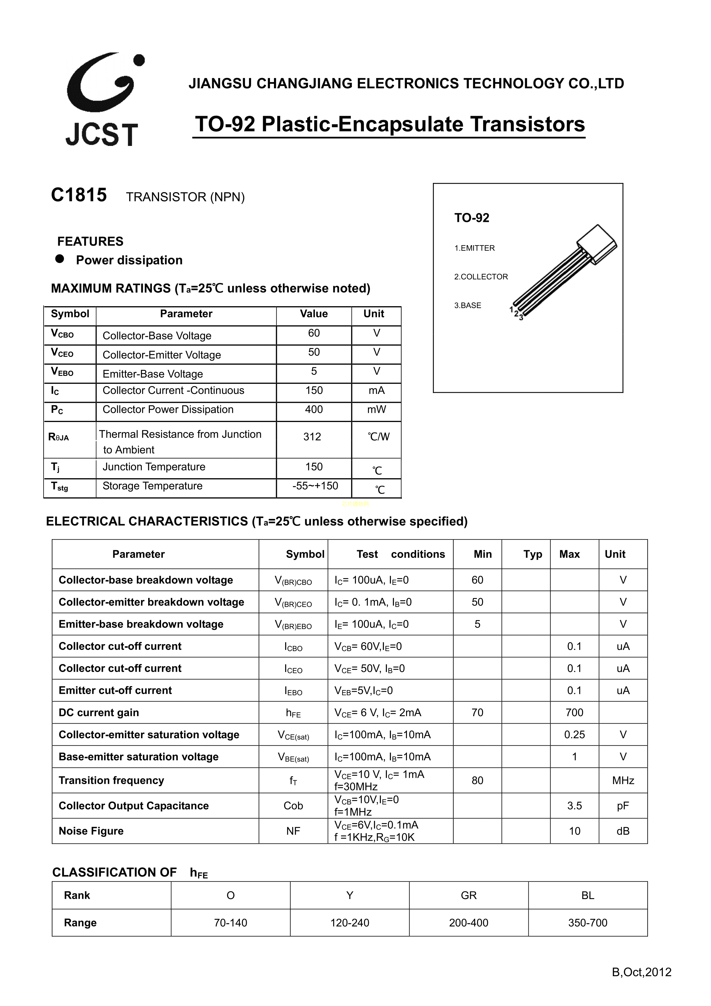 C1815-TA数据手册TO-92_Forming1封装CJ(江苏长电-长晶)PDF规格书,中英文下