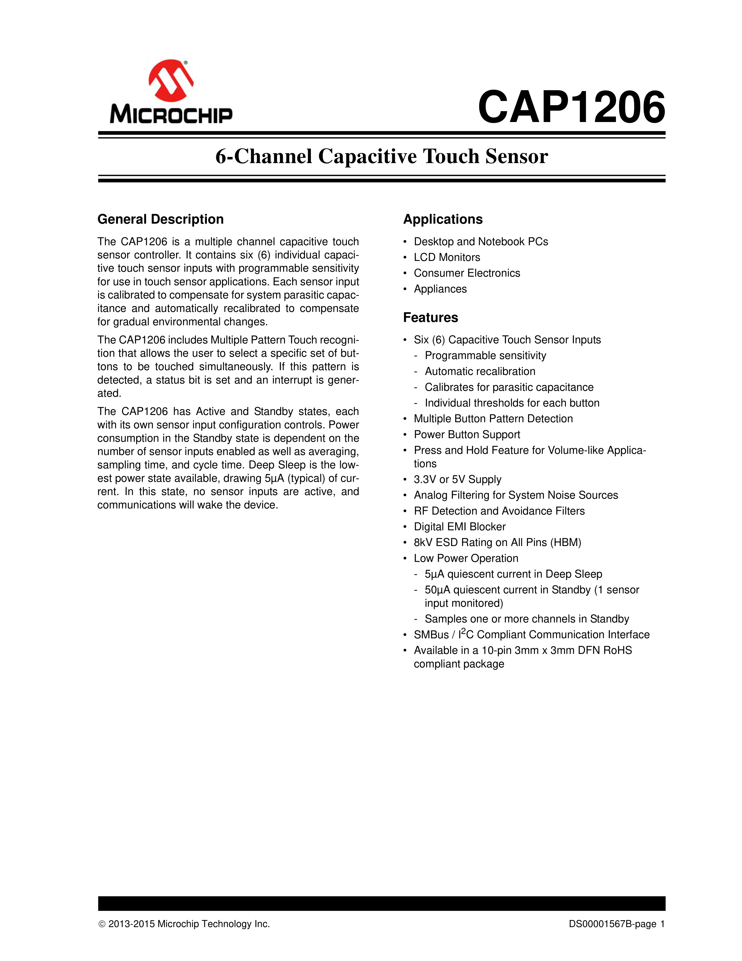 CAP1206-1-AIA-TR数据手册DFN-10(3x3)封装MICROCHIP(美国微芯)PD