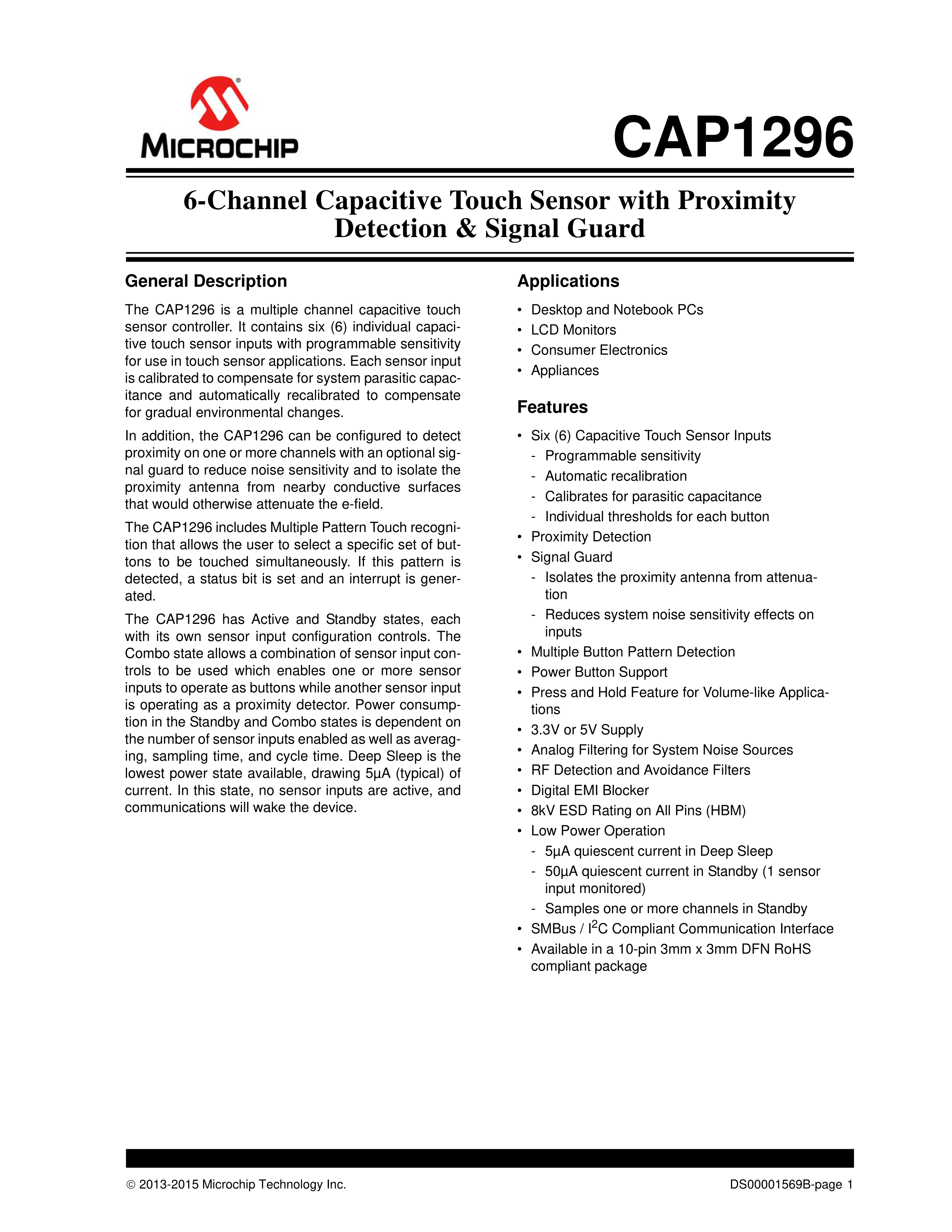 CAP1296-1-SL-TR数据手册SOIC-14封装MICROCHIP(美国微芯)PDF规格书,