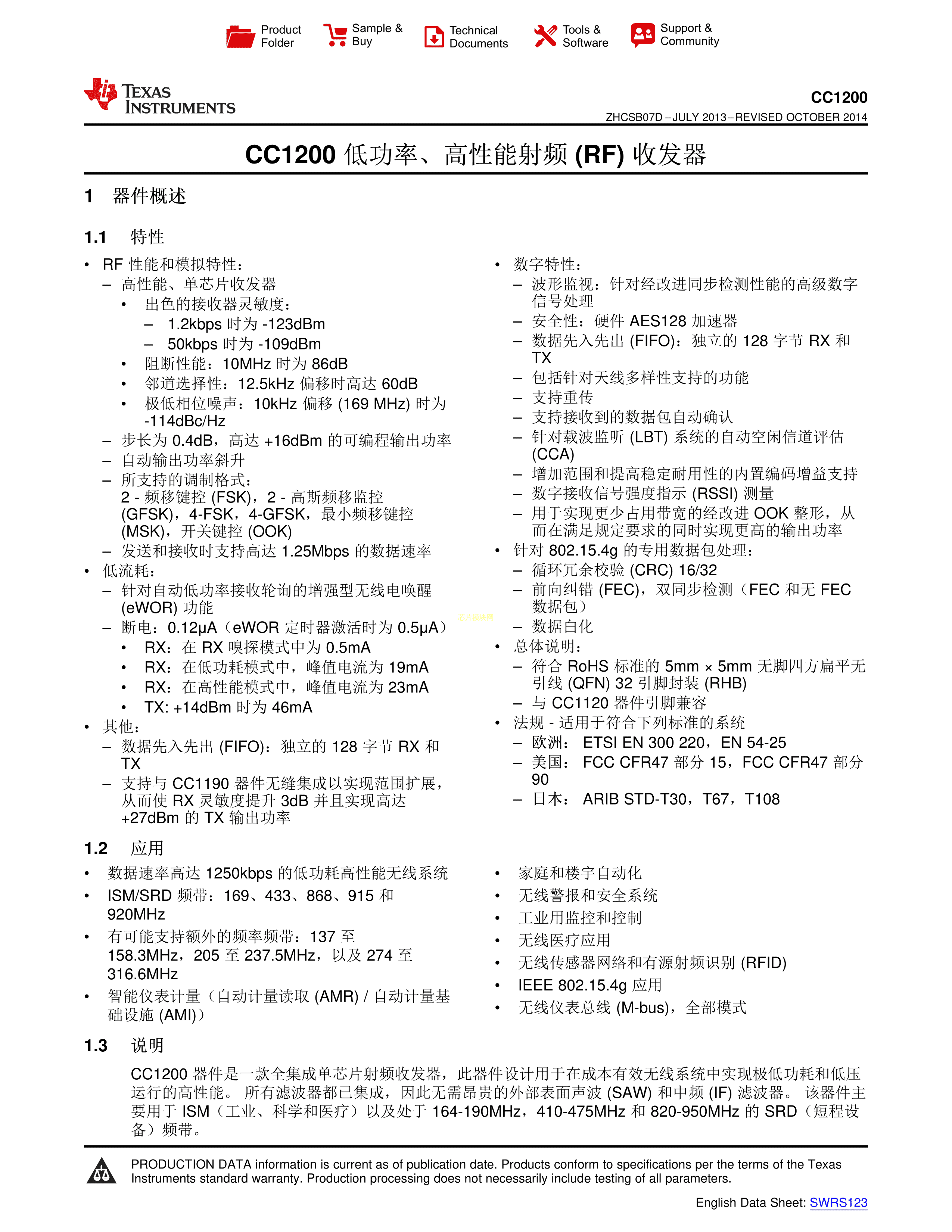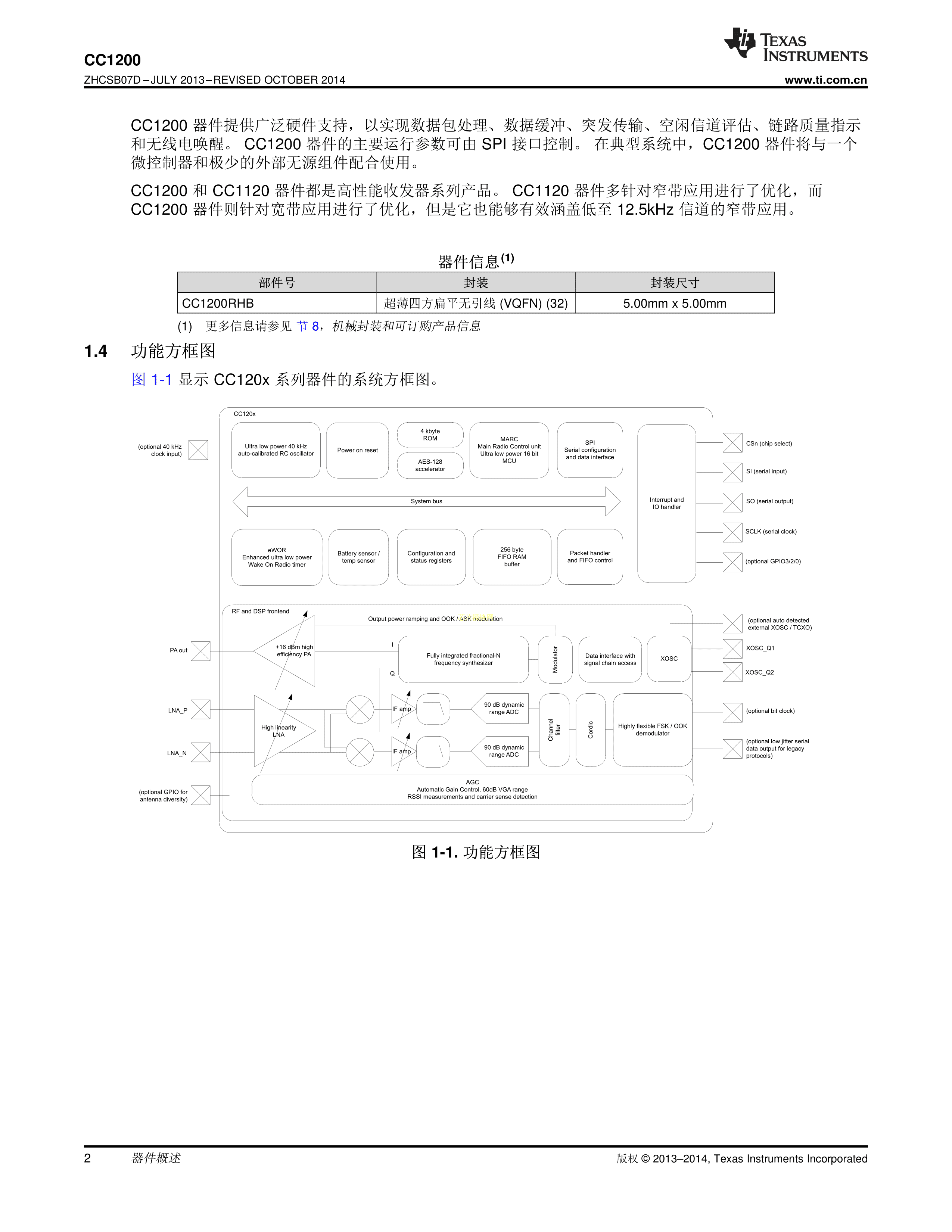 CC1200RHBR数据手册QFN-32_5x5x05P封装TI(德州仪器)PDF规格书,中英文下载