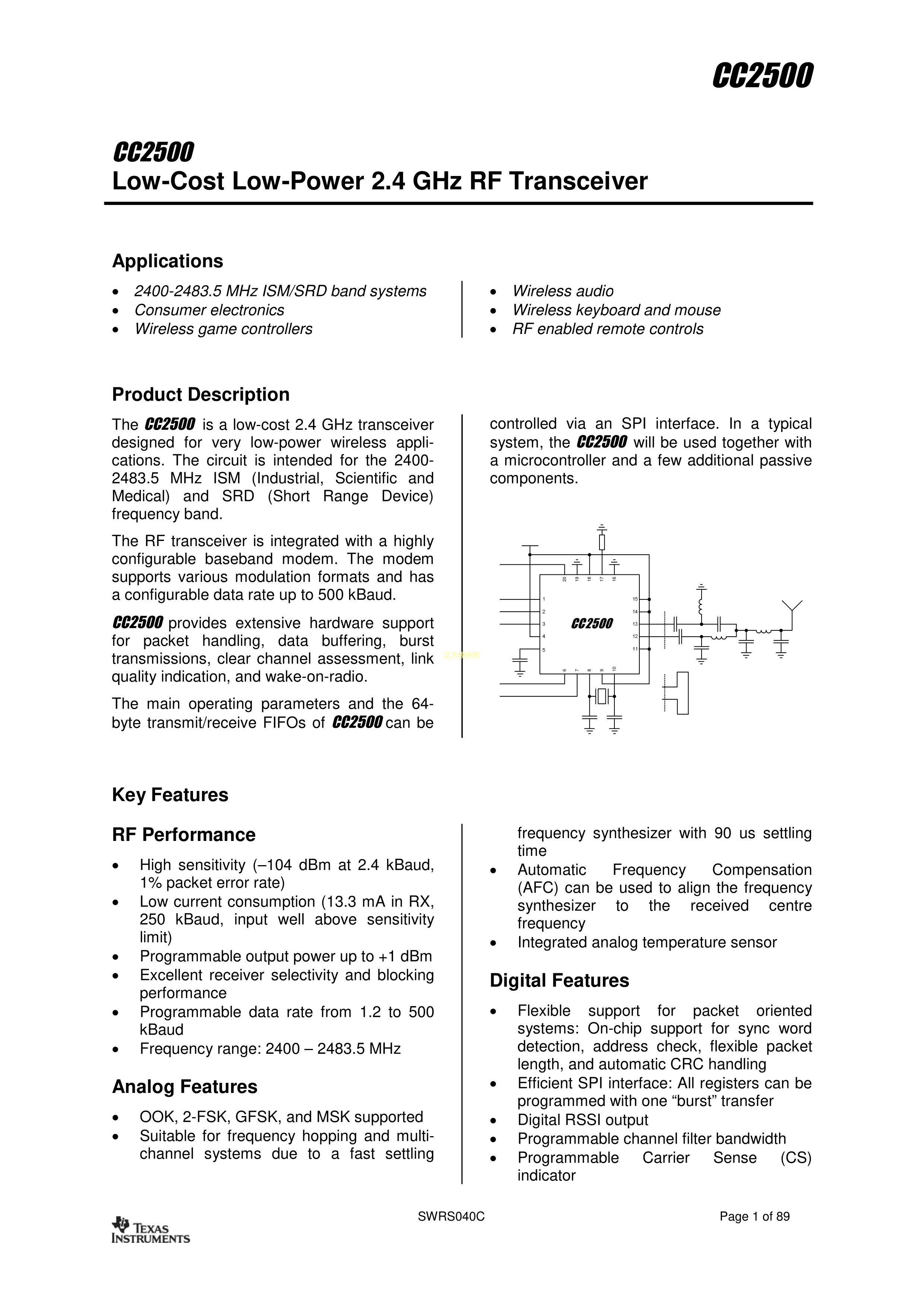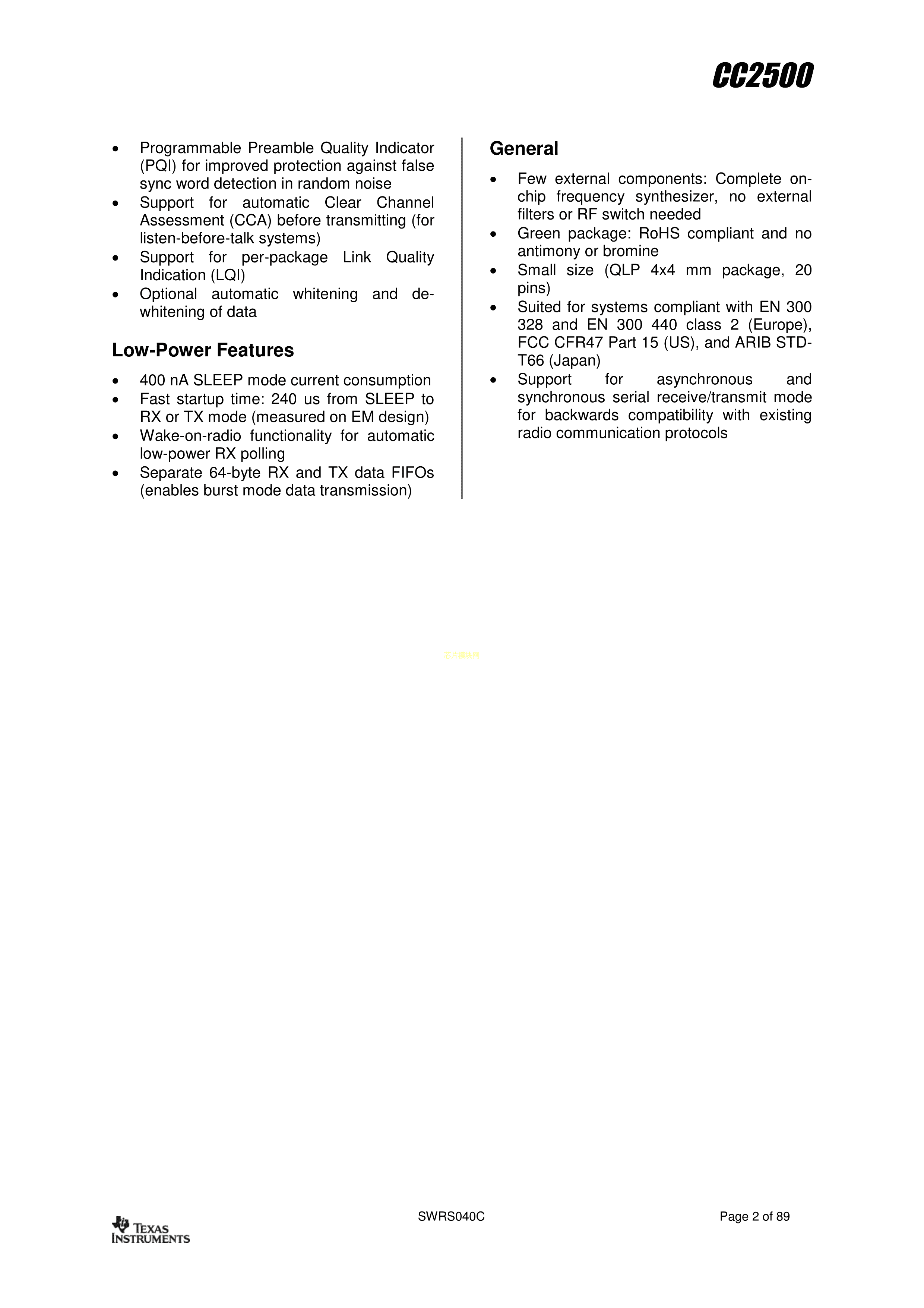 CC2500RTKR数据手册QFN20_4X4X05P封装TI(德州仪器)PDF规格书,中英文下载