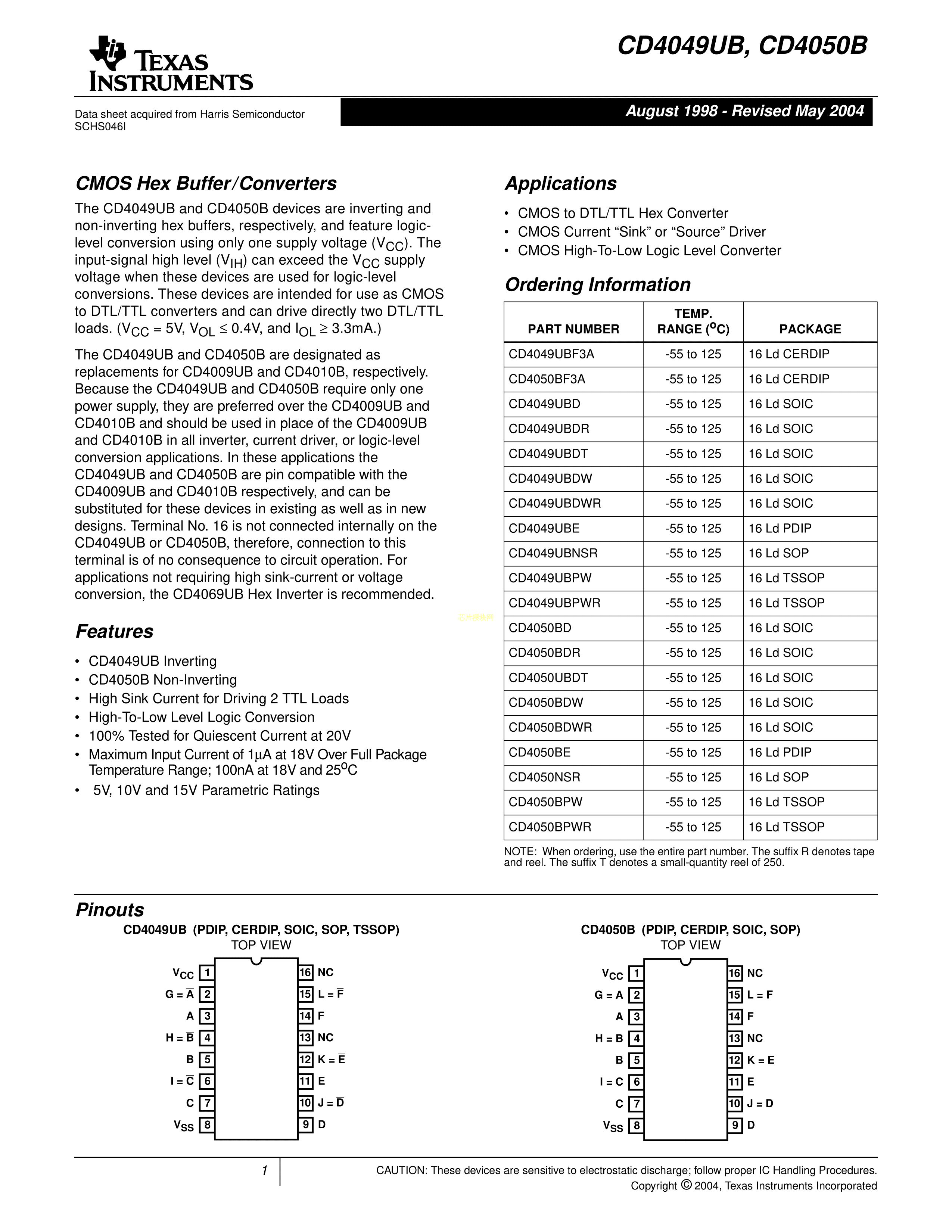 CD4049UBDR数据手册SOIC-16_150mil封装TI(德州仪器)PDF规格书,中英文下载
