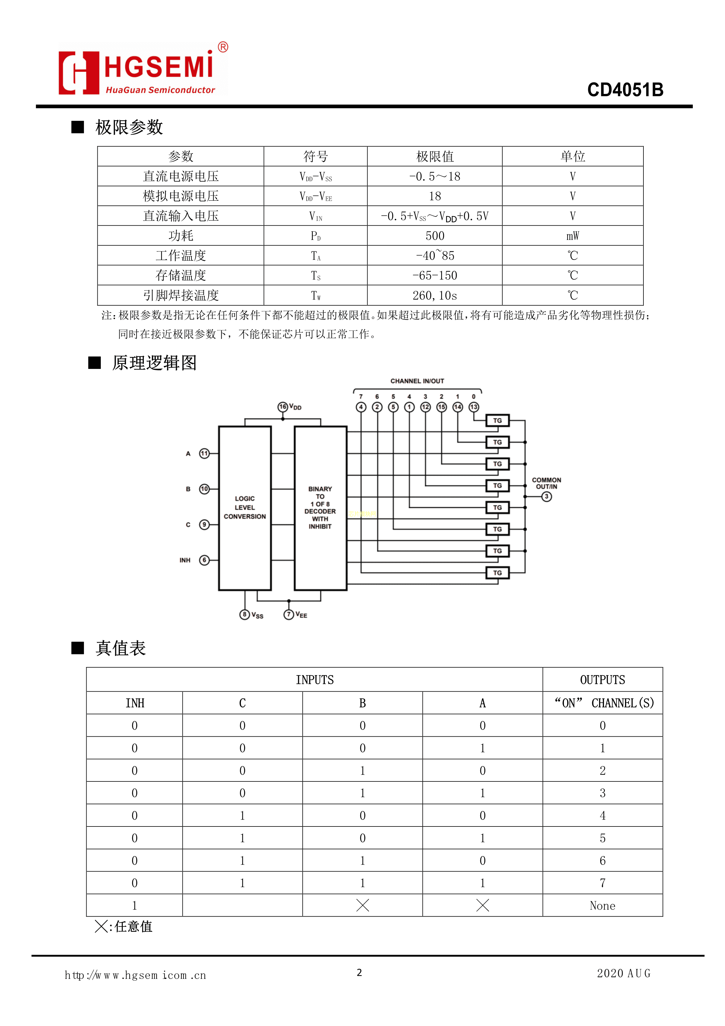 CD4051BE数据手册DIP-16封装HGSEMI(华冠)PDF规格书,中英文下载