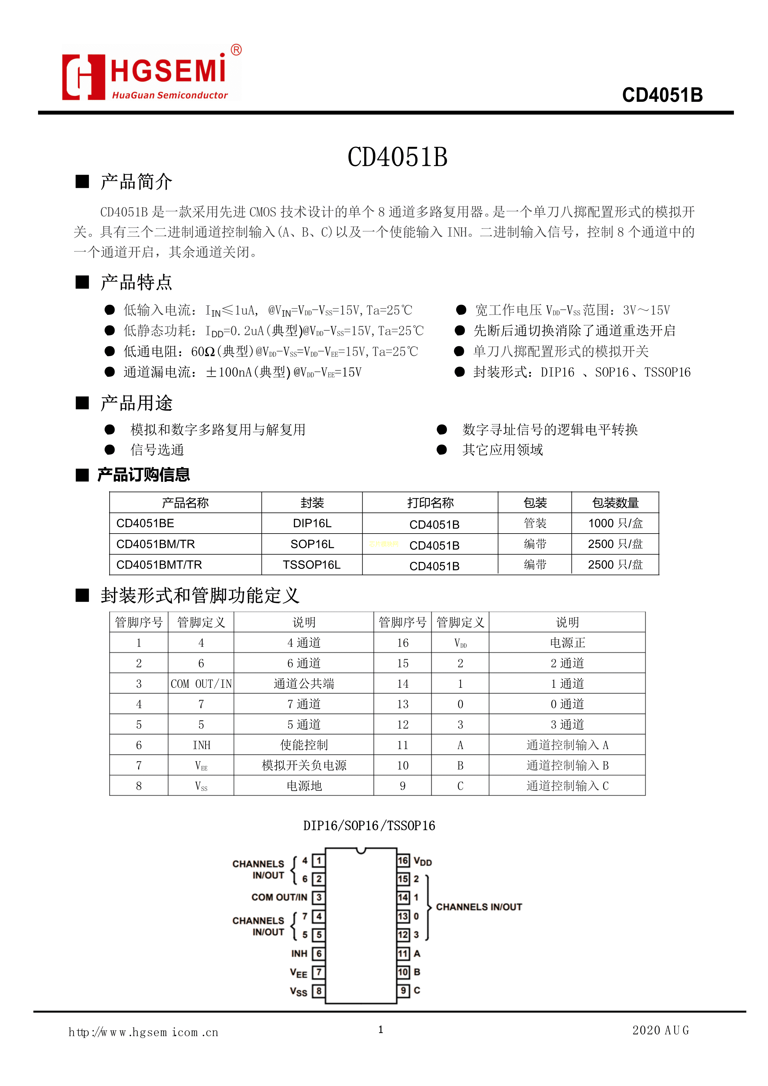 CD4051BMT-TR数据手册TSSOP-16封装HGSEMI(华冠)PDF规格书,中英文下载