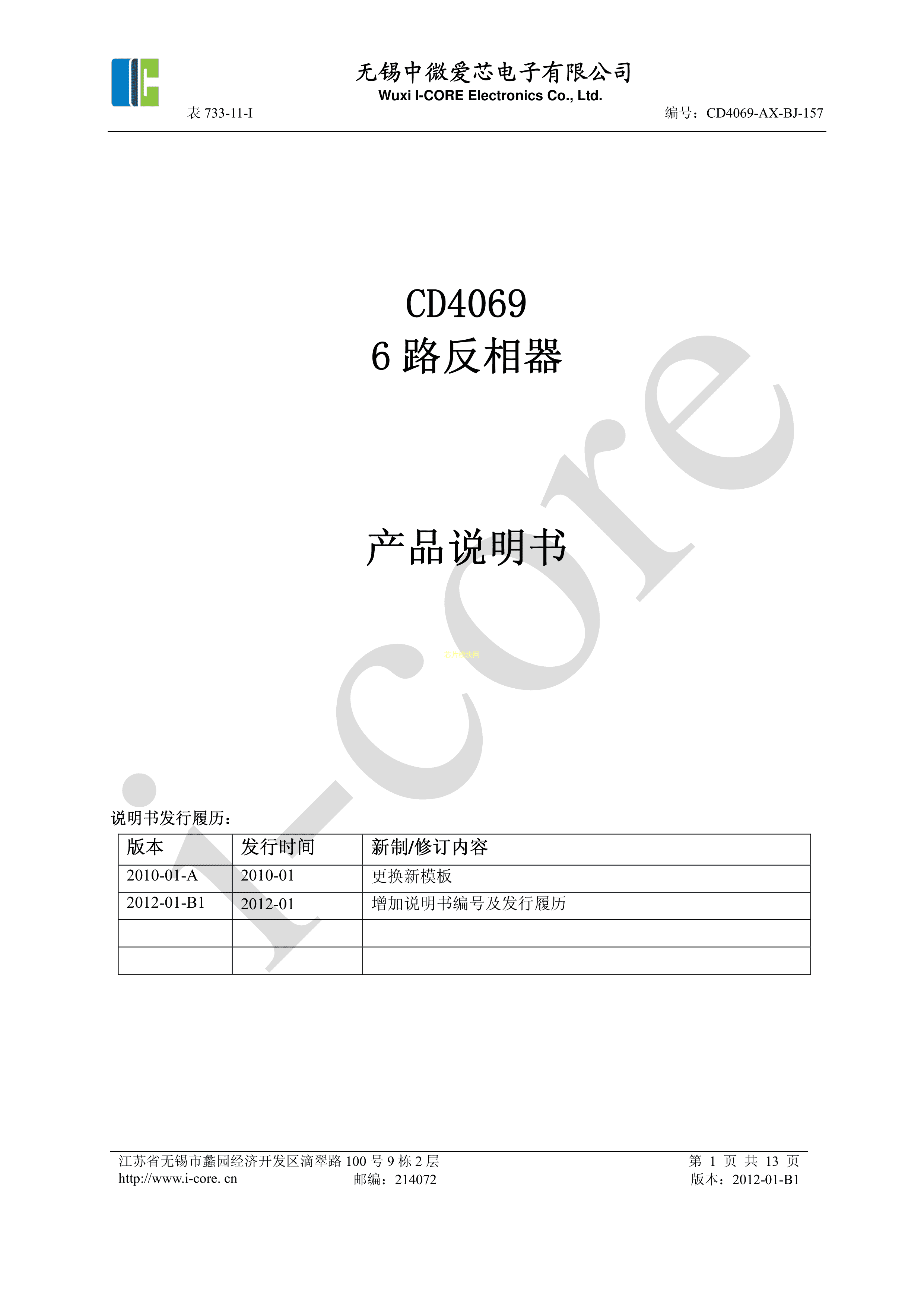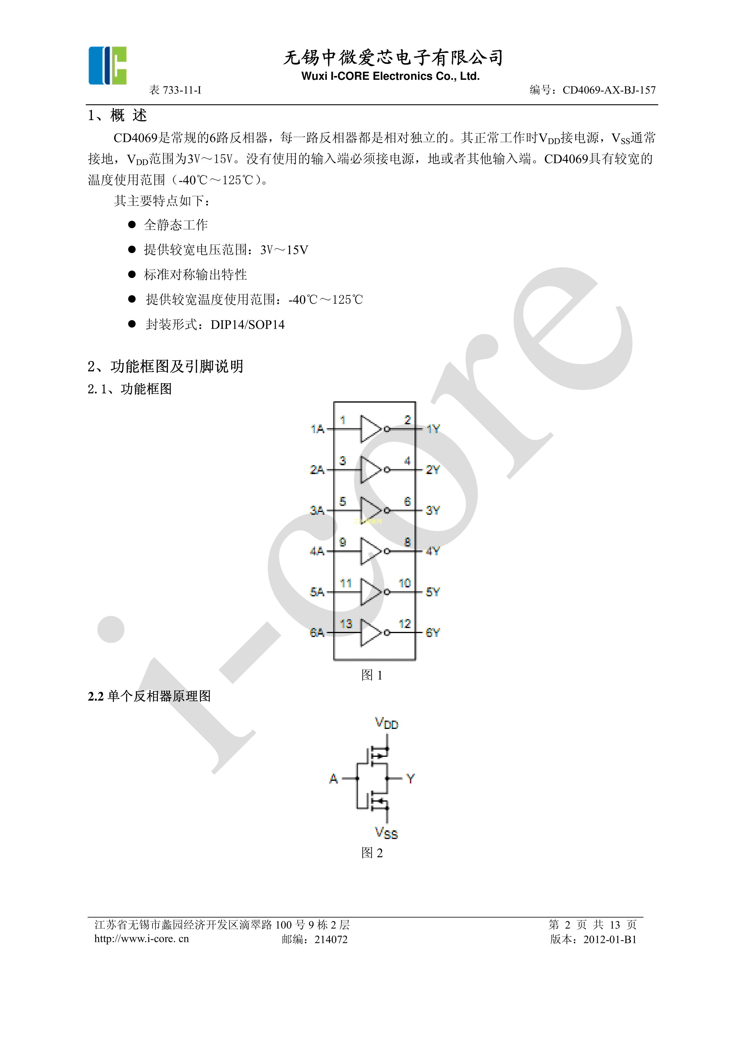CD4069数据手册DIP-14封装I-CORE(中微爱芯)PDF规格书,中英文下载