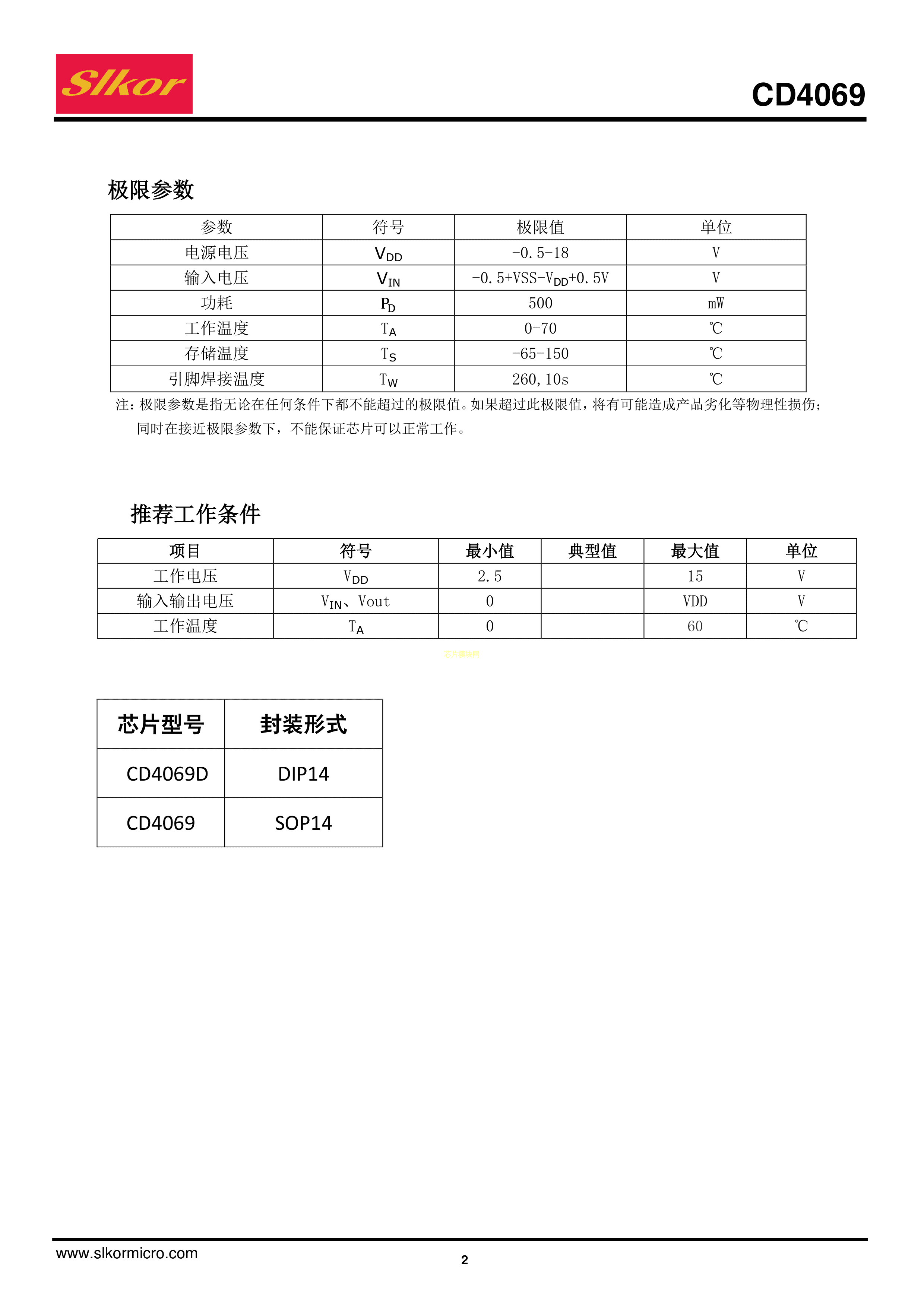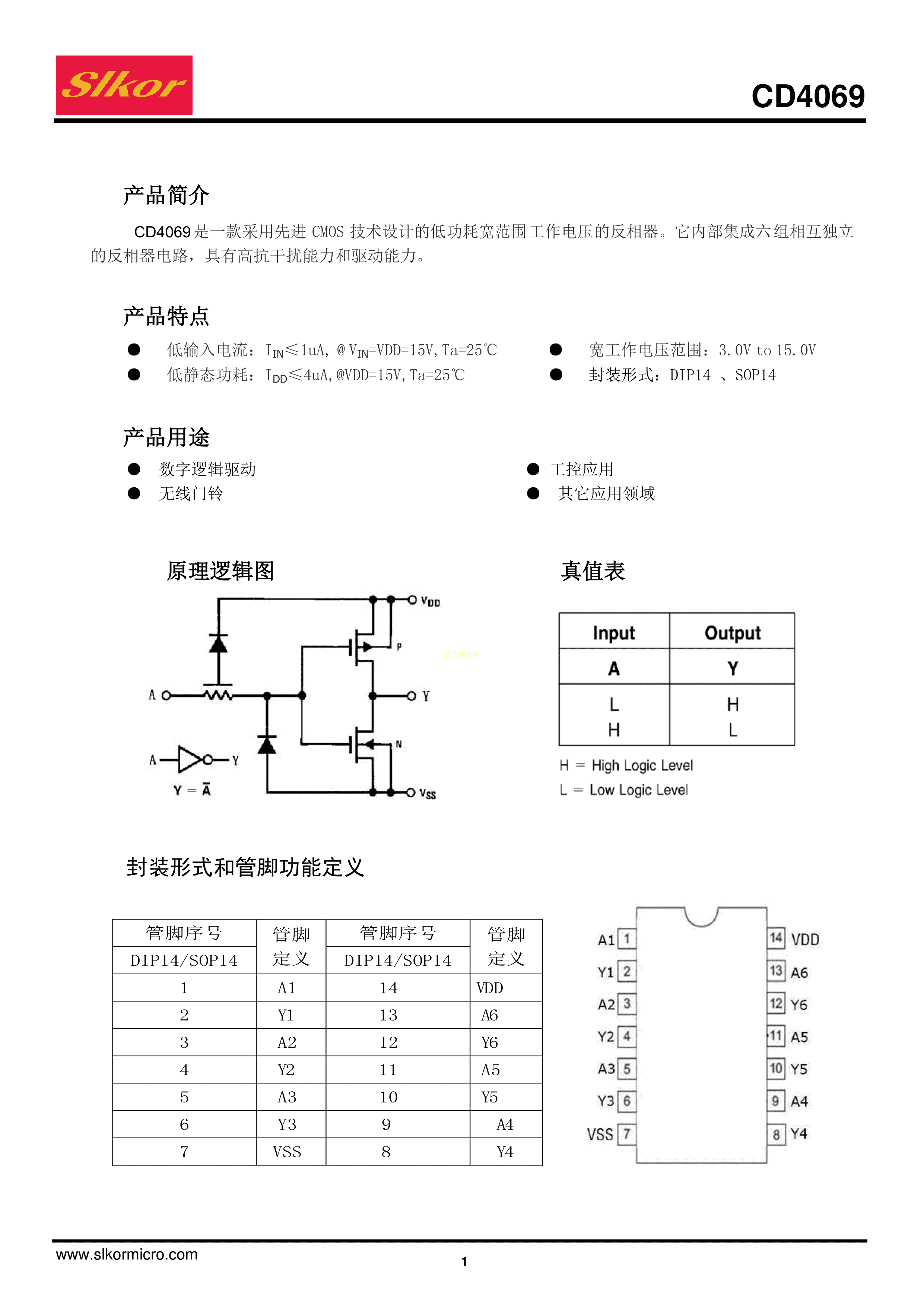 CD4069数据手册SOP-14封装Slkor(萨科微)PDF规格书,中英文下载