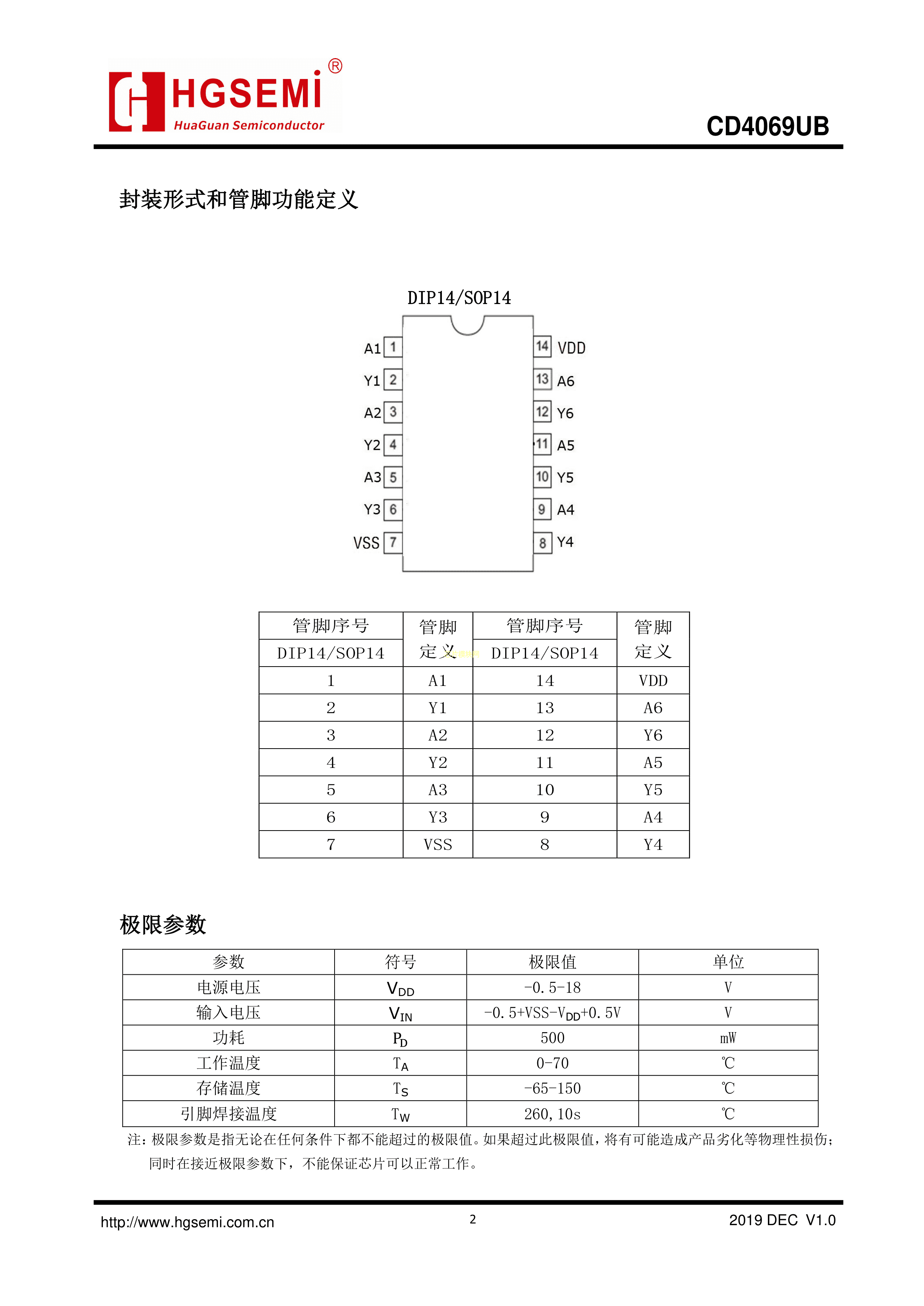 CD4069BE数据手册DIP-14封装HGSEMI(华冠)PDF规格书,中英文下载