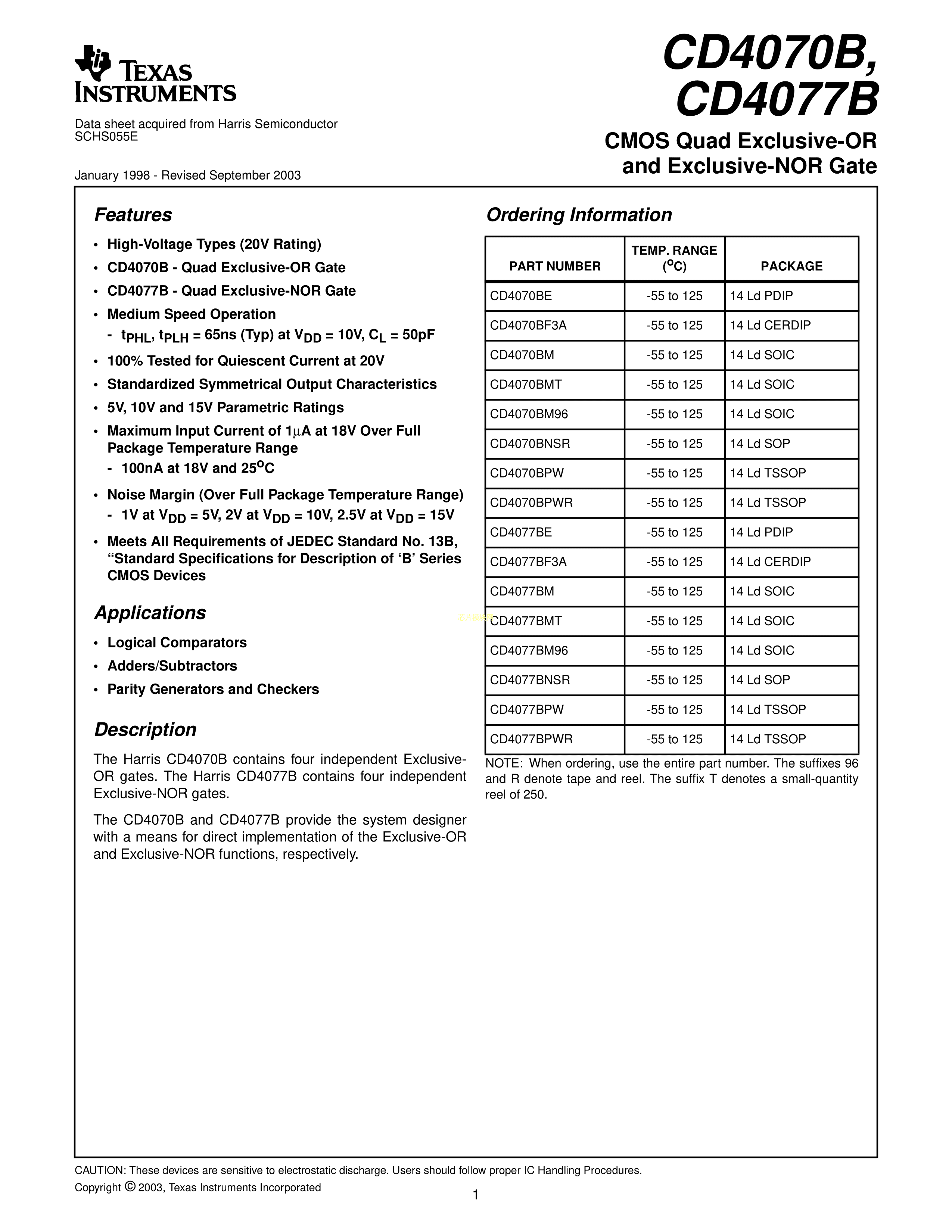 CD4070BM96数据手册SOIC-14_150mil封装TI(德州仪器)PDF规格书,中英文下载