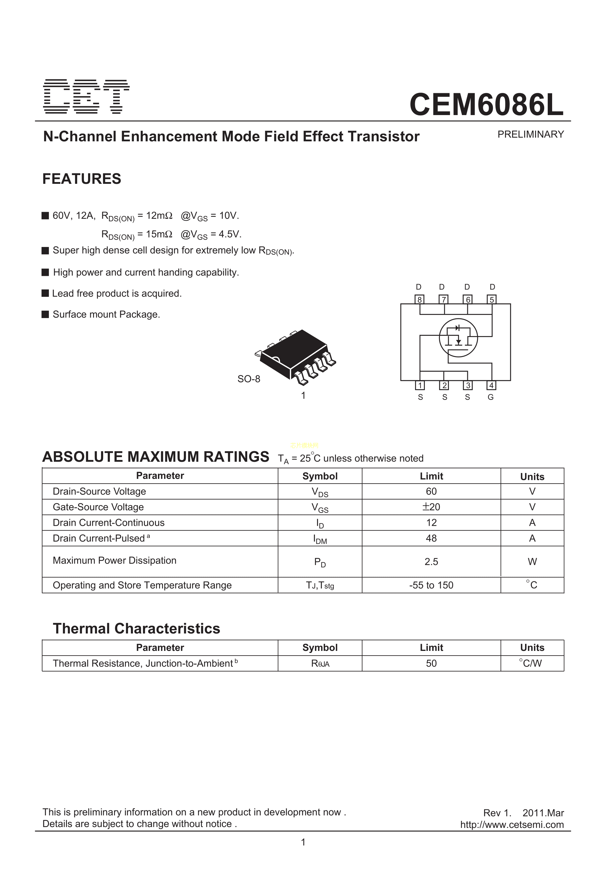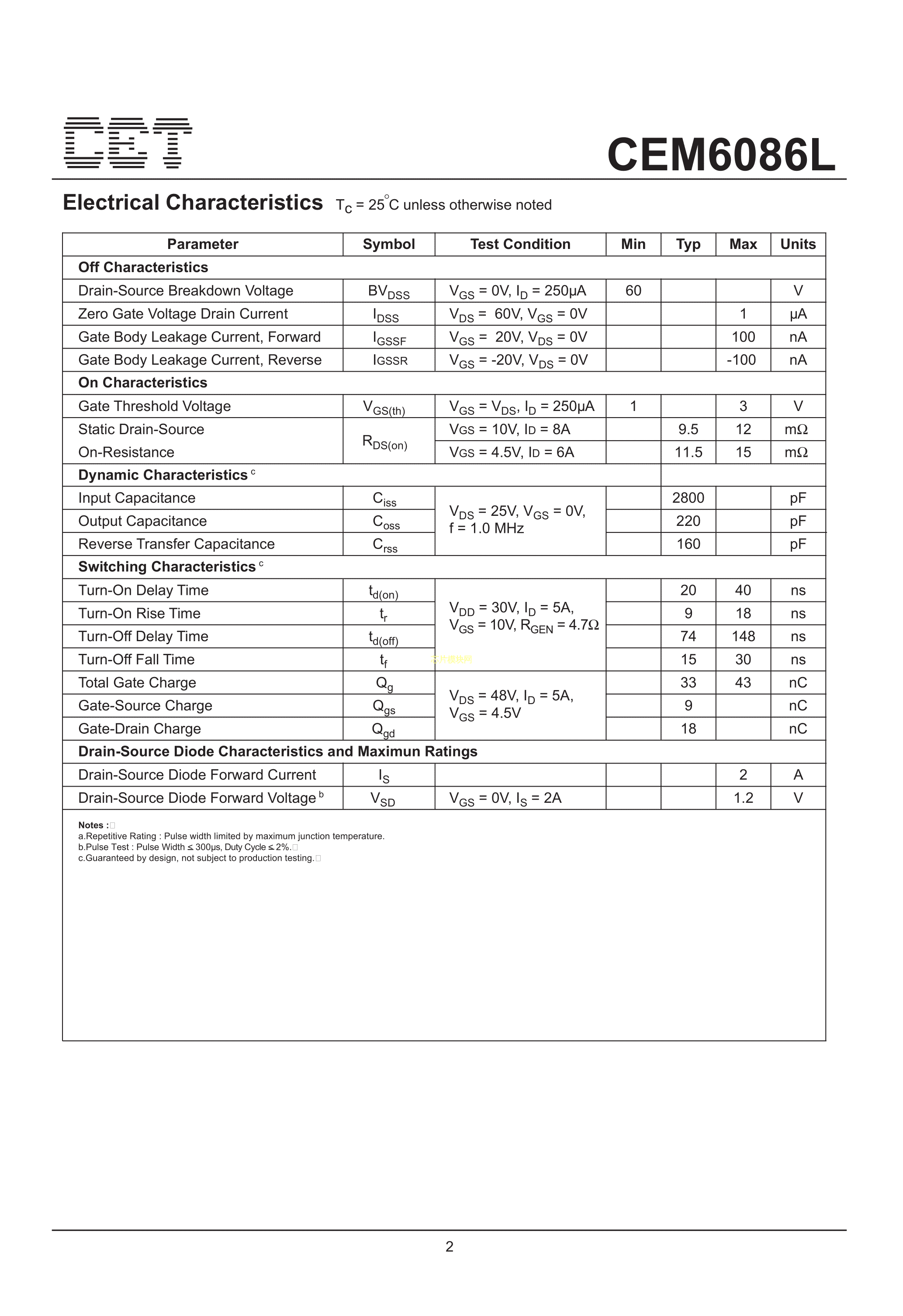 CEM6086L数据手册SOP-8_150mil封装CET(华瑞)PDF规格书,中英文下载