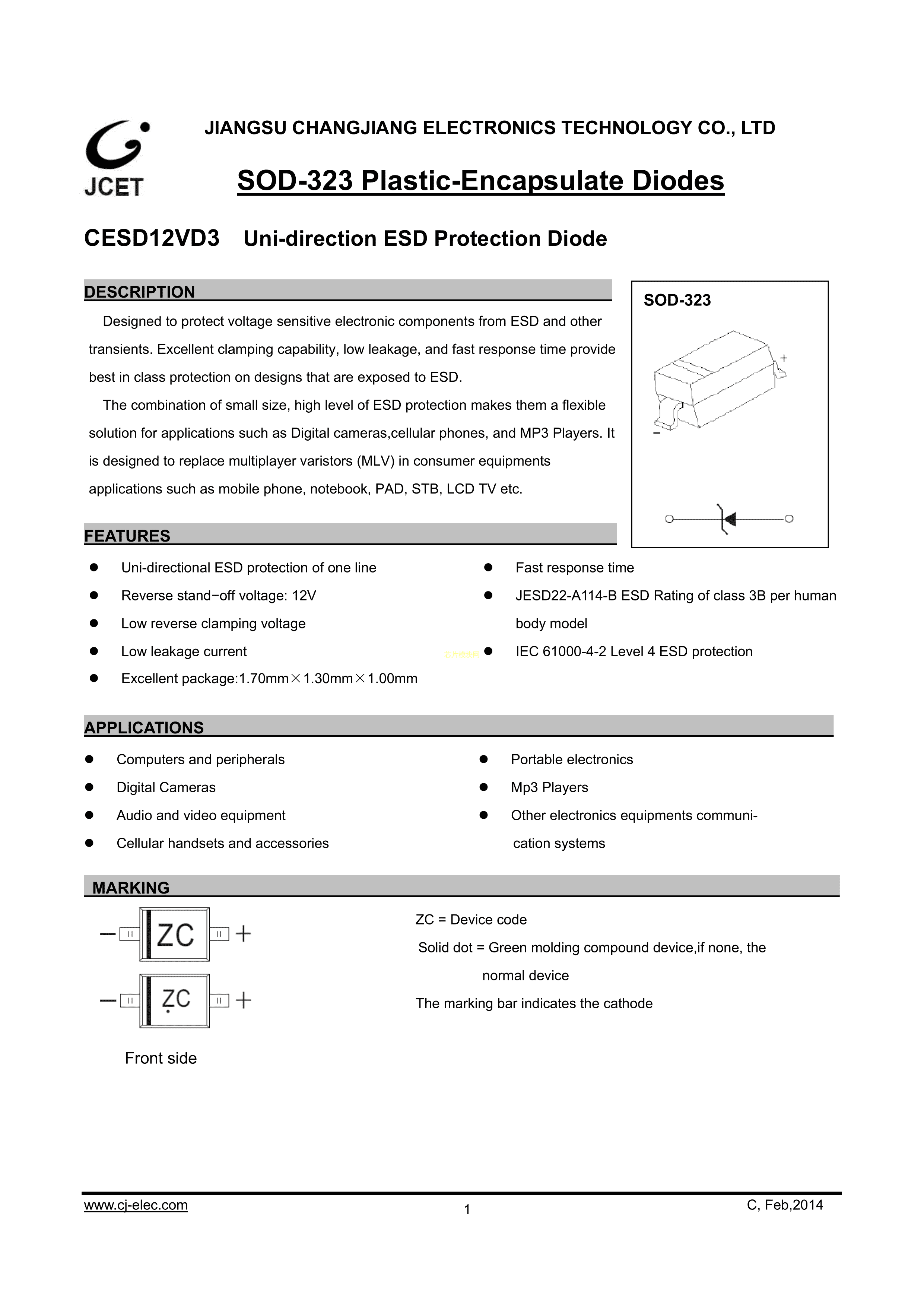 CESD12VD3ZC数据手册SOD-323封装CJ(江苏长电-长晶)PDF规格书,中英文下载