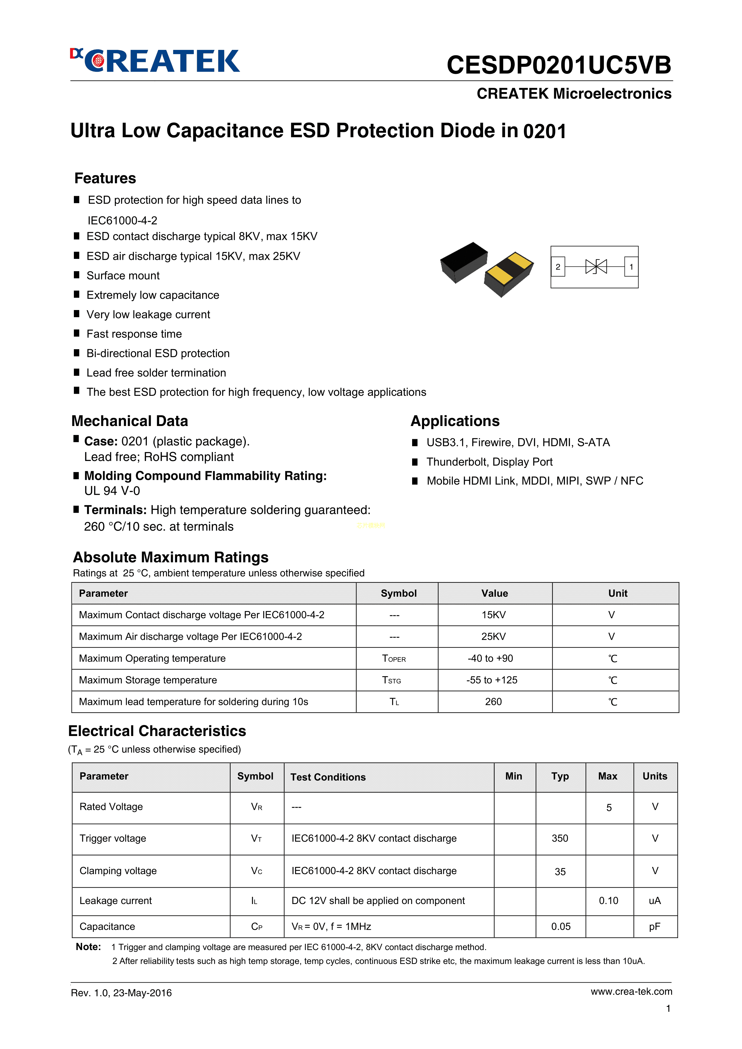 CESDP0201UC5VB数据手册0201封装CREATEK(达晶微)PDF规格书,中英文下载