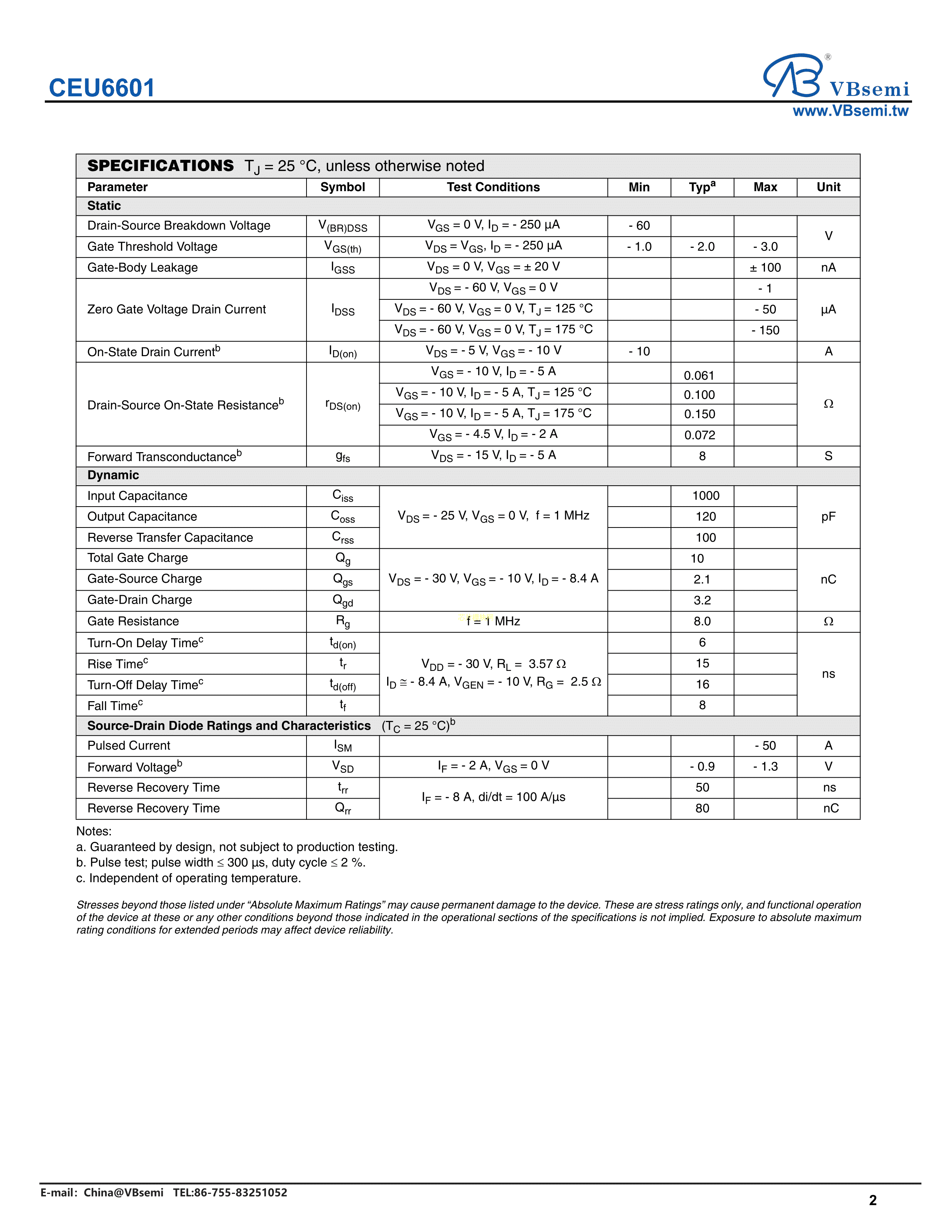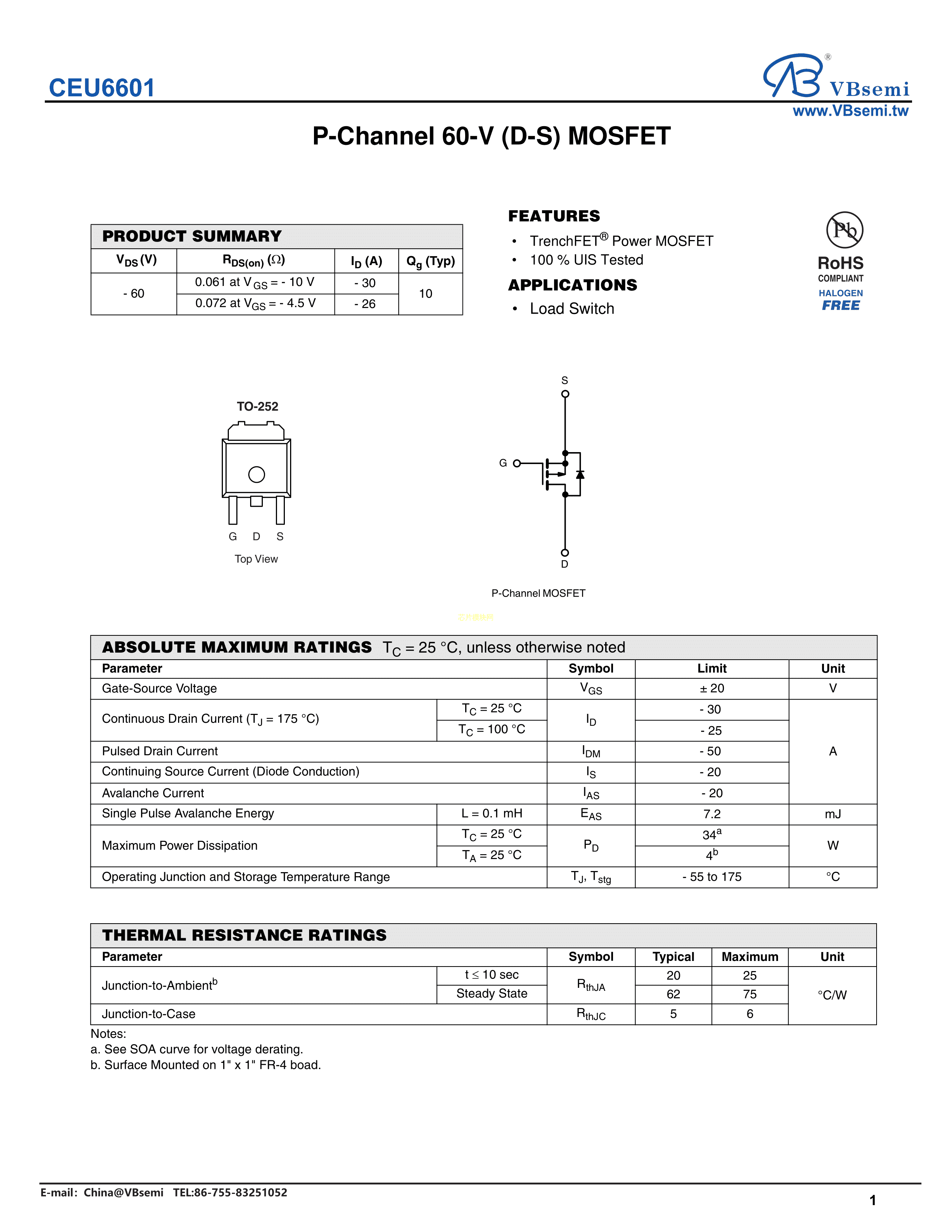 CEU6601数据手册TO-252封装VBsemi(台湾微碧)PDF规格书,中英文下载