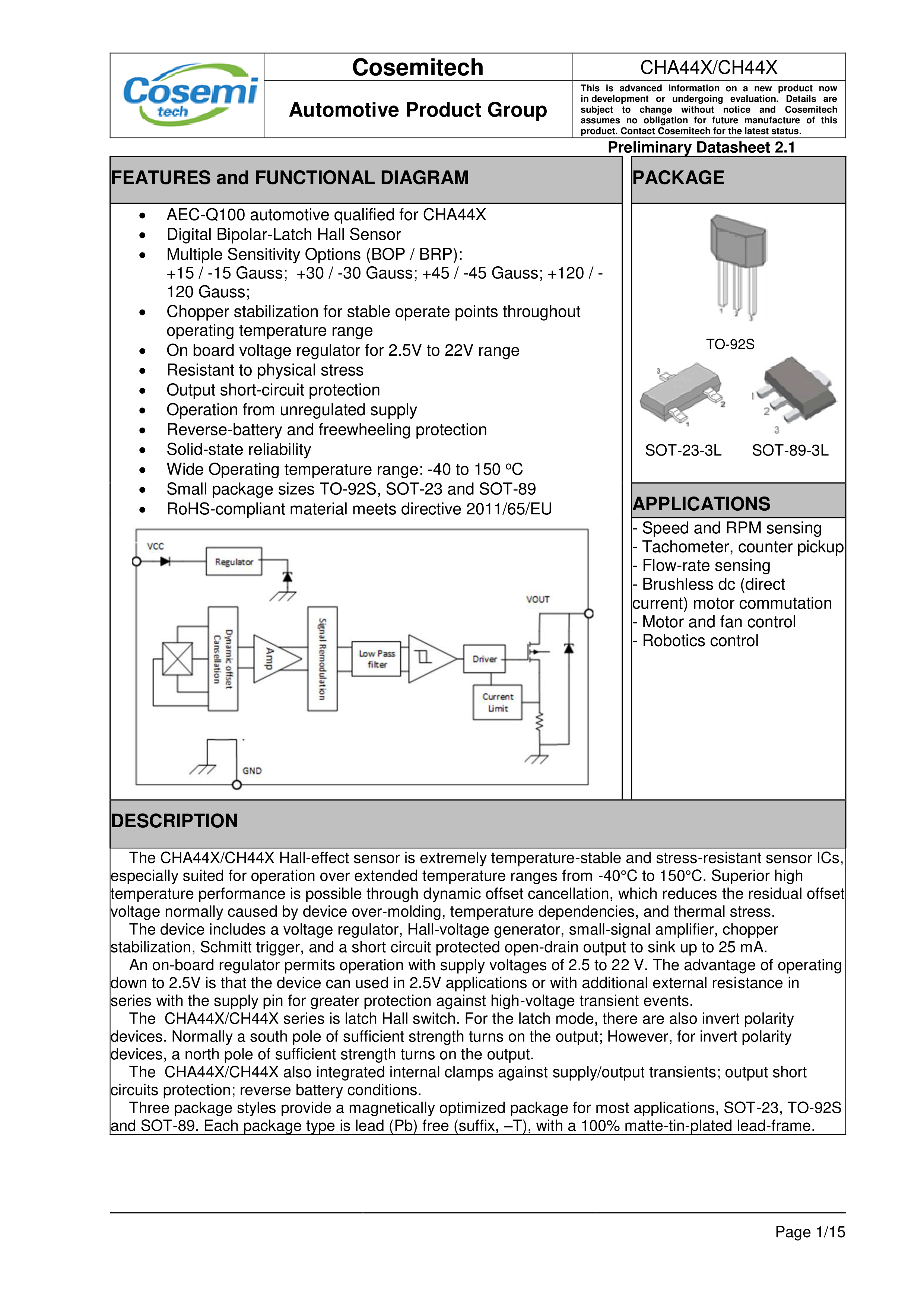 CHA444SR数据手册SOT-23-3L封装COSEMITECH(意瑞)PDF规格书,中英文下载