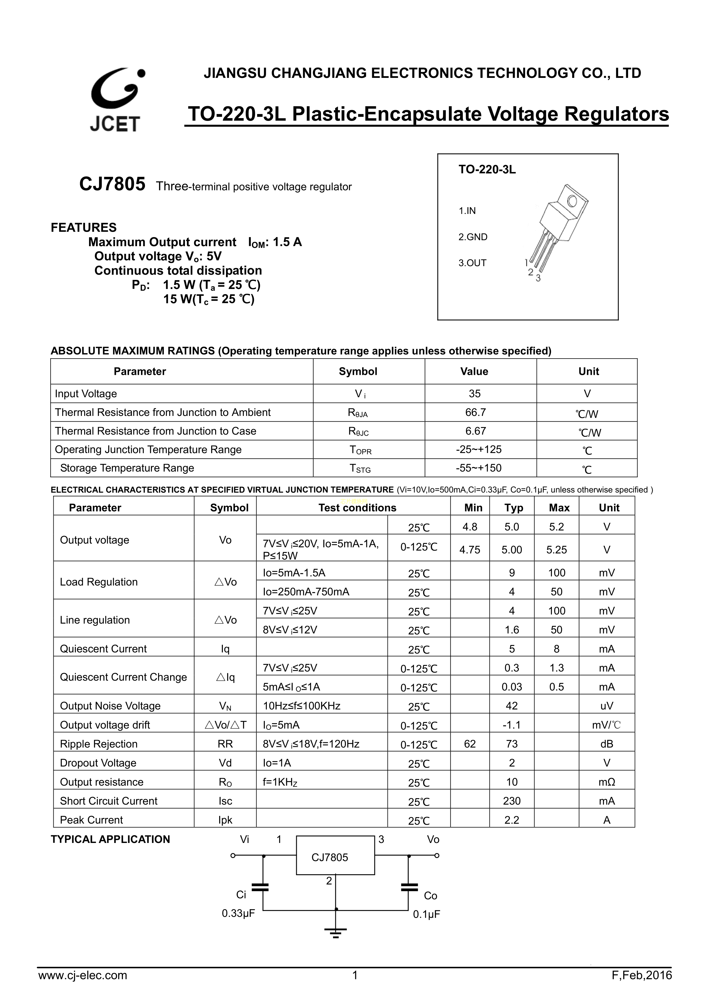 CJ7805数据手册TO-220(TO-220-3)封装CJ(江苏长电-长晶)PDF规格书,中英文下