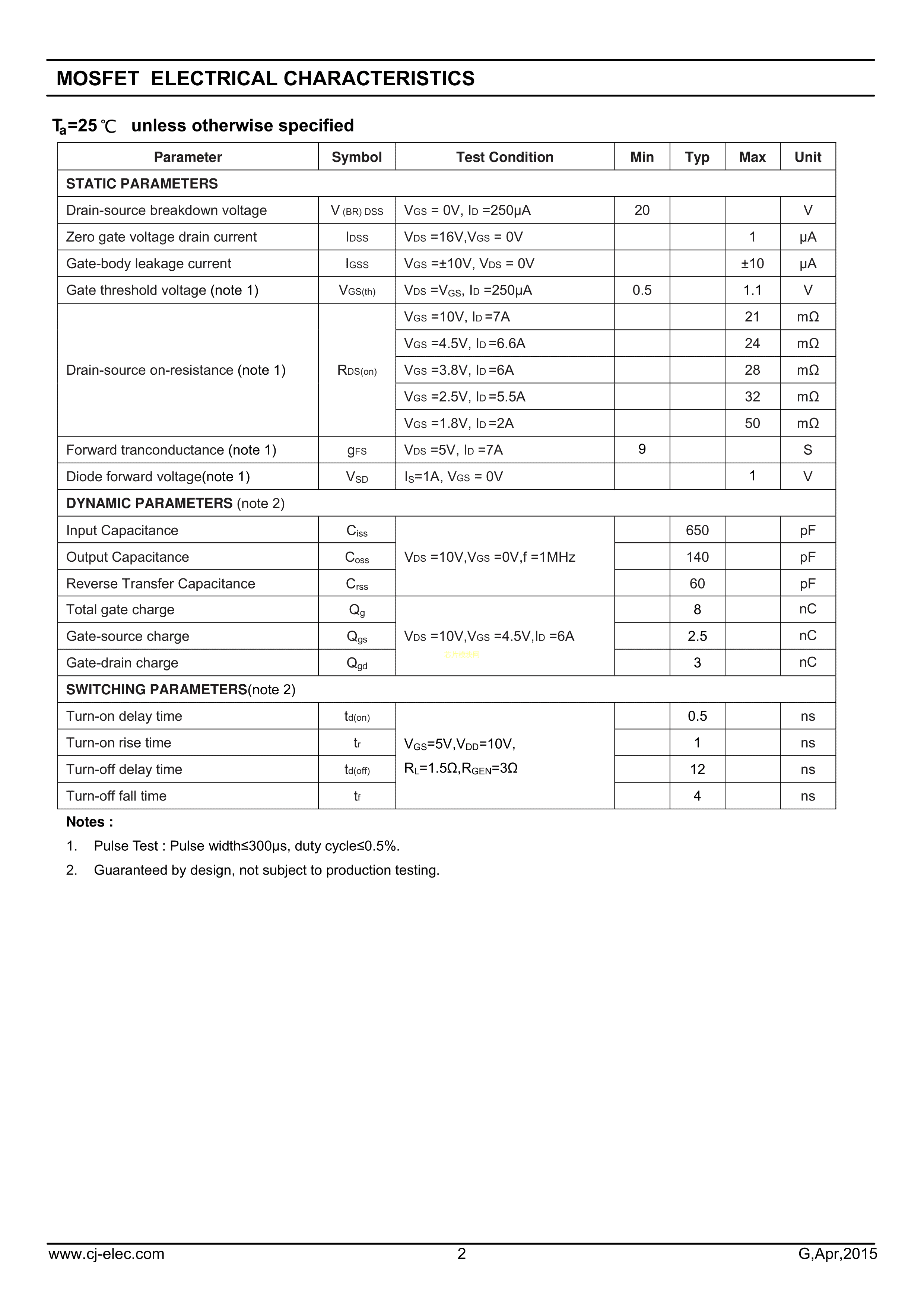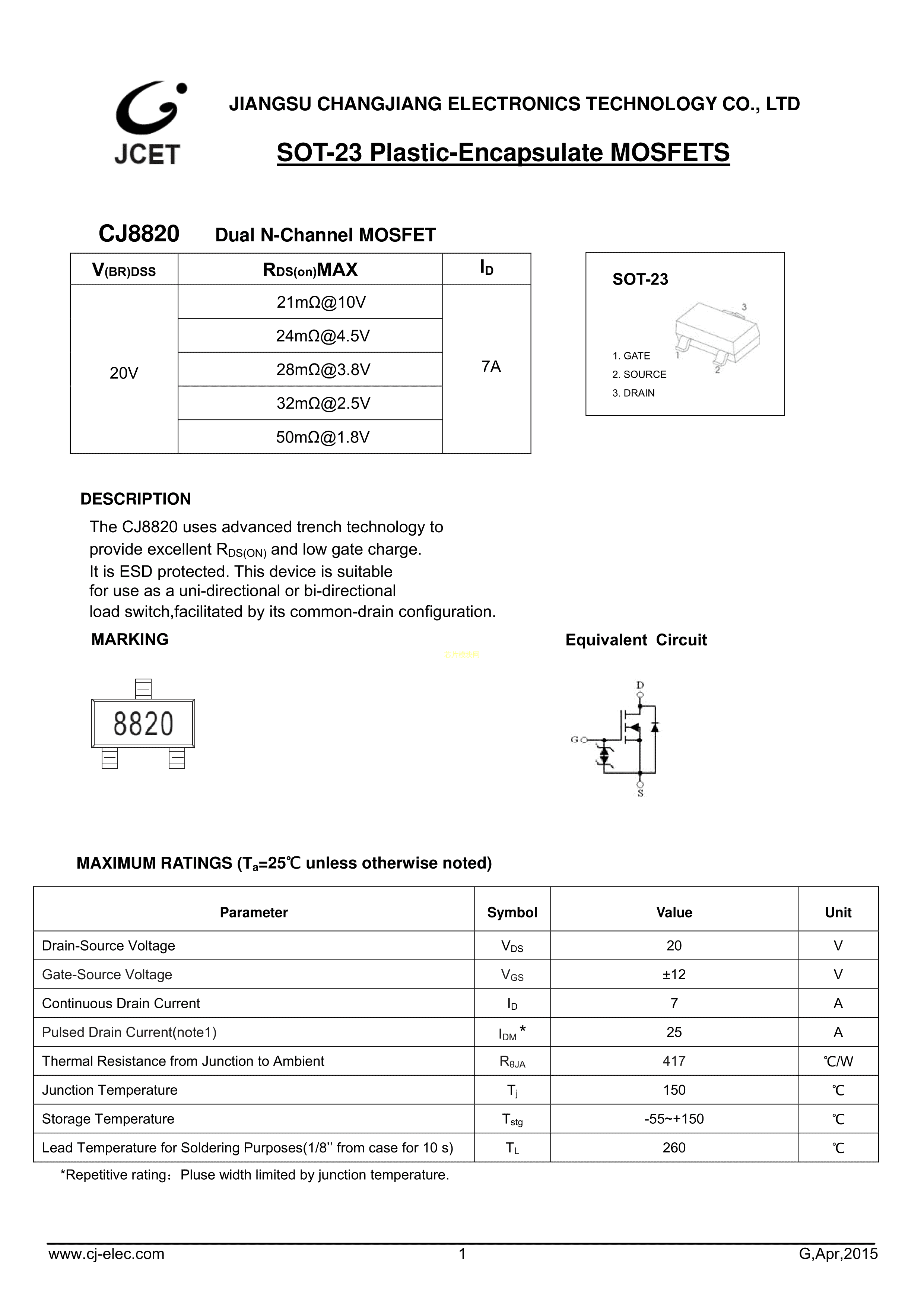 CJ8820数据手册SOT-23(SOT-23-3)封装CJ(江苏长电-长晶)PDF规格书,中英文下