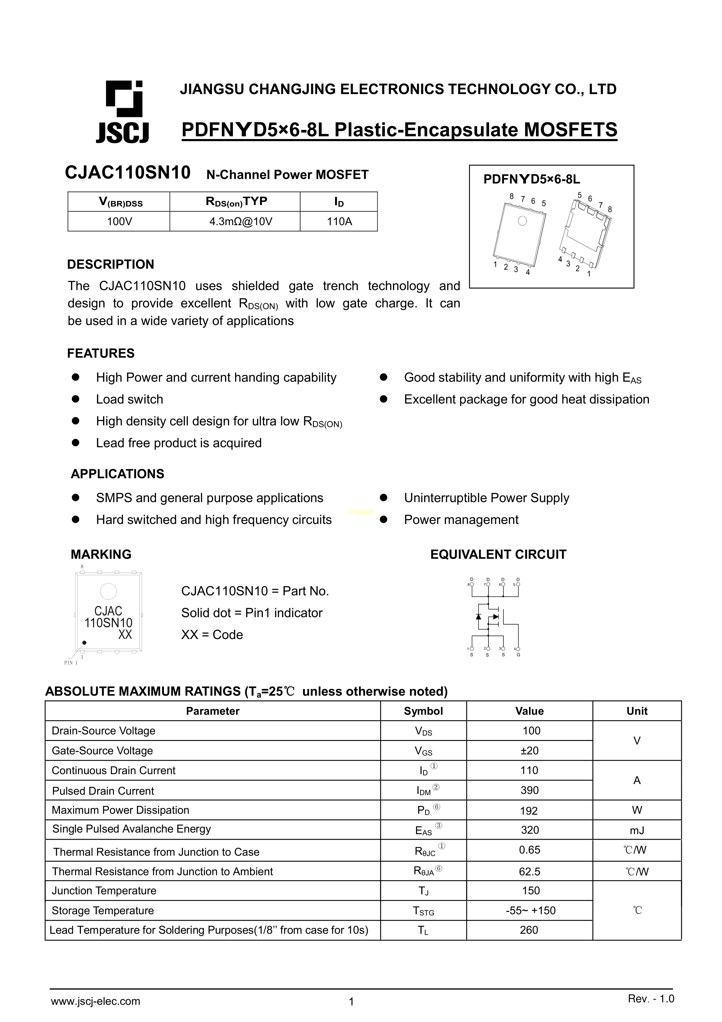 CJAC110SN10数据手册PQFNWB5x6-8L封装CJ(江苏长电-长晶)PDF规格书,中英文下载