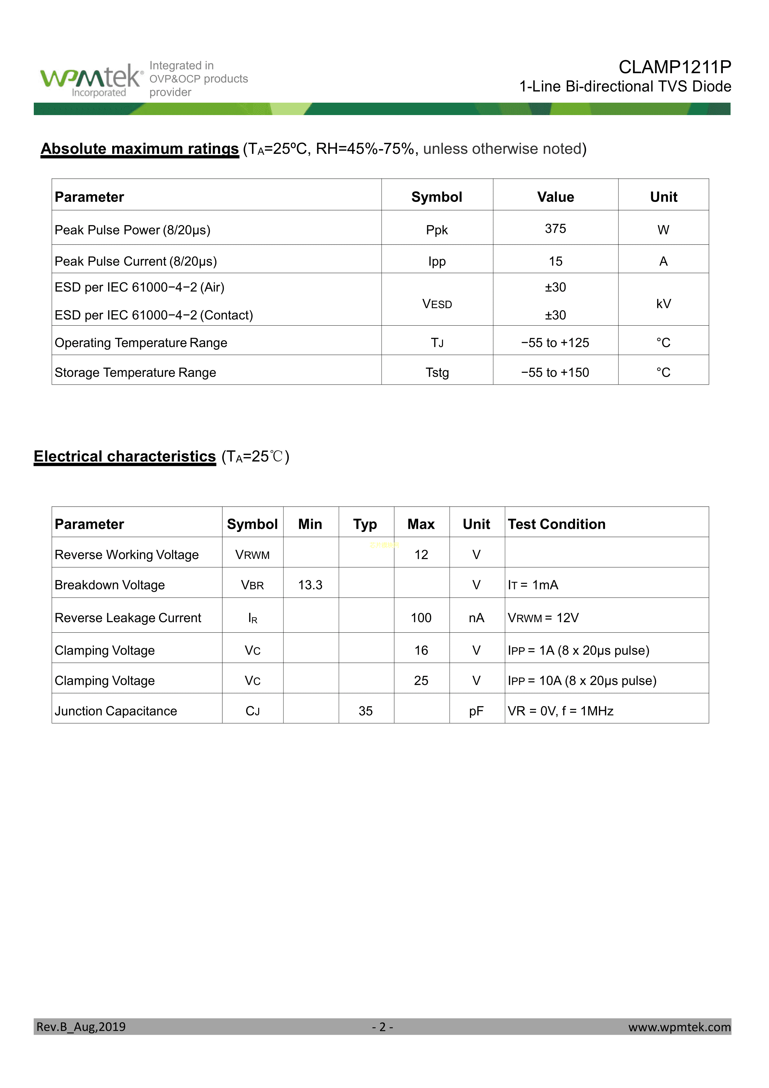 CLAMP1211P数据手册DFN1006-2封装WPMtek(维攀微)PDF规格书,中英文下载