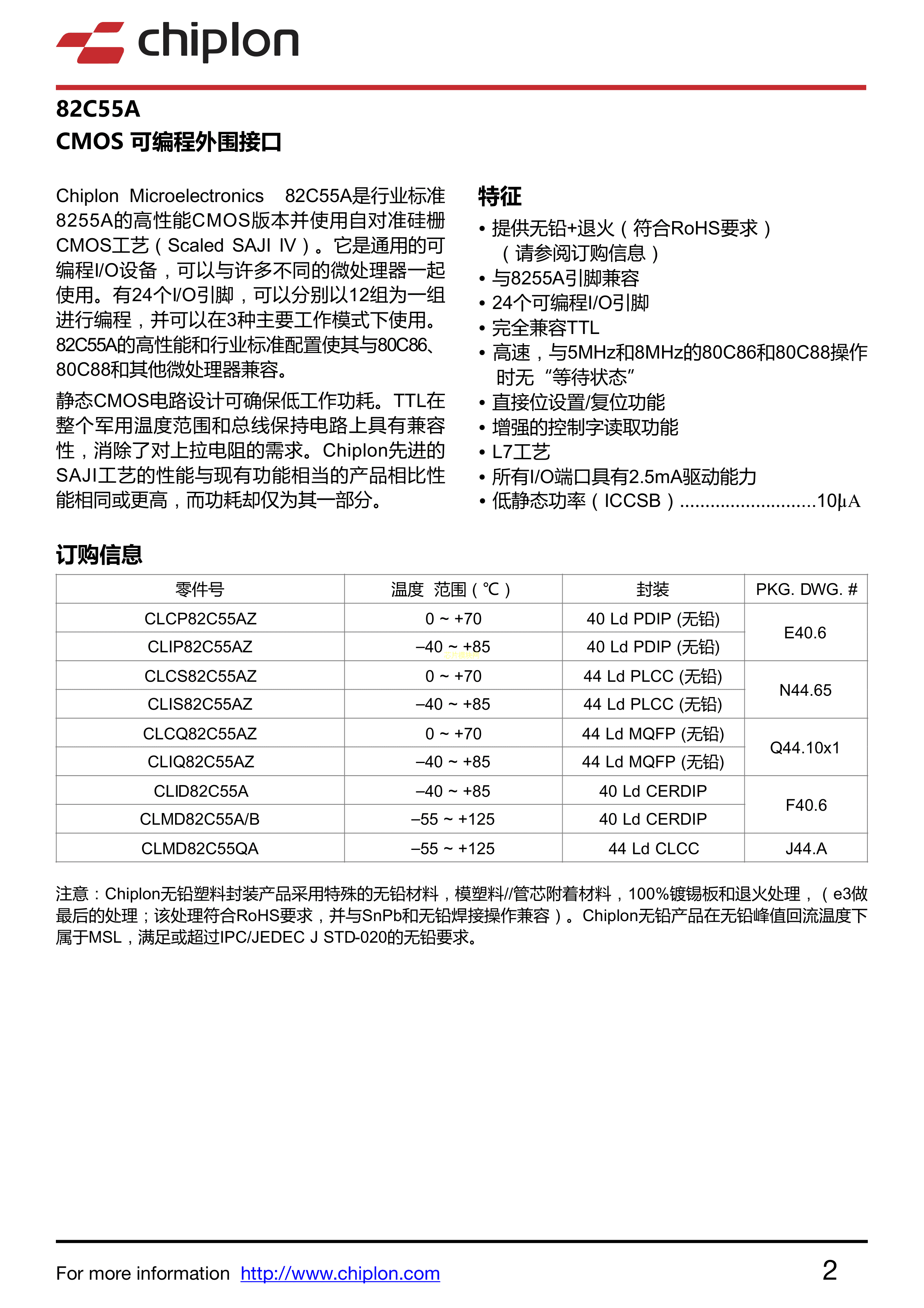 CLIS82C55AZ数据手册PLCC-44封装CHIPLON(启珑)PDF规格书,中英文下载