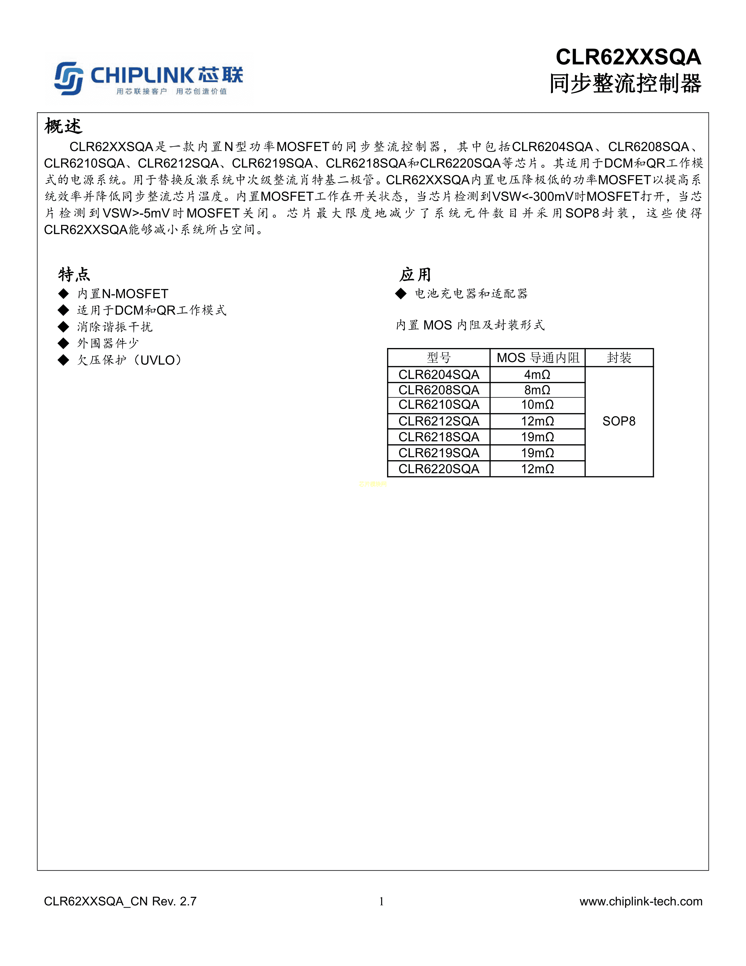 CLR6219SQA数据手册SOP-8封装CHIPLINK(芯联)PDF规格书,中英文下载